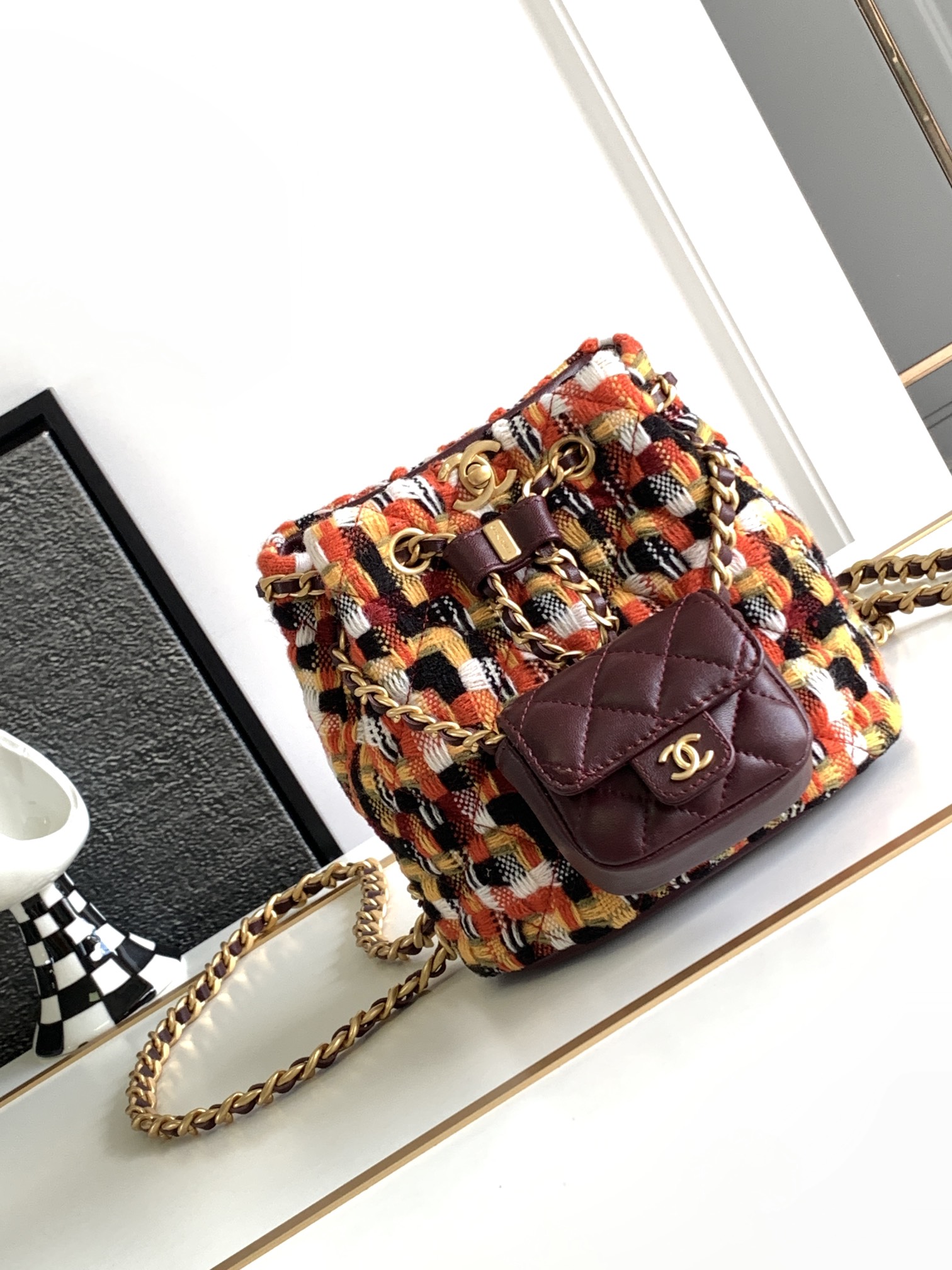 Chanel AS3947 Small Backpack Wool Tweed Lambski with Gold-Tone Metal Orange-Black-White – Multicolor