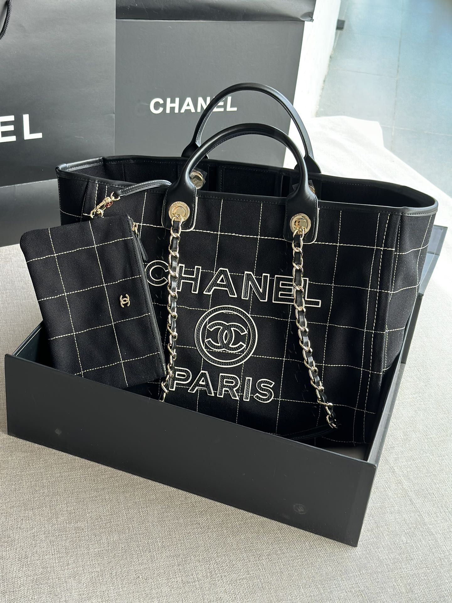 Chanel A93786 Maxi Shopping Bag Cotton Calfskin Gold-Tone Metal Black