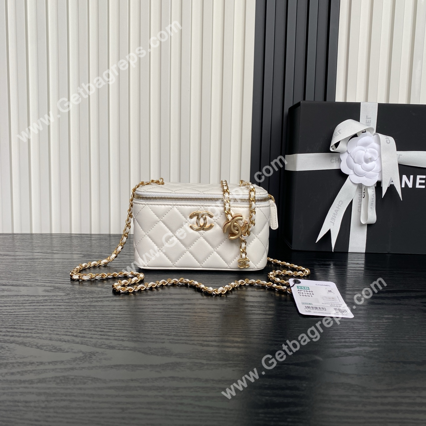 Chanel AP3940 White Shiny Lambskin Vanity Bag Gold-Tone Metal