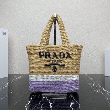 Prada 1BG422 Small Raffia Tote Bag Tan and Purple and White