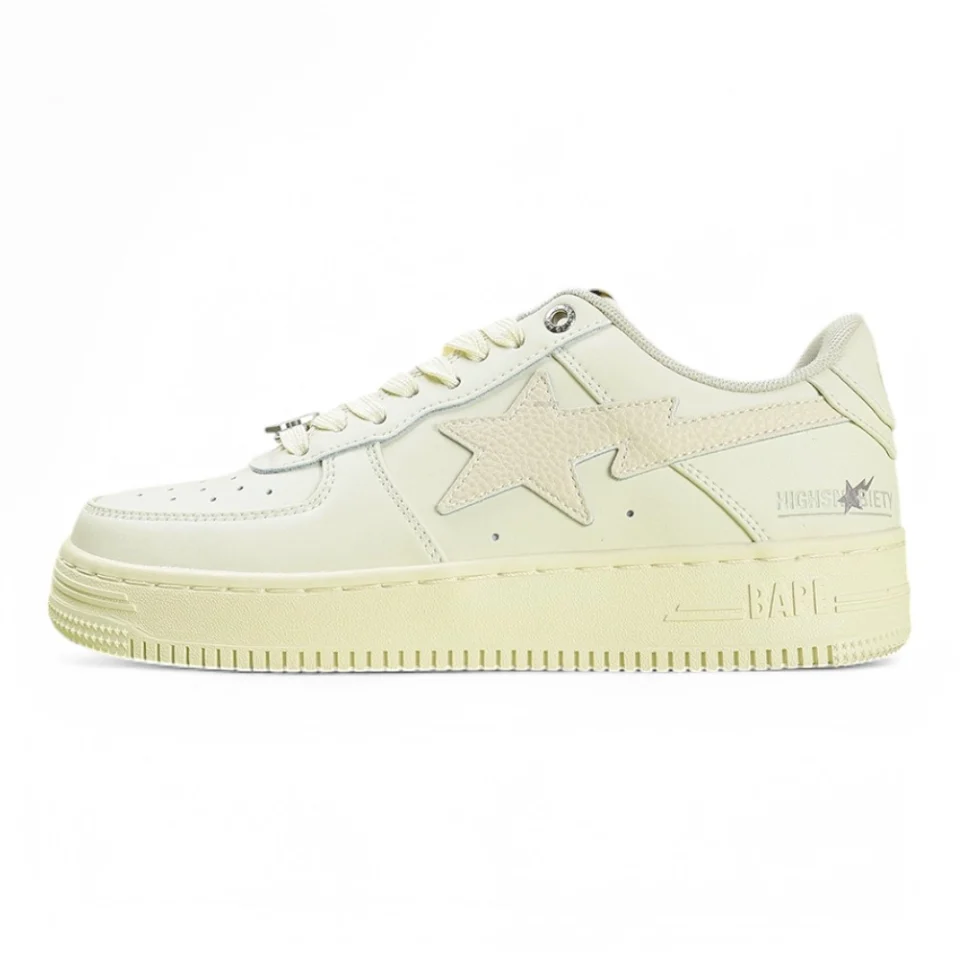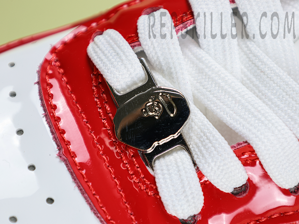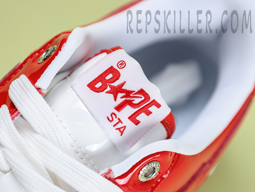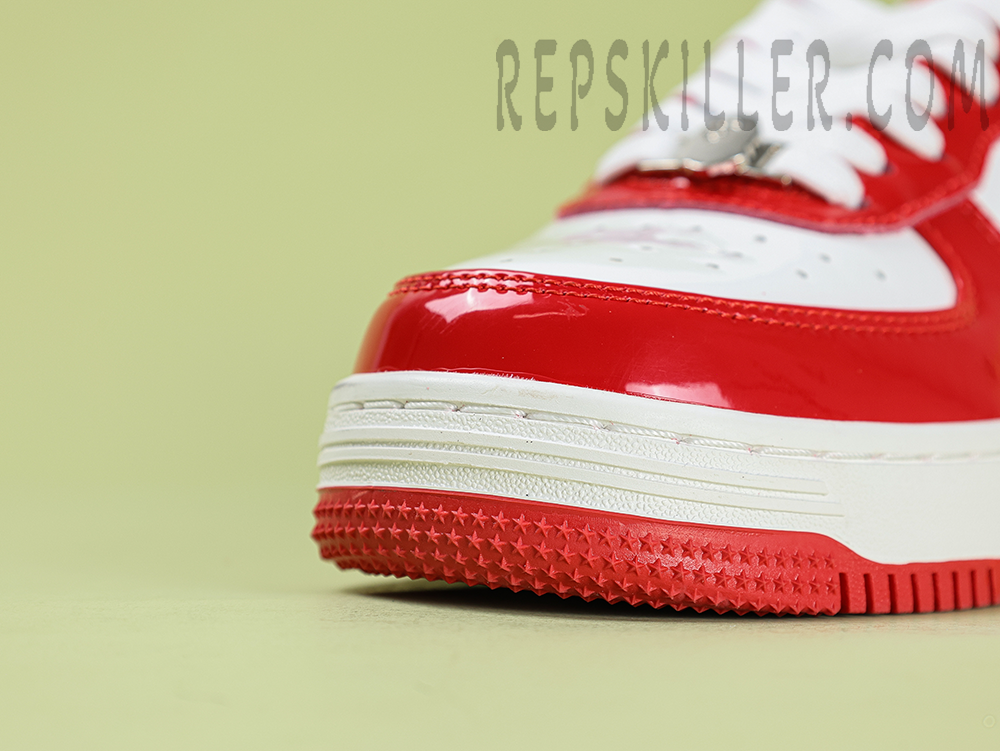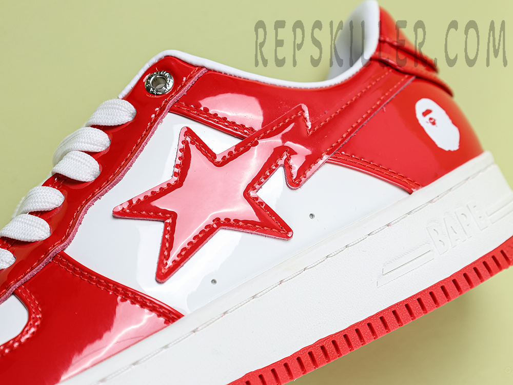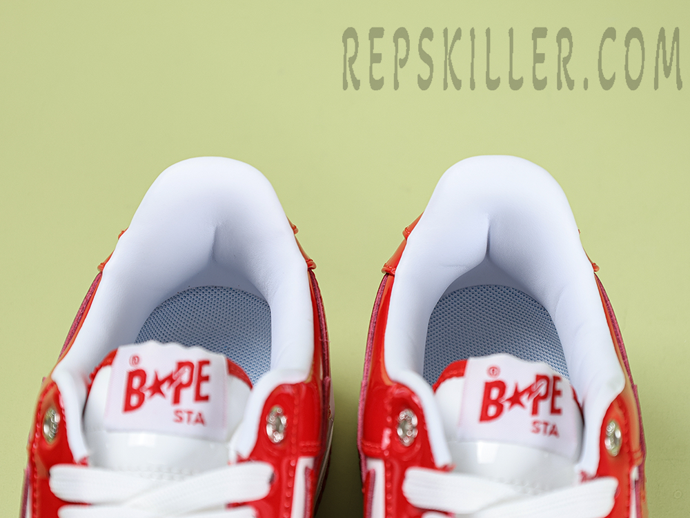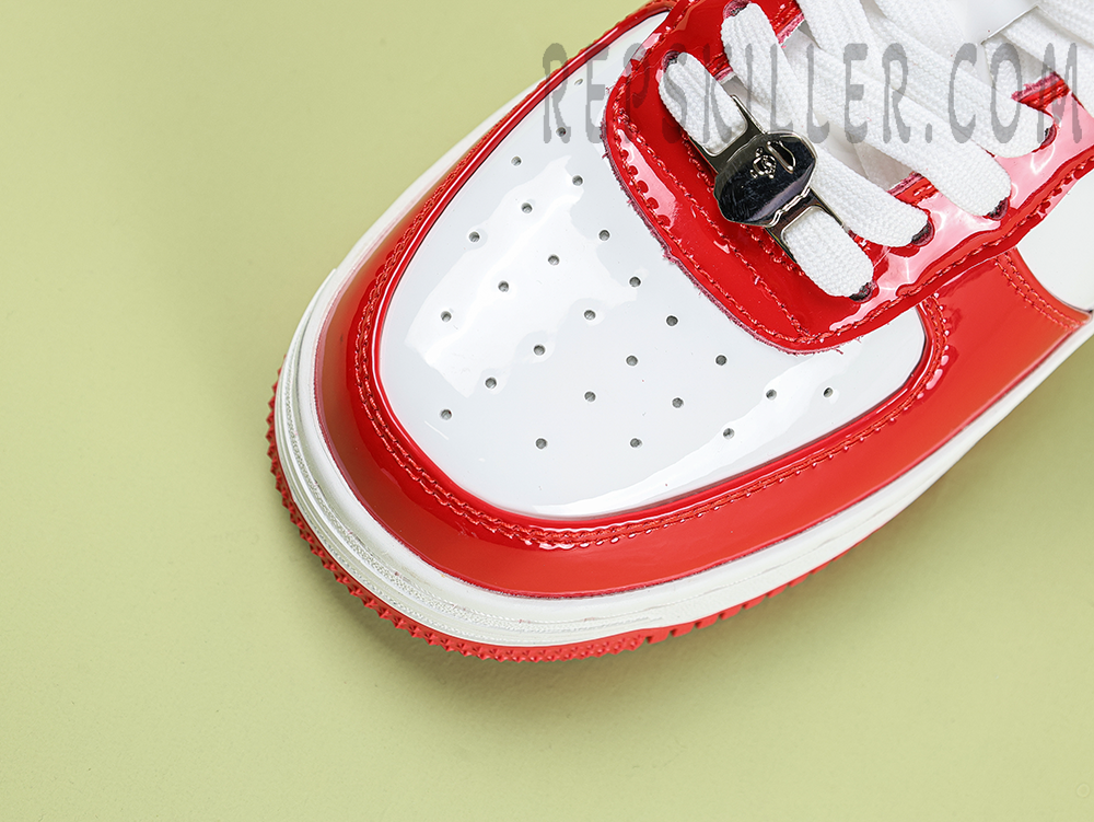 A BATHING APE BapeSta Red White Patent Leather Low Sneakers bring a bold contrast with their glossy red overlays and crisp white base. The signature star logo and patent leather construction reflect the brand’s streetwear heritage while delivering a polished, standout look for any sneaker rotation.