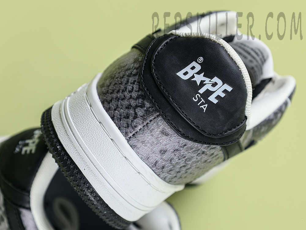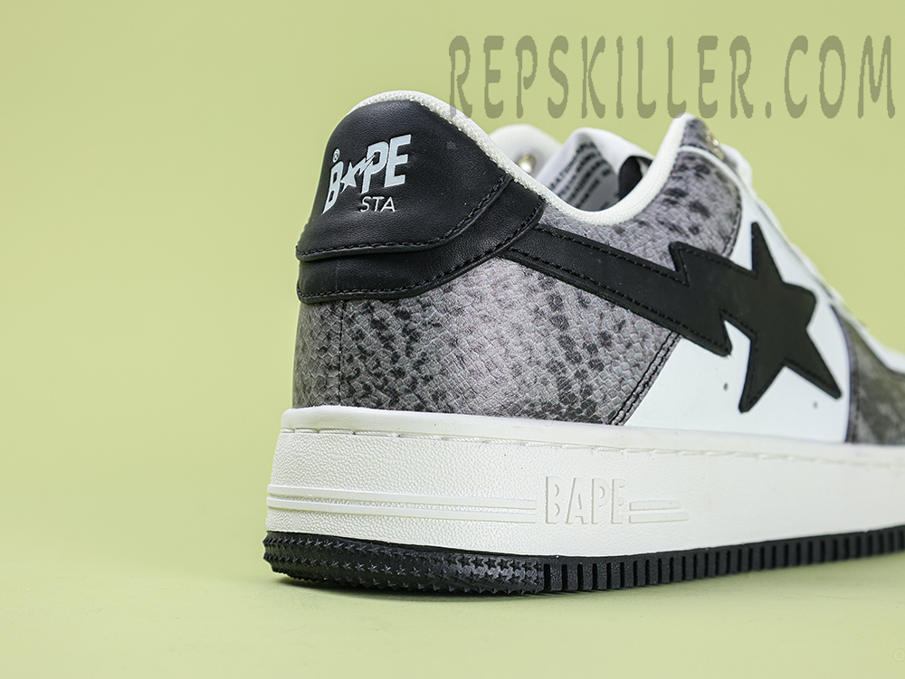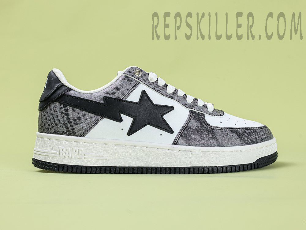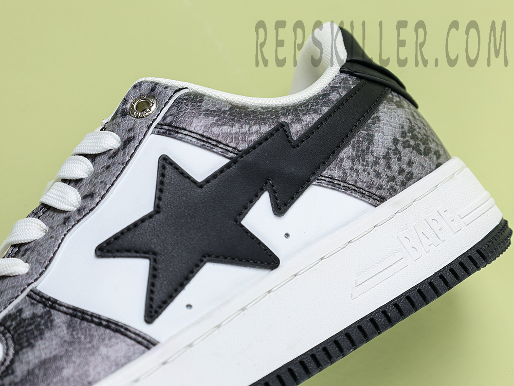 A BATHING APE BapeSta Snakeskin Black Low Sneakers merge a dark, edgy aesthetic with refined streetwear DNA. The textured faux snakeskin upper in deep black adds a bold dimension, complemented by the crisp white sole and iconic star motif. Designed for those who prefer their fashion with bite.
