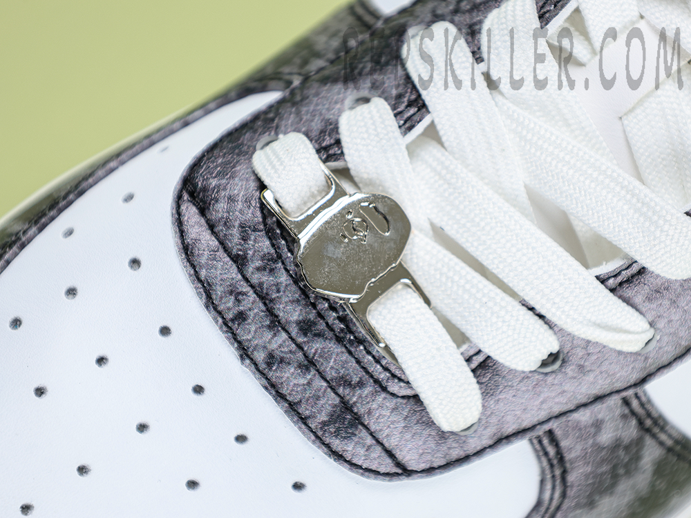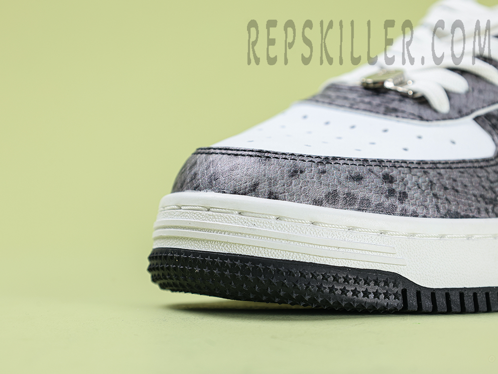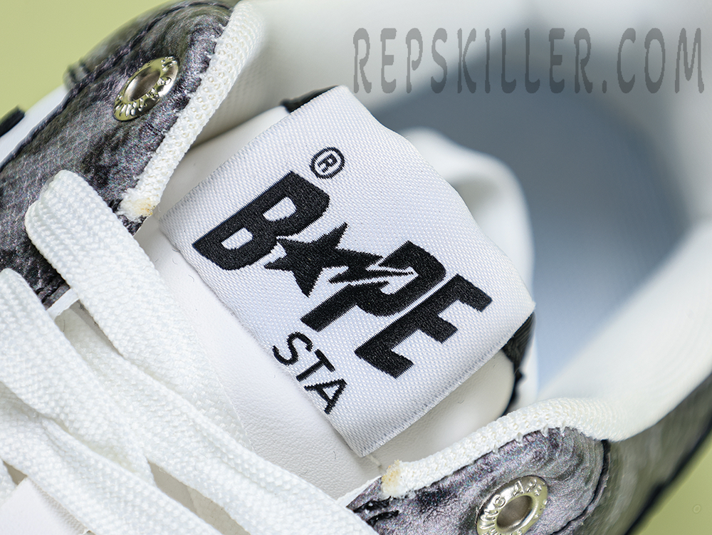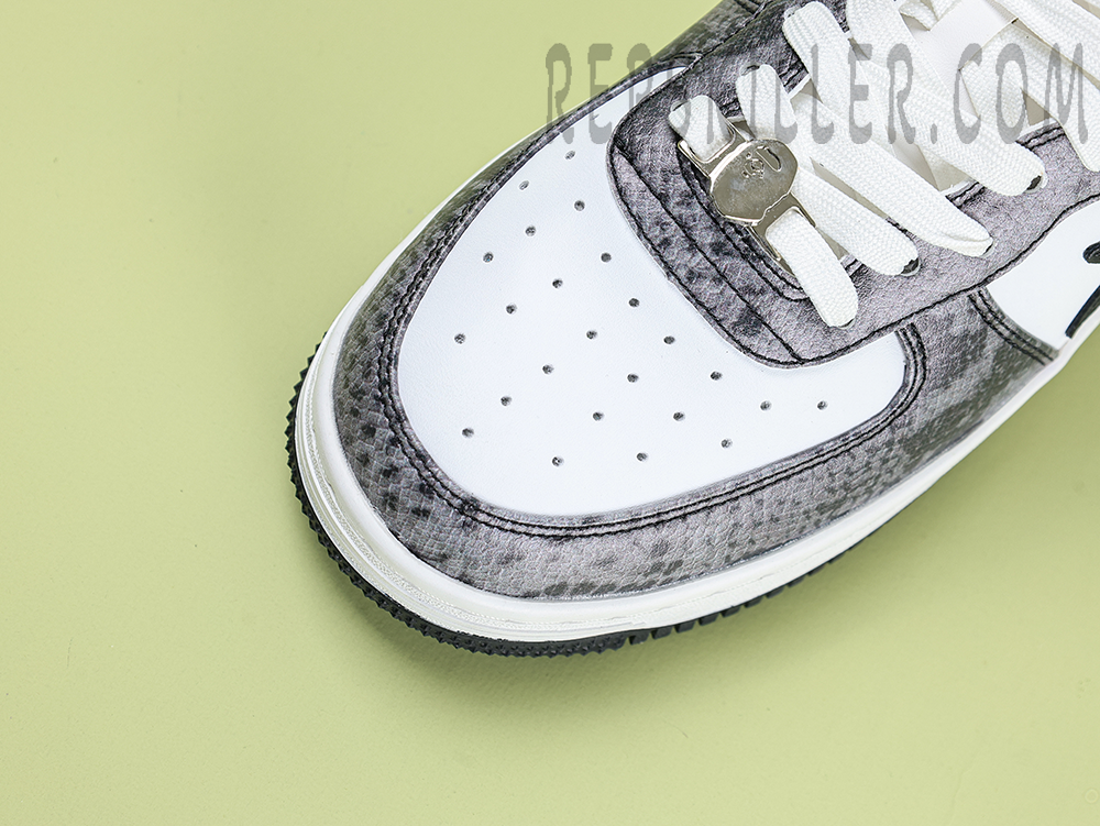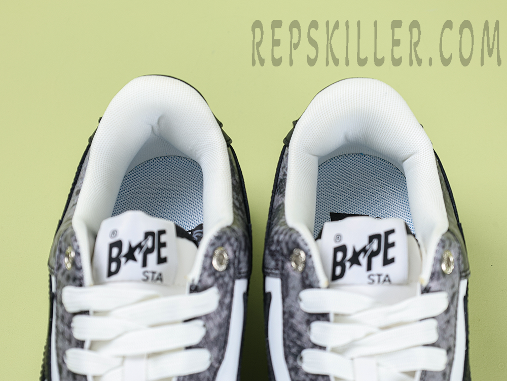 A BATHING APE BapeSta Snakeskin Black Low Sneakers merge a dark, edgy aesthetic with refined streetwear DNA. The textured faux snakeskin upper in deep black adds a bold dimension, complemented by the crisp white sole and iconic star motif. Designed for those who prefer their fashion with bite.