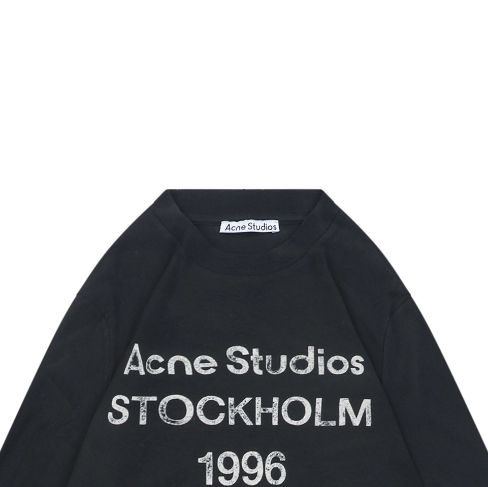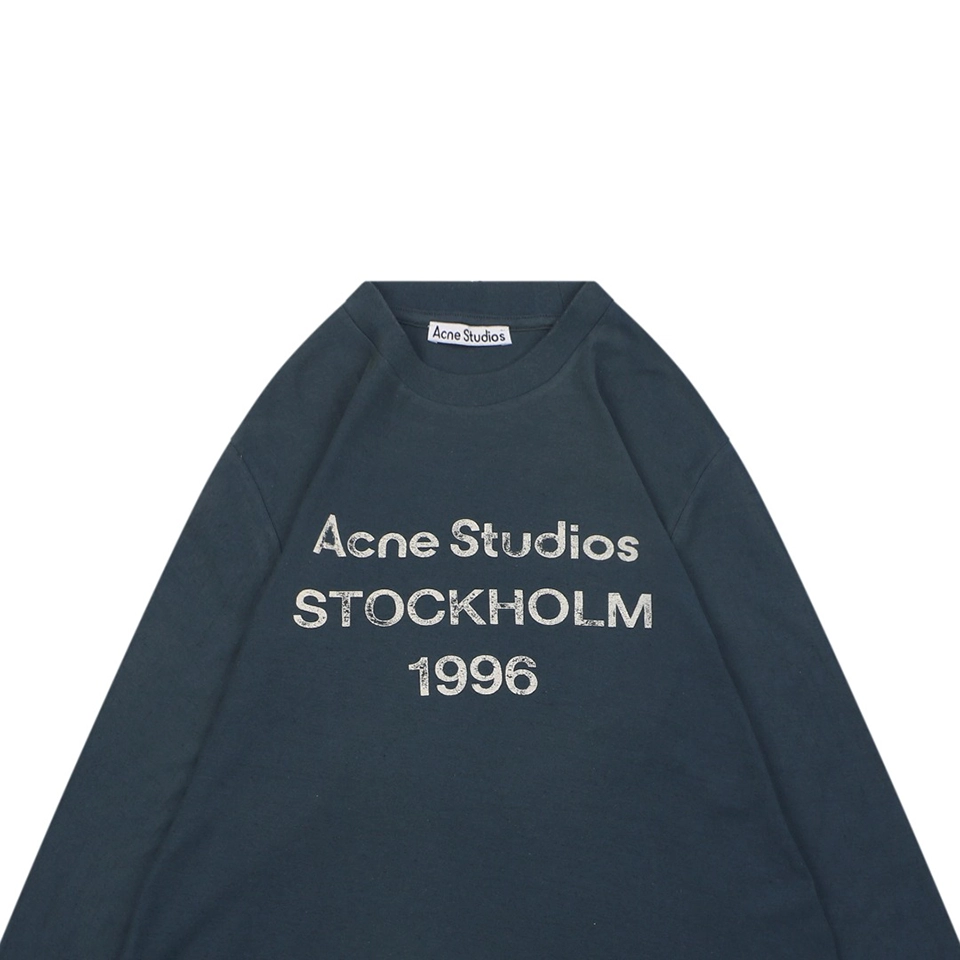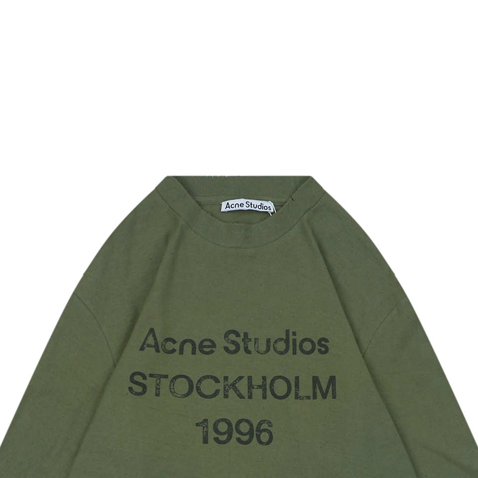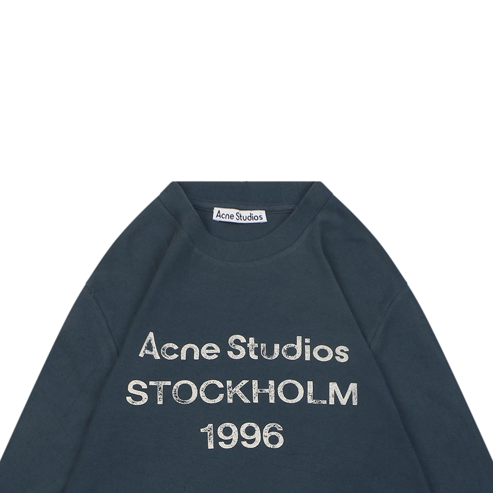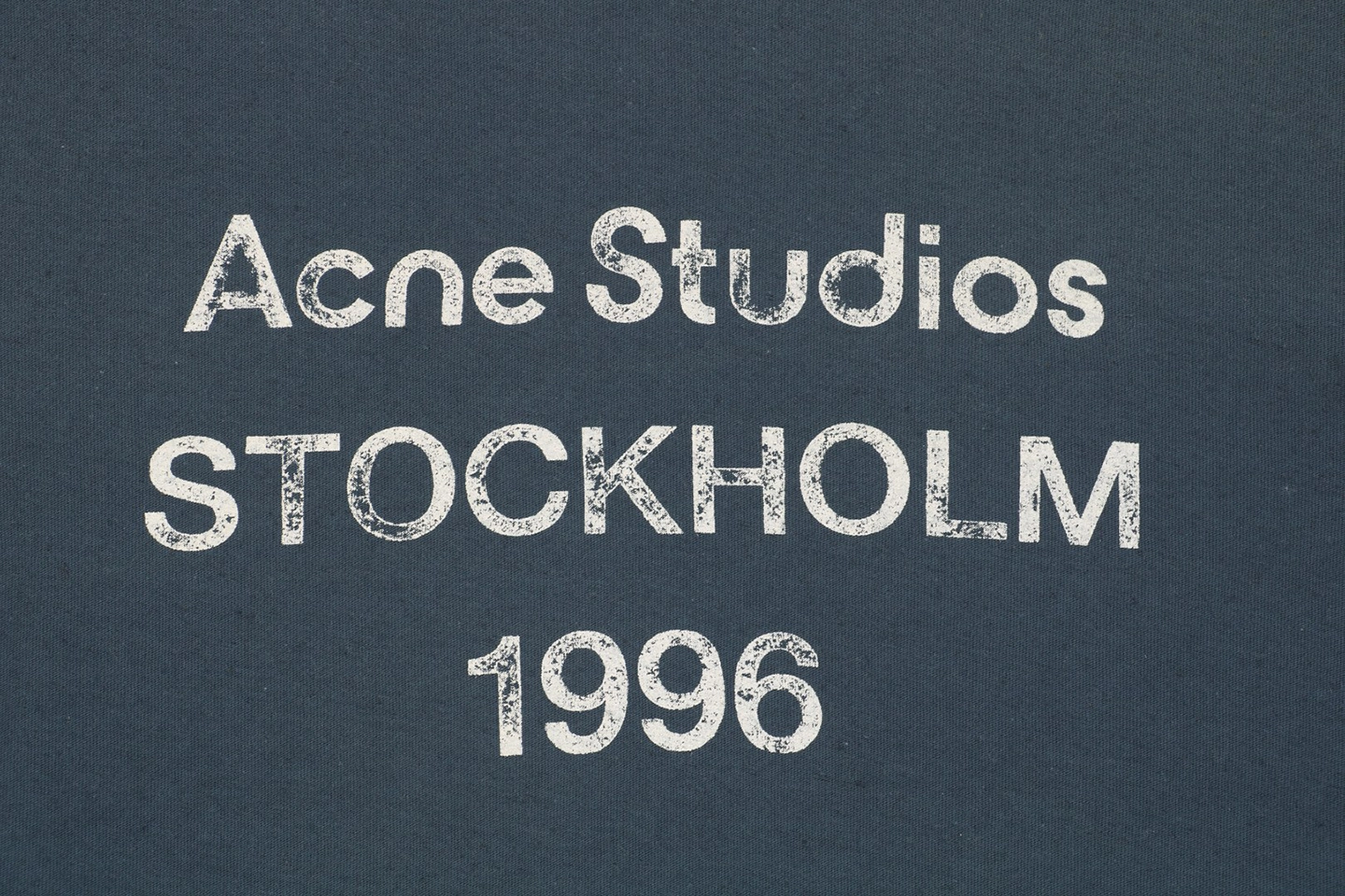 The Acne Studios 1996 Distressed Logo Shirt delivers a minimalist silhouette with a vintage edge. Crafted from soft cotton in a relaxed fit, this piece features a crew neckline and elongated sleeves for everyday comfort. Across the chest, the cracked-effect “Acne Studios Stockholm 1996” print brings a worn-in character that nods to the brand’s roots in contemporary Scandinavian design. Available in versatile shades of navy, black, and army green, it embodies understated street luxury.