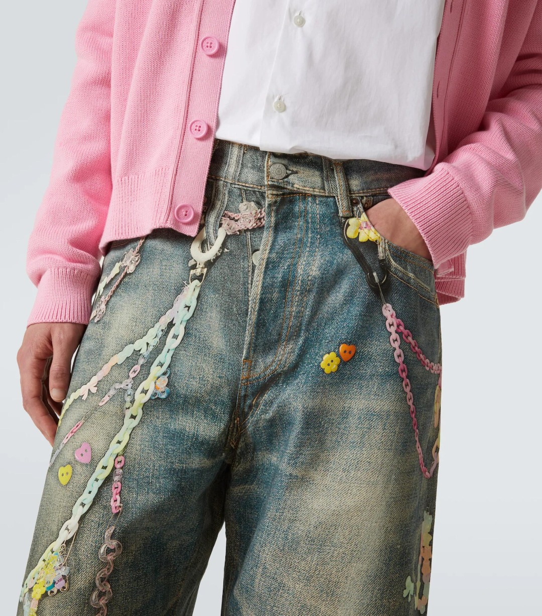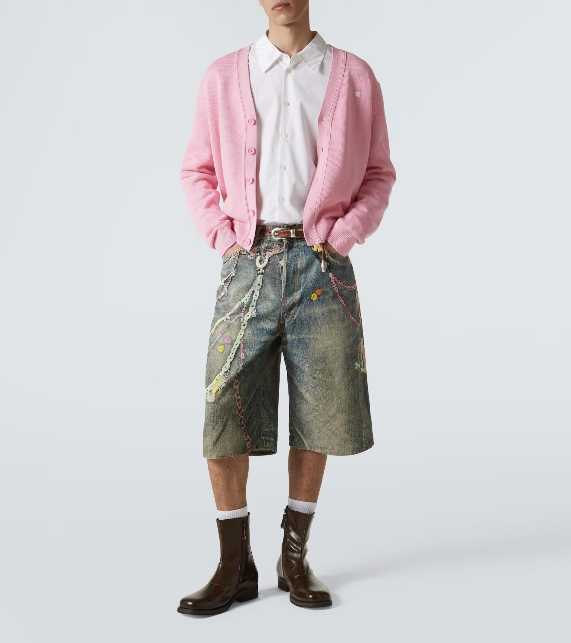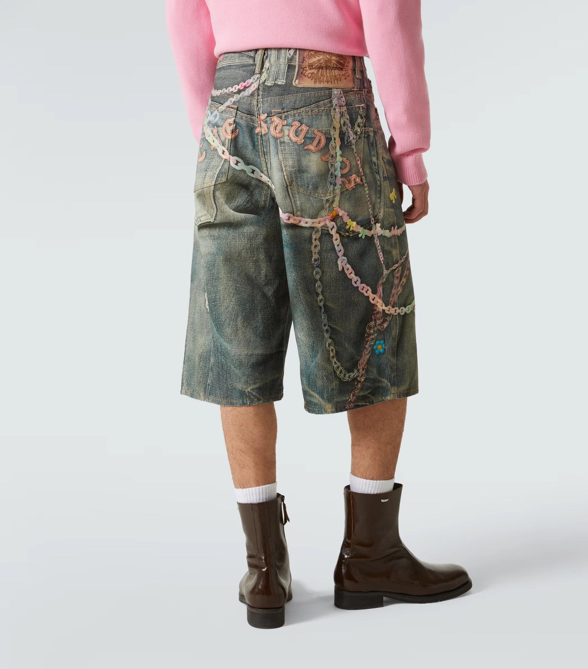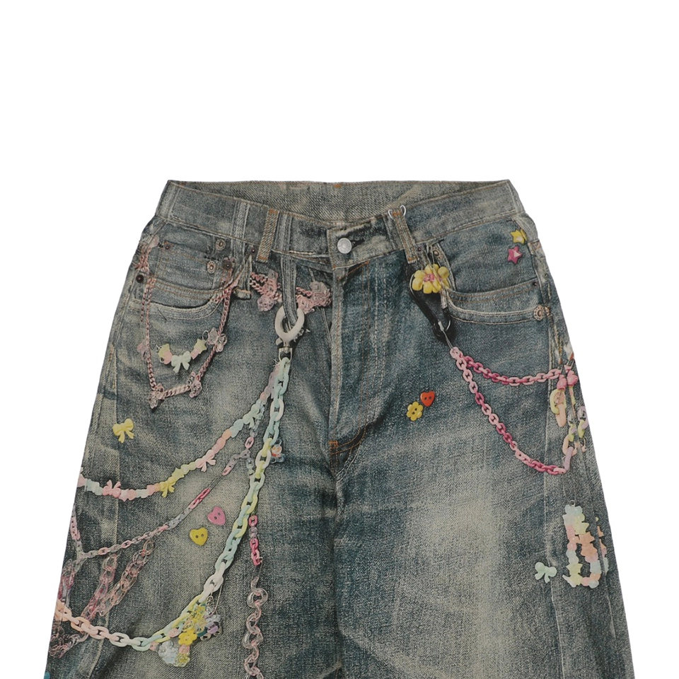 Acne Studios Candy Chain Cropped Denim Shorts bring playful charm and edgy style together through colorful candy-inspired chain accents that hang from the waistband or sides. The decorative chains add a sweet pop of color, contrasted by the vintage-washed denim for a look that’s both rebellious and whimsical. Cut to a cropped 3/4 length, these shorts reveal the lower leg and elevate layered styling. Durable yet comfortable, they’re ideal for those seeking standout streetwear with a twist.