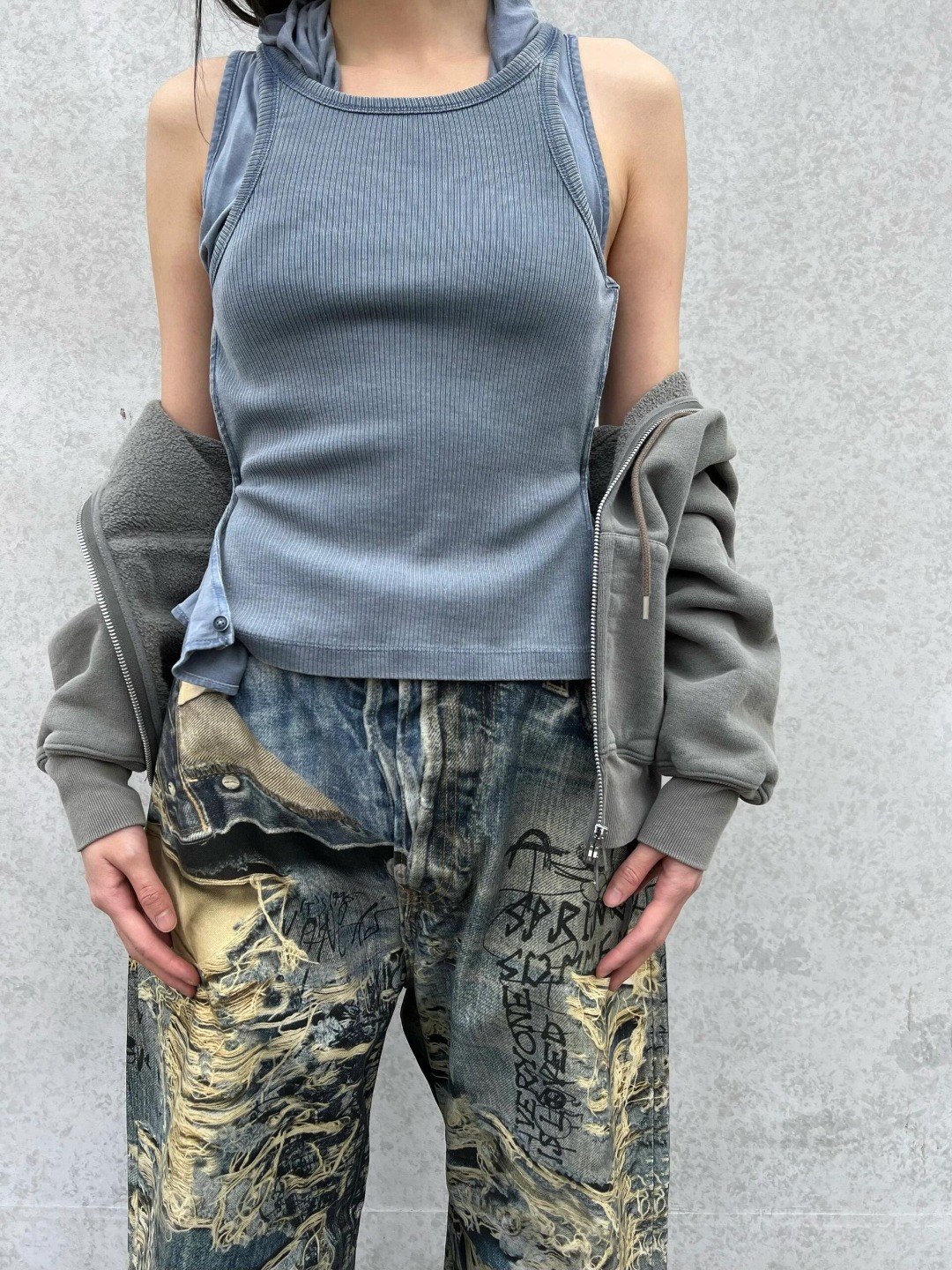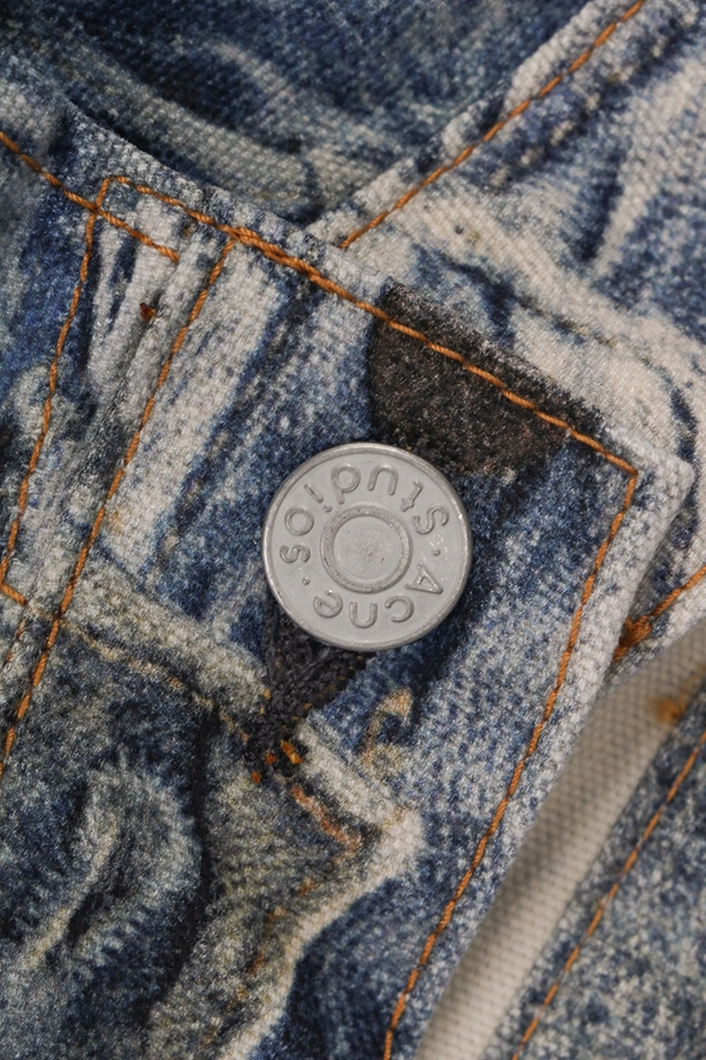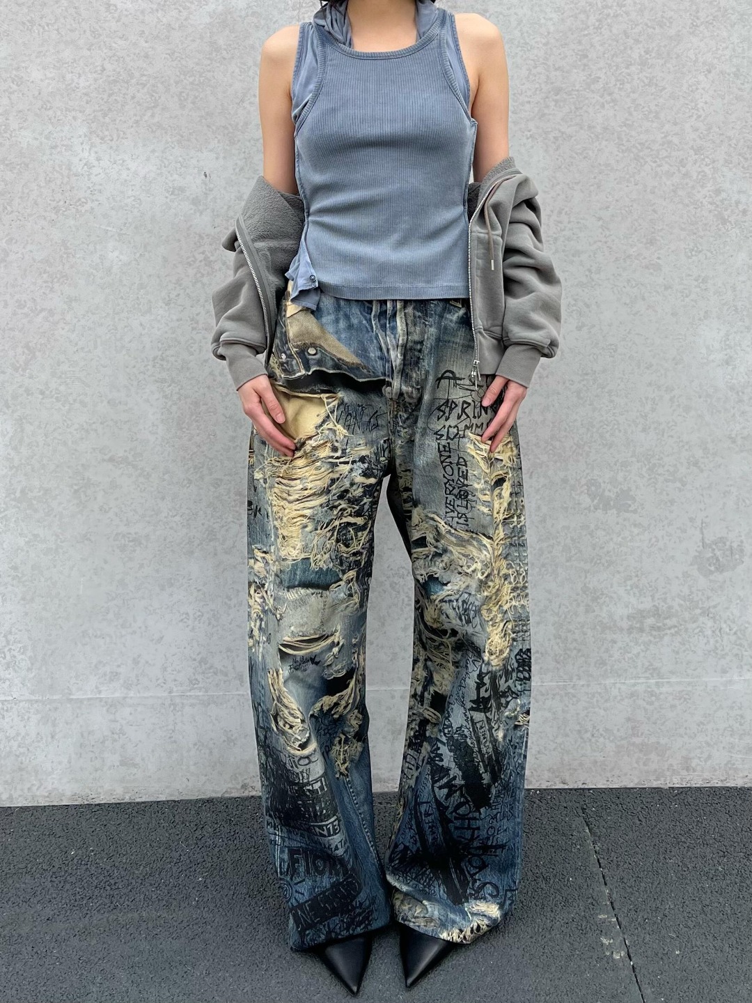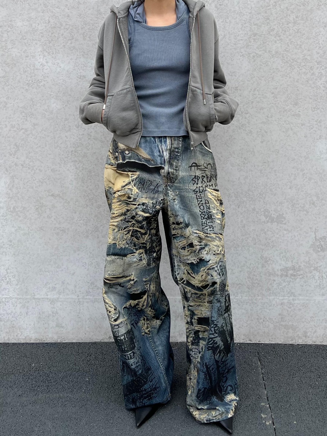 Crafted from premium blue-washed denim, the Acne Studios Distressed Graffiti-Print Wide-Leg Denim Pants showcase a bold mix of heavy distressing and all-over graffiti-style prints. The exaggerated wear patterns across the legs evoke a raw, deconstructed aesthetic, while the wide-leg silhouette delivers streetwear edge. Subtle branding on the leather patch adds a signature finish.