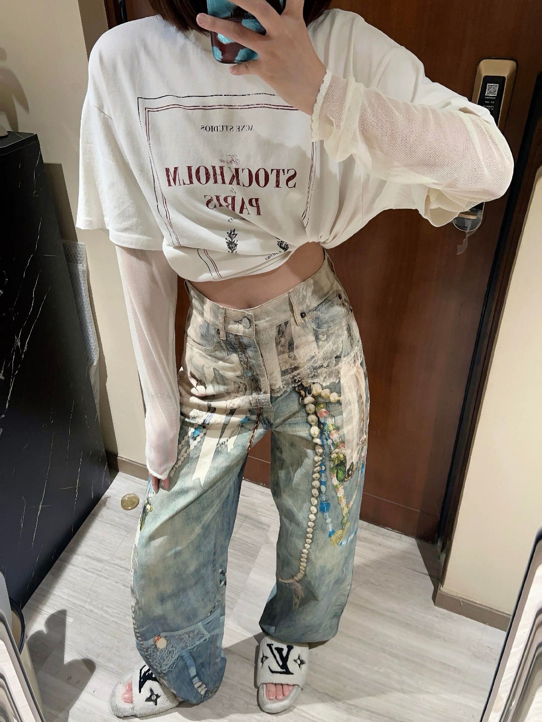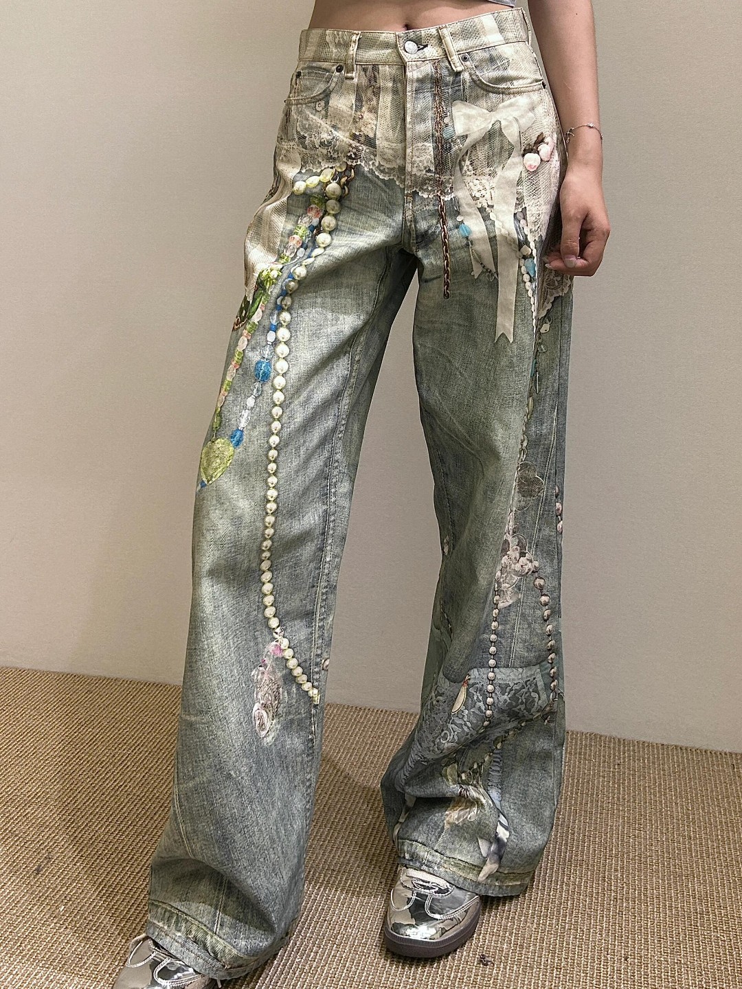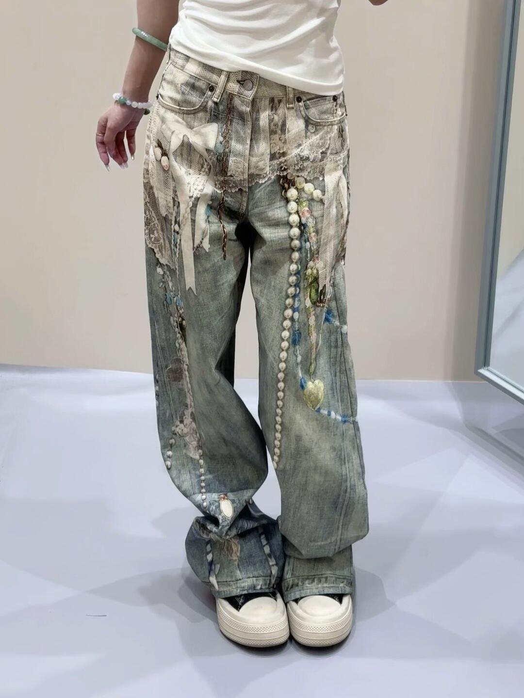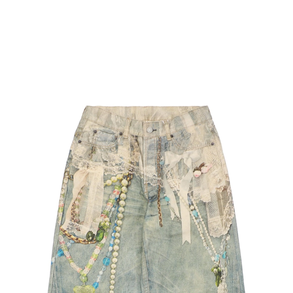 Acne Studios Lace and Pearl Printed Denim Pants bring a romantic twist to rugged streetwear. This wide-leg silhouette features intricate trompe-l’œil prints of lace trims, beaded chains, and delicate charms, set against a washed light blue denim base. The illusion of embellishment adds visual depth without extra weight, capturing a dreamy, collage-inspired aesthetic unique to the brand’s signature style.
