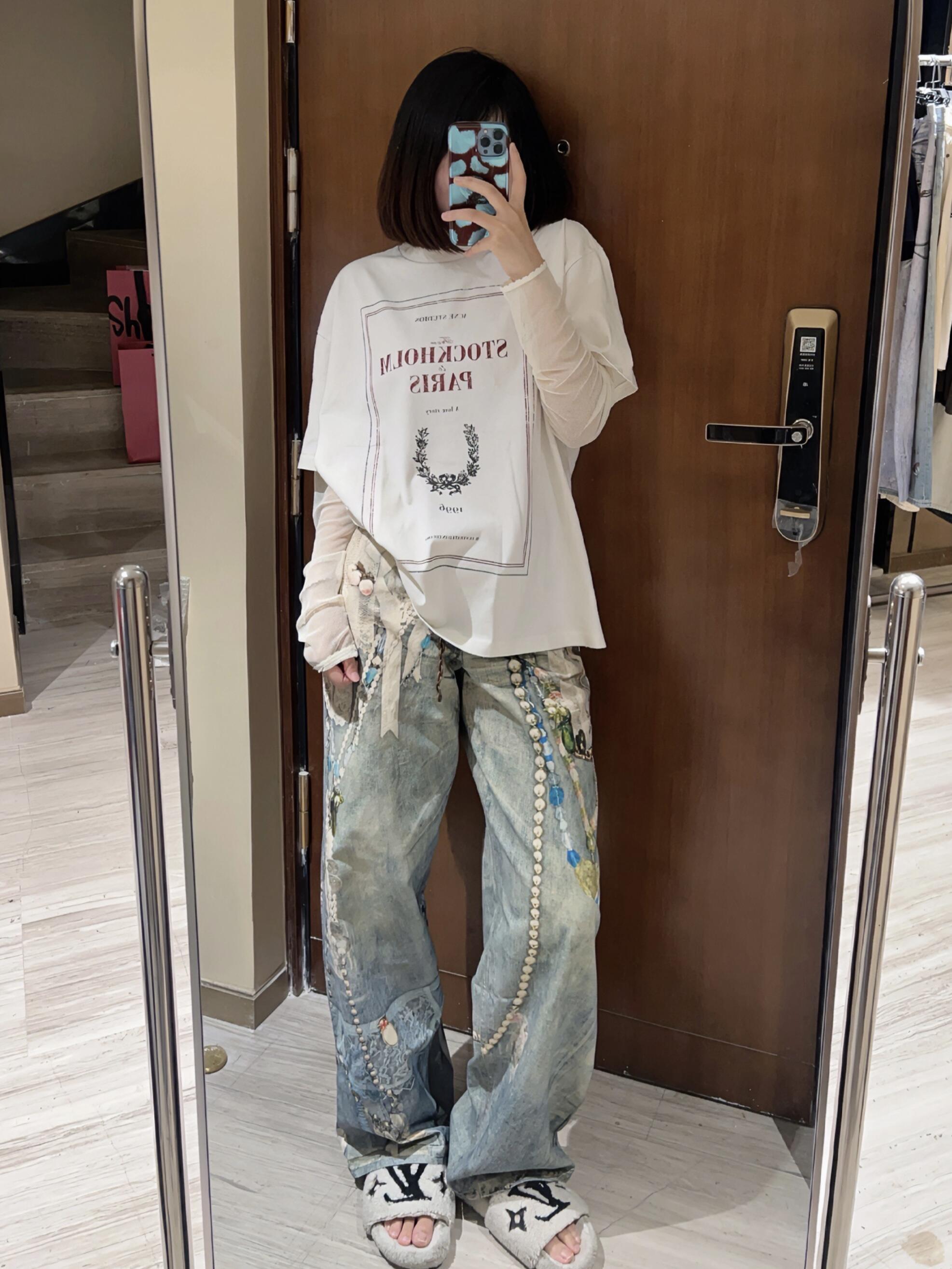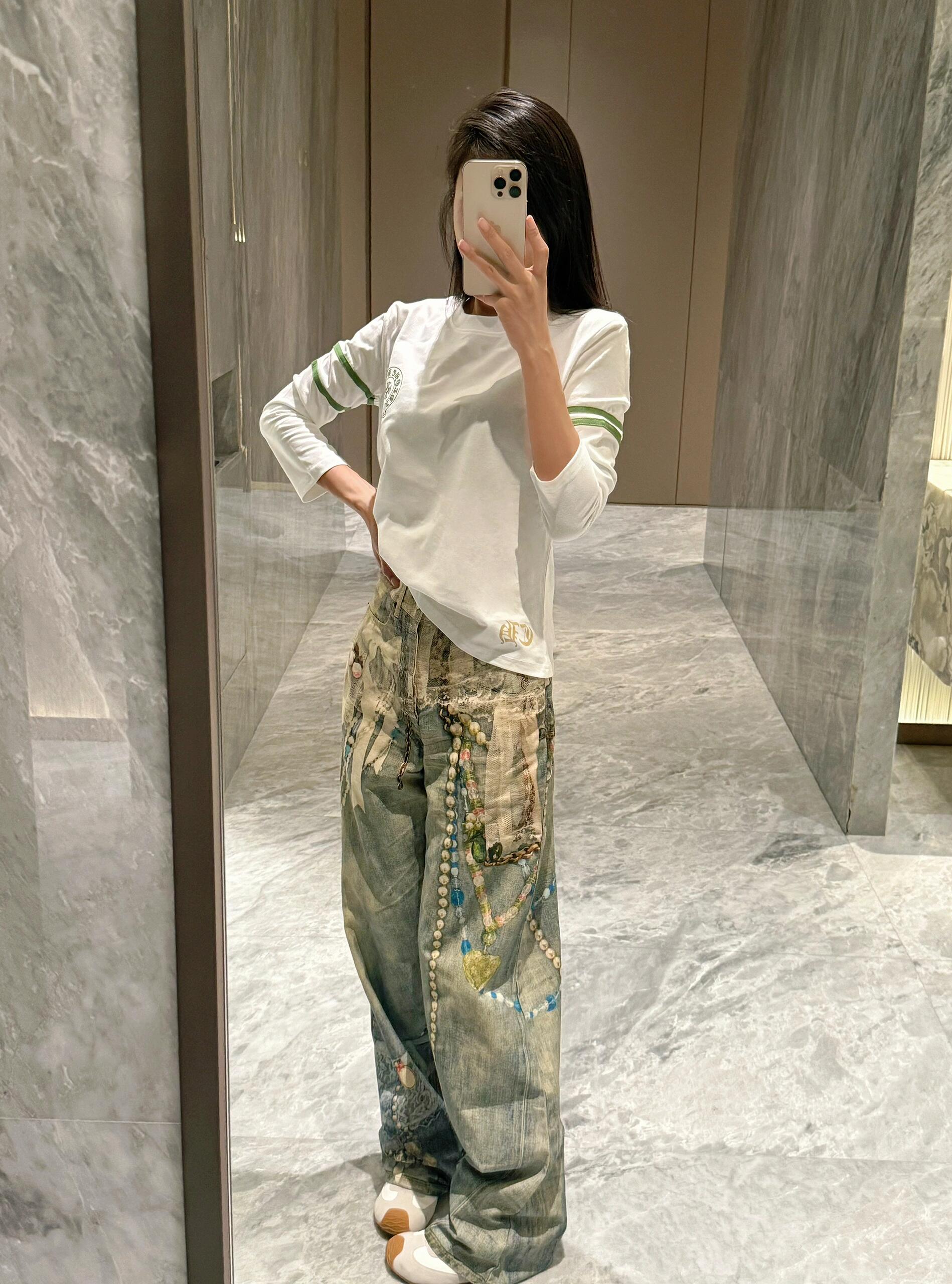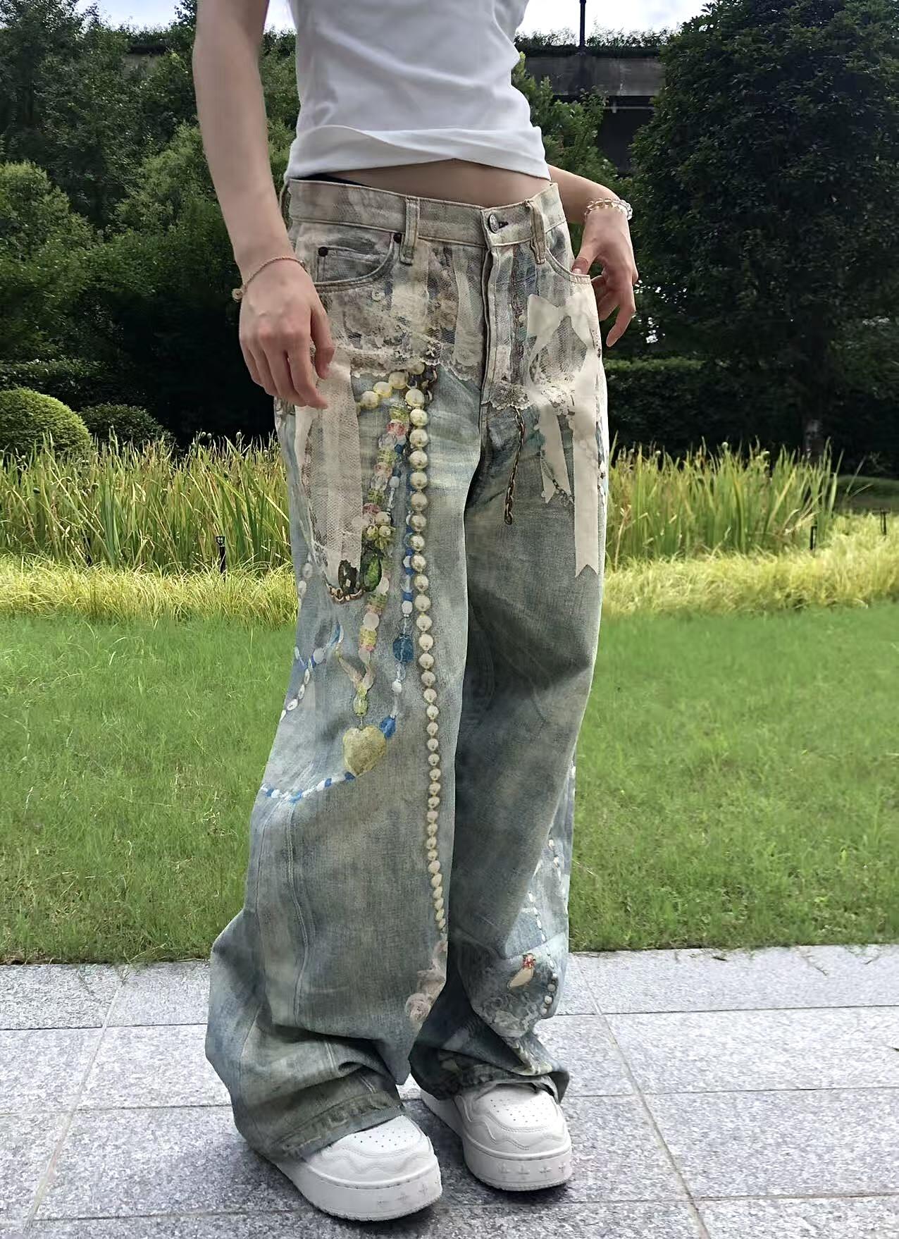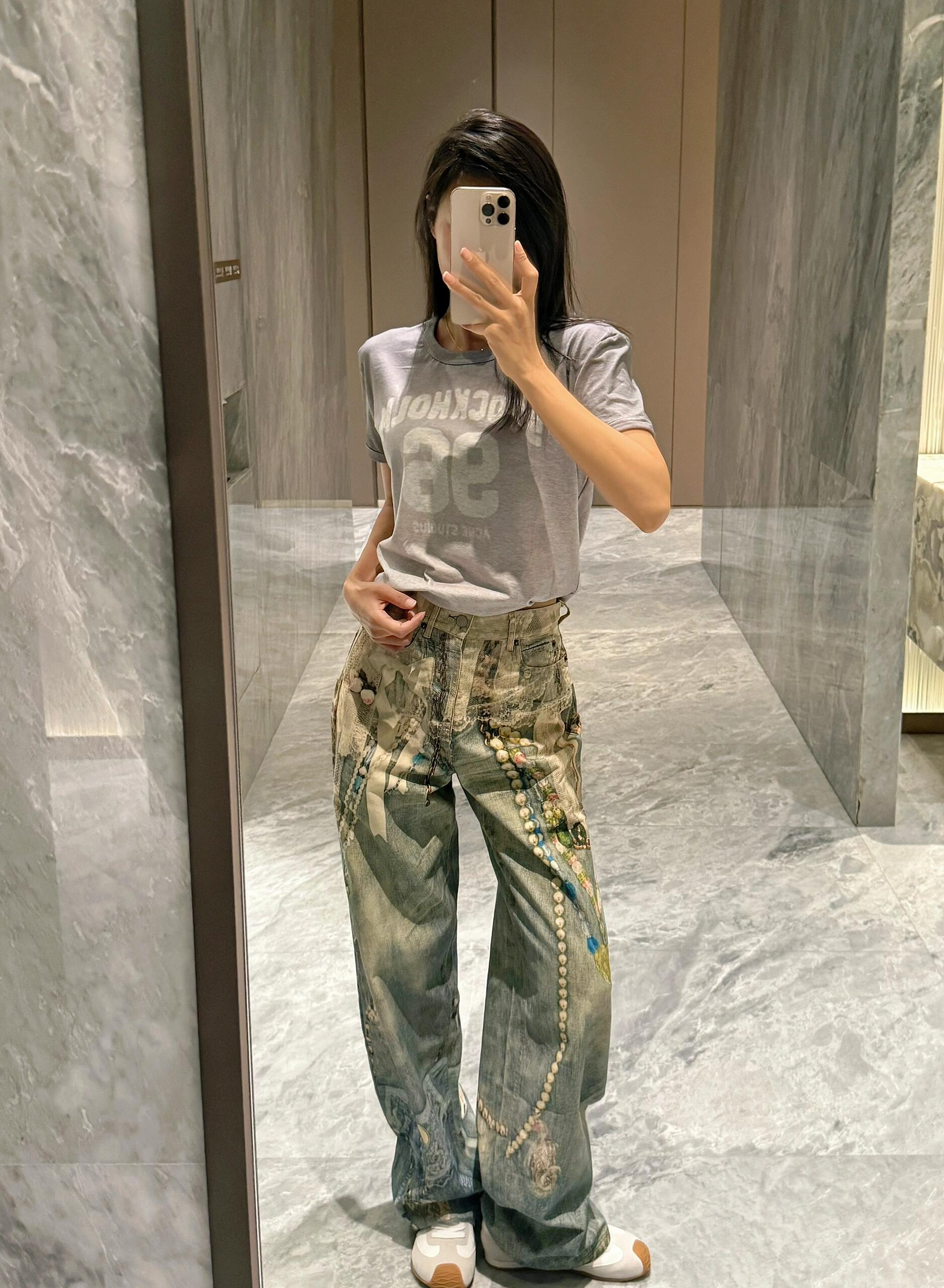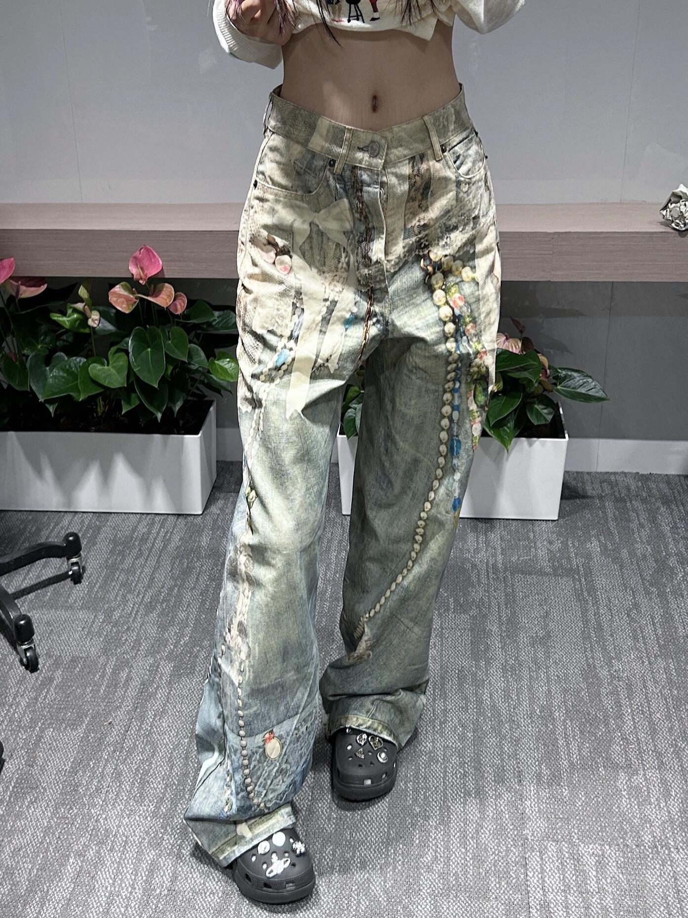 Acne Studios Lace and Pearl Printed Denim Pants bring a romantic twist to rugged streetwear. This wide-leg silhouette features intricate trompe-l’œil prints of lace trims, beaded chains, and delicate charms, set against a washed light blue denim base. The illusion of embellishment adds visual depth without extra weight, capturing a dreamy, collage-inspired aesthetic unique to the brand’s signature style.