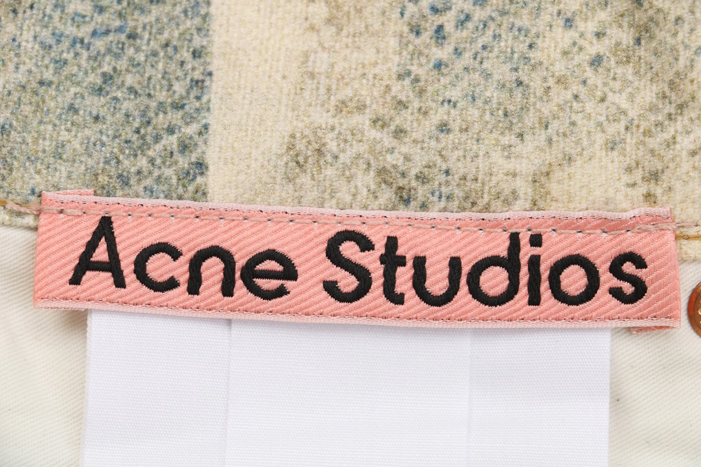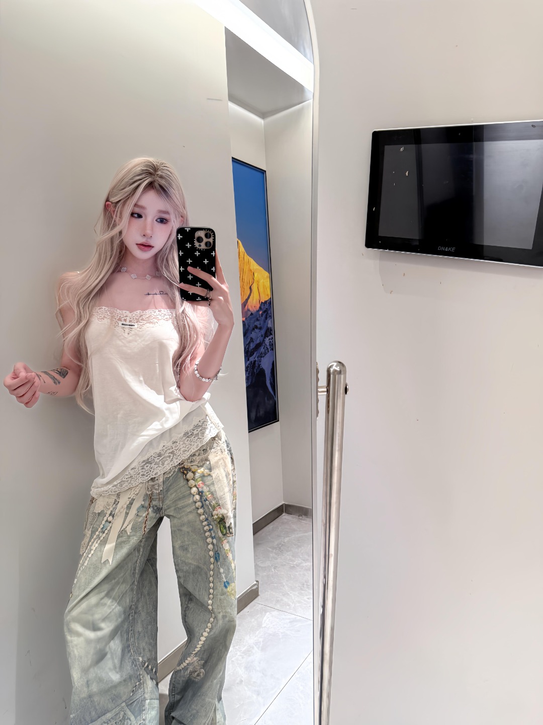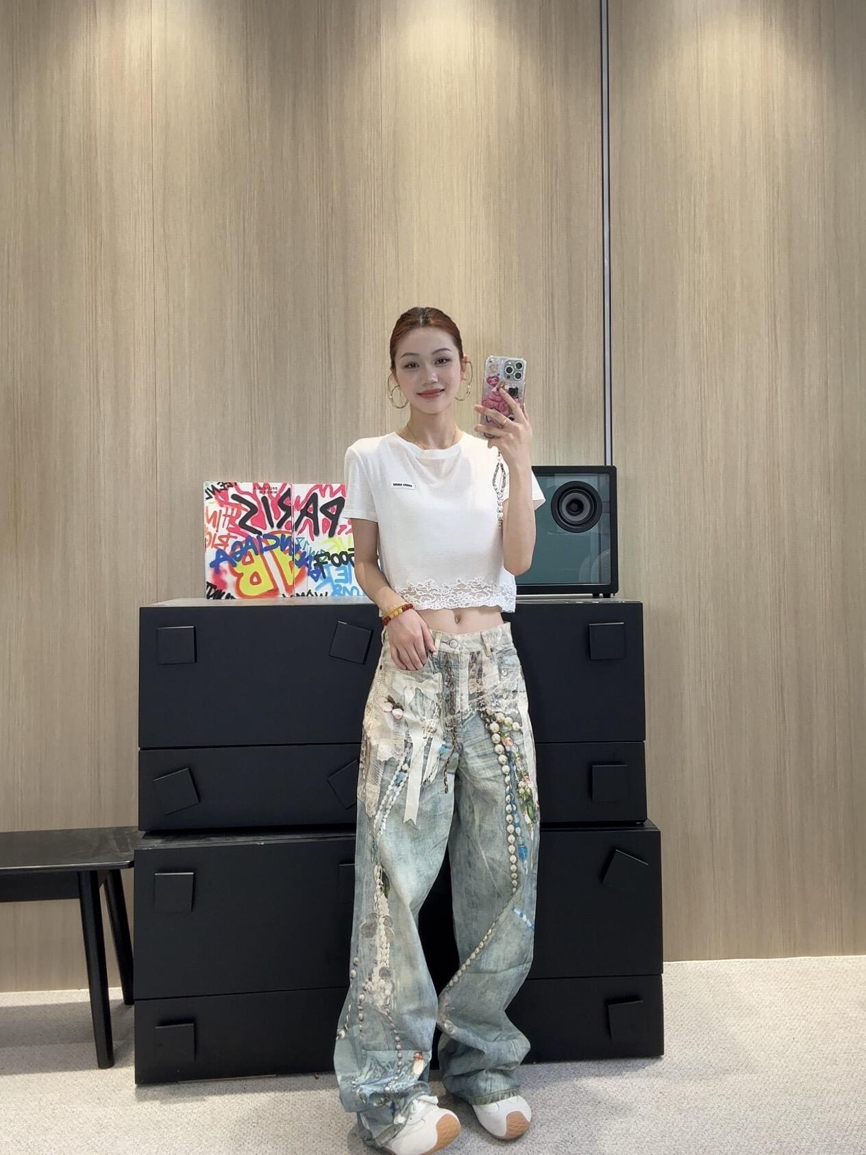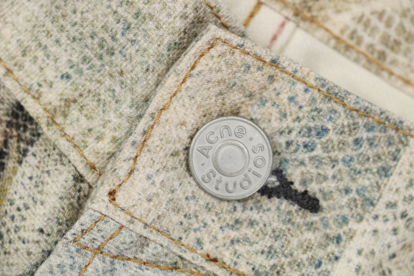 Acne Studios Lace and Pearl Printed Denim Pants bring a romantic twist to rugged streetwear. This wide-leg silhouette features intricate trompe-l’œil prints of lace trims, beaded chains, and delicate charms, set against a washed light blue denim base. The illusion of embellishment adds visual depth without extra weight, capturing a dreamy, collage-inspired aesthetic unique to the brand’s signature style.