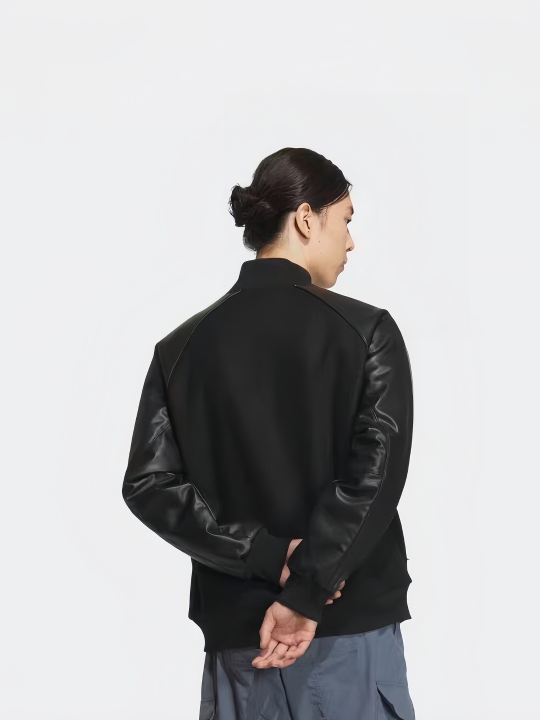 The body is crafted from matte nylon twill fabric, offering a structured yet lightweight feel, while the sleeves are constructed from high-quality faux leather with a subtle pebbled texture, enhancing the jacket’s iconic varsity profile. A smooth rayon twill lining adds comfort and helps maintain a clean, well-defined silhouette.
