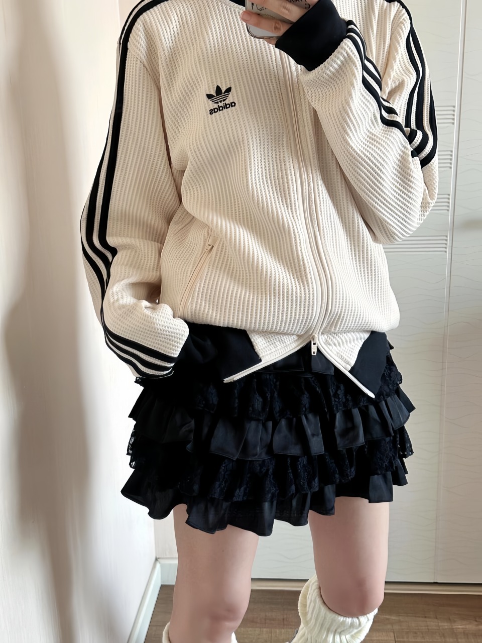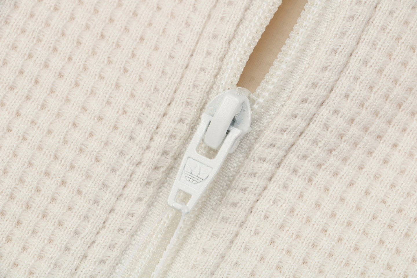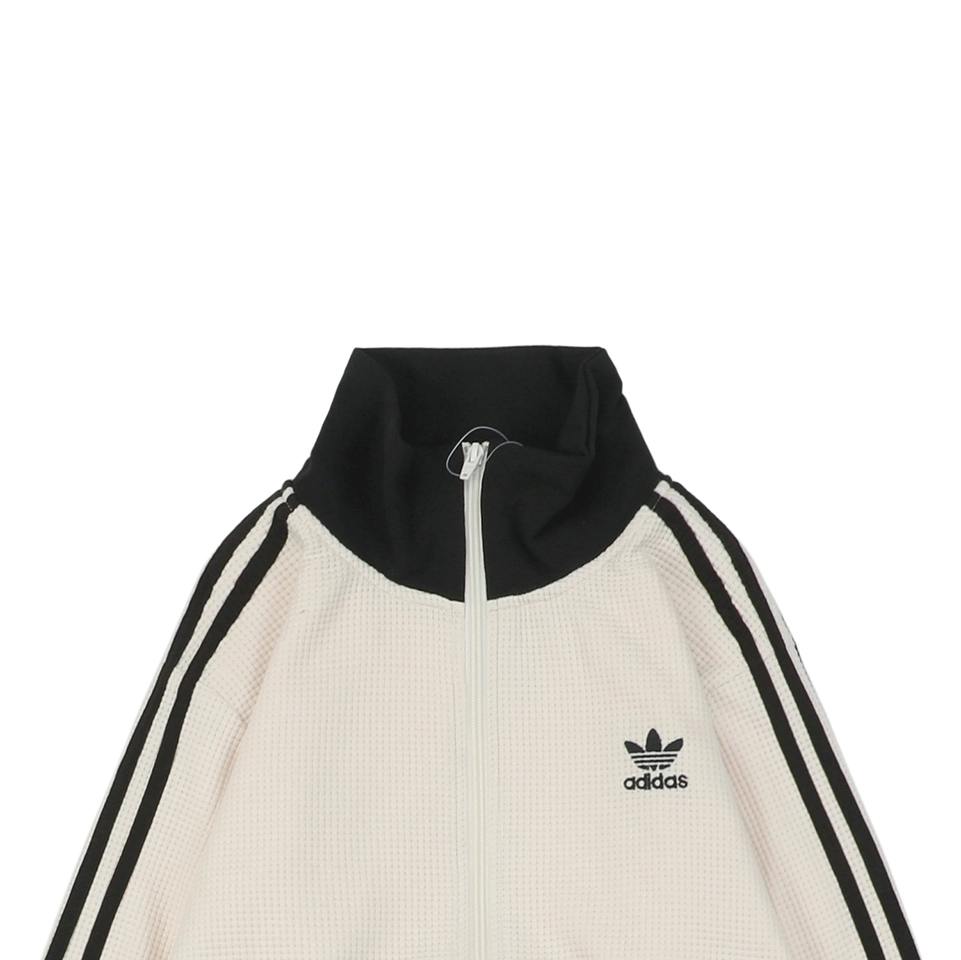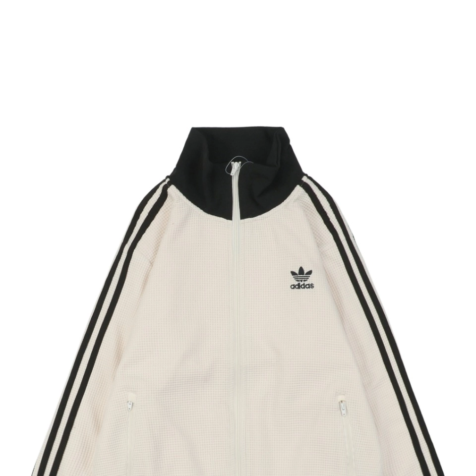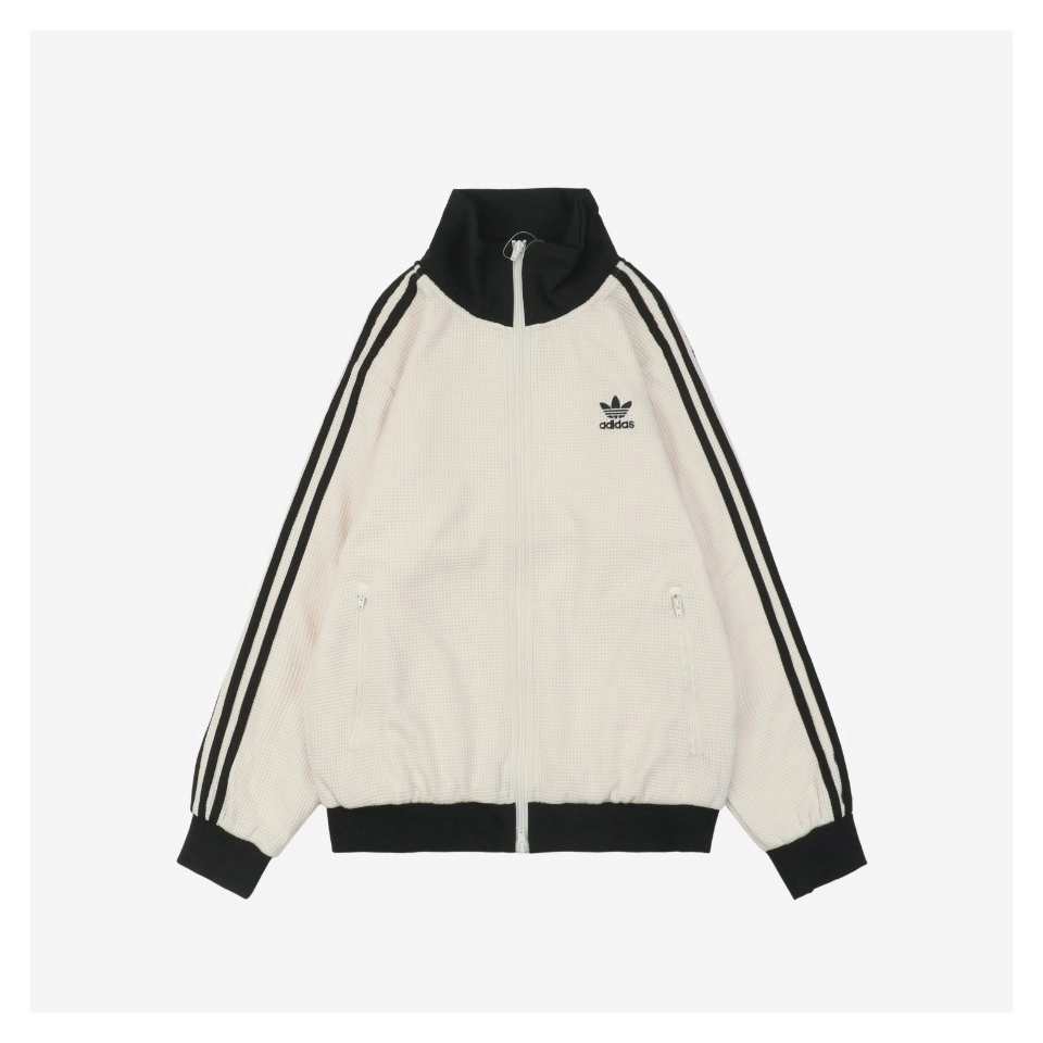 This Adidas jacket is crafted from a unique waffle-textured fabric, offering a lightweight, breathable, and comfortable feel with an elevated texture. Inspired by Adidas Originals’ classic athletic aesthetic, it features a Trefoil logo embroidery on the chest, accompanied by the signature three stripes running down the sleeves. The relaxed fit, stand collar, and full-zip closure provide both functionality and a stylish streetwear vibe. Ribbed cuffs and hem enhance warmth and fit, adding depth to the overall silhouette. Whether paired with track pants, jeans, or cargo pants, this jacket seamlessly blends vintage sportswear with modern street style.