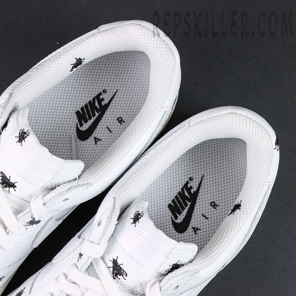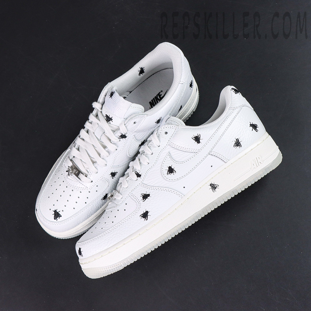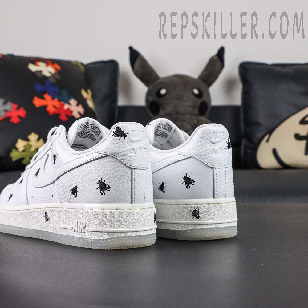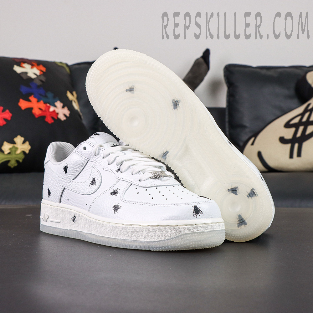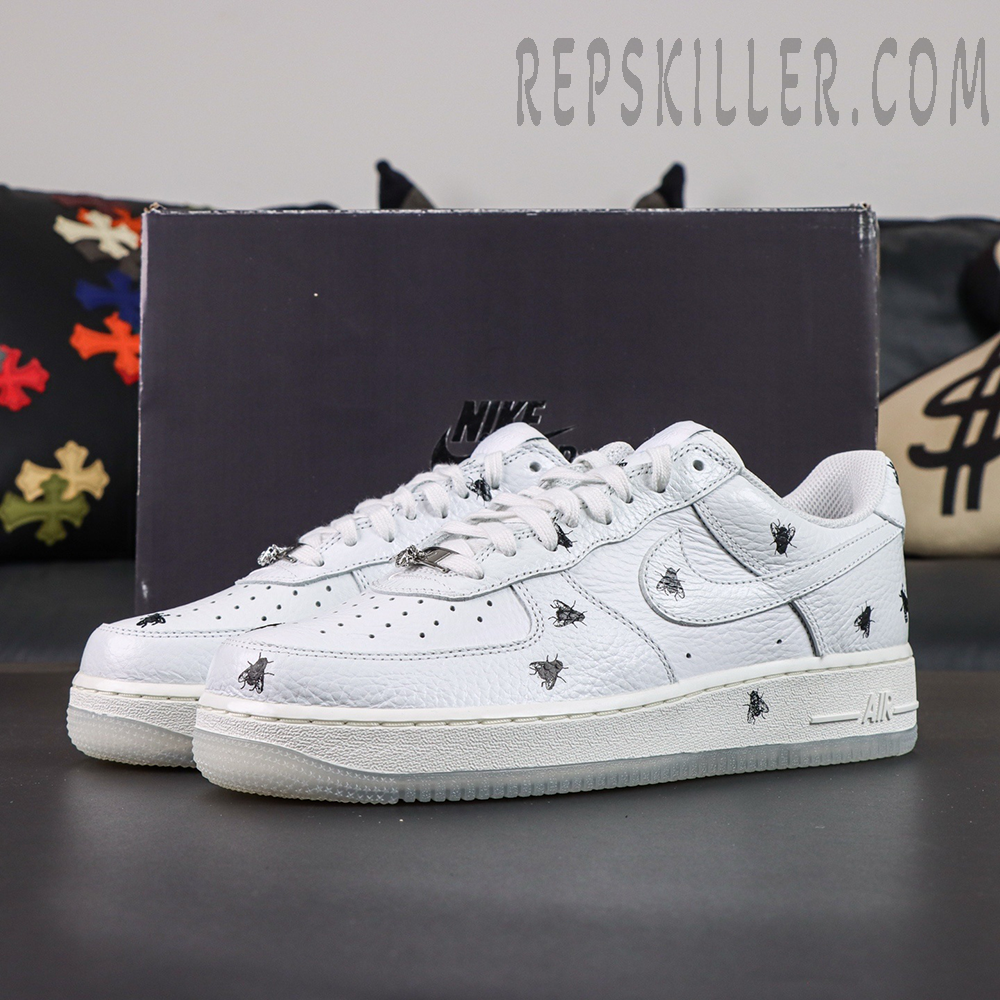 Constructed with premium white tumbled leather, the upper delivers the iconic clean look that defines the Air Force 1 legacy. What sets this version apart is the all-over housefly graphic detailing, subtly scattered across the panels to create a unique, rebellious aesthetic that breaks away from traditional minimalism.