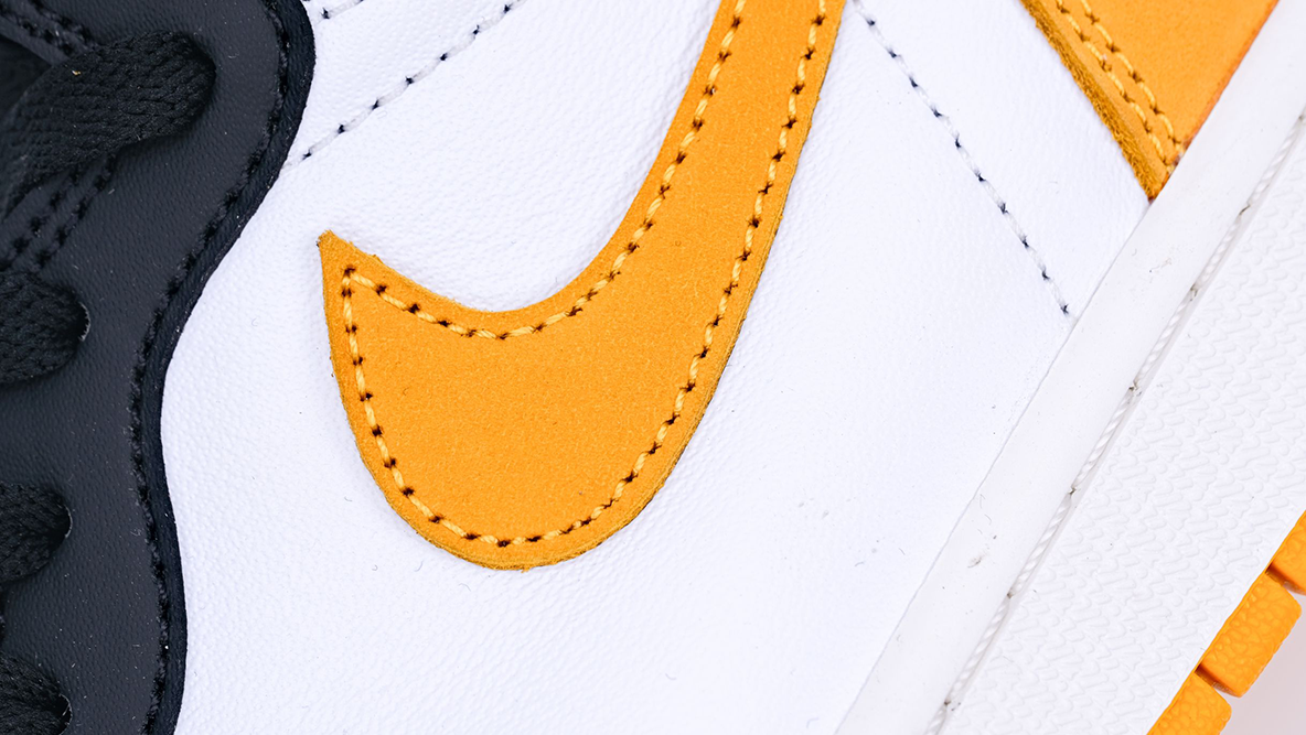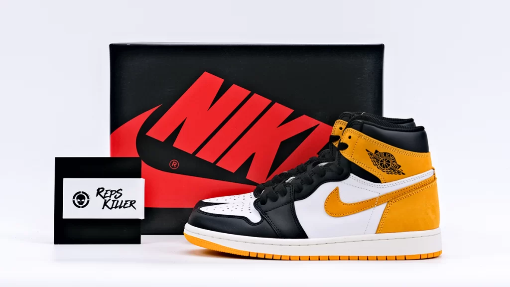 This Air Jordan 1 is characterized by its striking yellow ochre suede overlays, which contrast beautifully against a backdrop of black and white leather. The yellow ochre not only adds a vibrant pop of color but also symbolizes excellence and achievement, reflecting the high standards set by Jordan throughout his basketball career. The shoe features the classic Air Jordan 1 silhouette with a high-top cut, providing both ankle support and a timeless style.