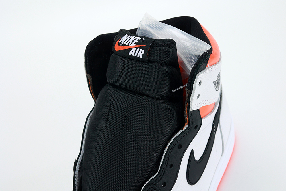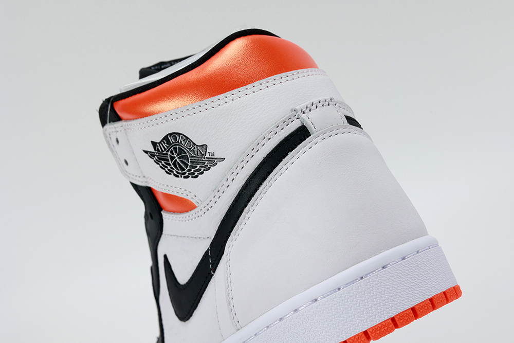 The upper of the sneaker utilizes smooth, premium leather, ensuring both durability and comfort. Black and white sections are meticulously stitched together, with pops of Electro Orange setting off the design. Perforations in the toe box maintain the Air Jordan 1’s classic ventilation features, making this shoe as practical on the court as it is stylish on the streets.