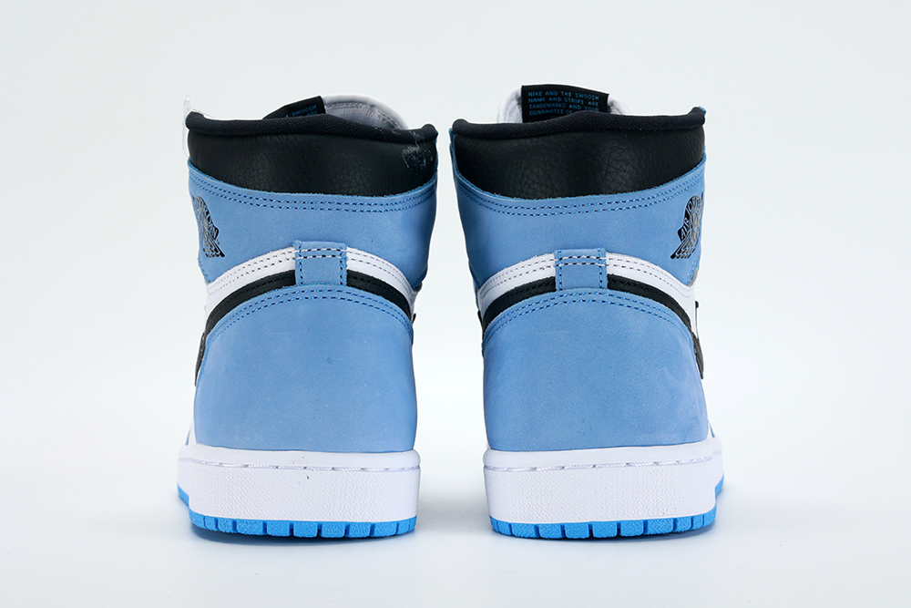 The design retains the classic Air Jordan 1 silhouette, including the perforated toe box for breathability and the iconic Wings logo embossed on the collar. A black Swoosh, matching laces, and the Air Jordan logo on the nylon tongue add distinctive branding elements, while the white midsole and University Blue outsole round off the design, ensuring these sneakers are instantly recognizable.