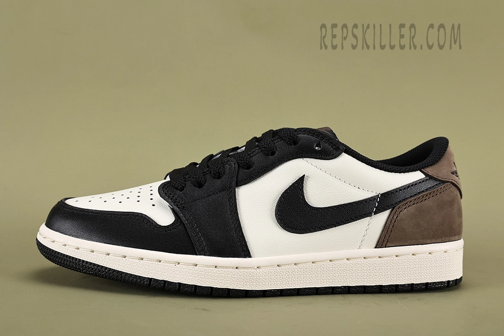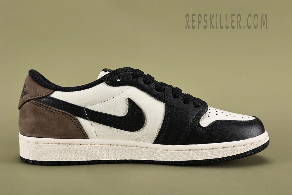 The Air Jordan 1 Retro Low OG ‘Mocha’ Replica features a classic mocha colorway with white leather, brown, and black details, offering a stylish and versatile look. This replica maintains OG elements with a low-cut design, providing comfort and breathability for everyday wear, closely replicating the authentic appearance and feel.