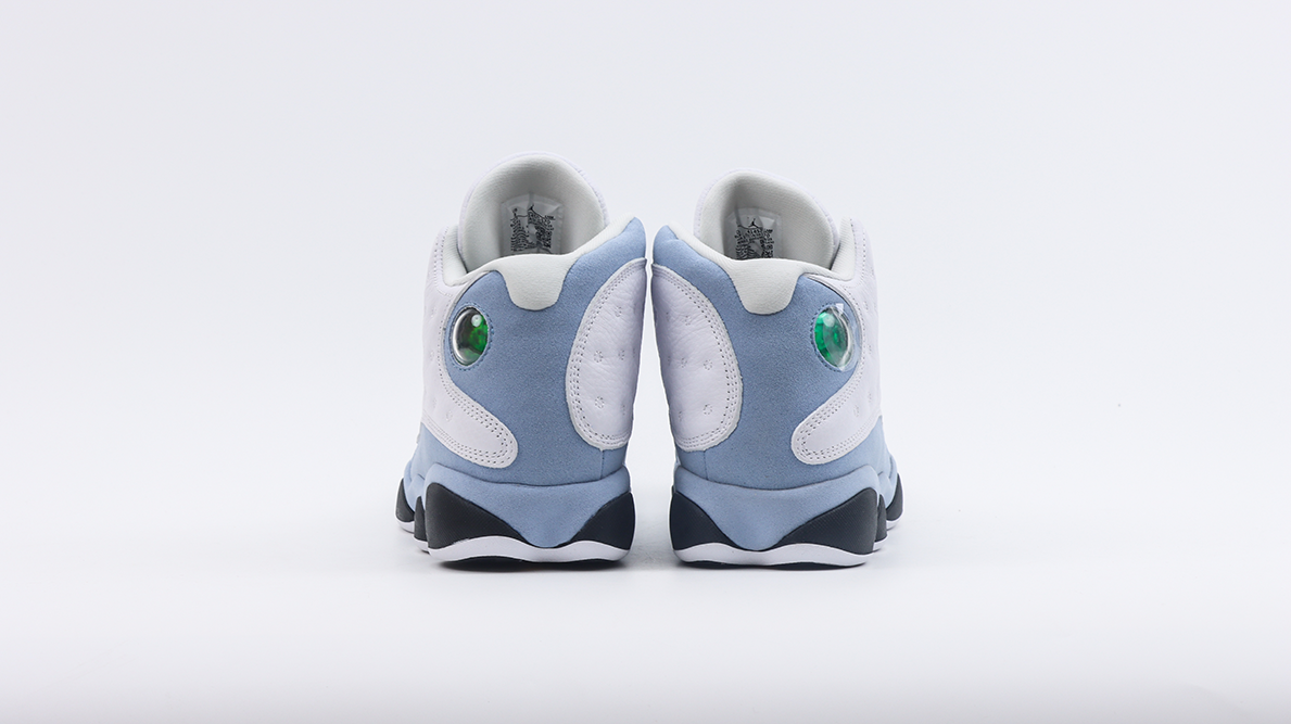 Crafted with premium materials, the upper combines durable leather with portions of suede, providing a rich texture contrast that enhances the overall aesthetic of the shoe. The blue-grey suede appears along the midfoot and heel, beautifully complementing the lighter shades of blue seen on the rest of the upper. This thoughtful color blocking not only adds visual depth but also highlights the iconic design elements of the Air Jordan 13, including the rounded holographic eye, which is reminiscent of a panther’s eye—a nod to Michael Jordan’s nickname, “Black Cat.”
