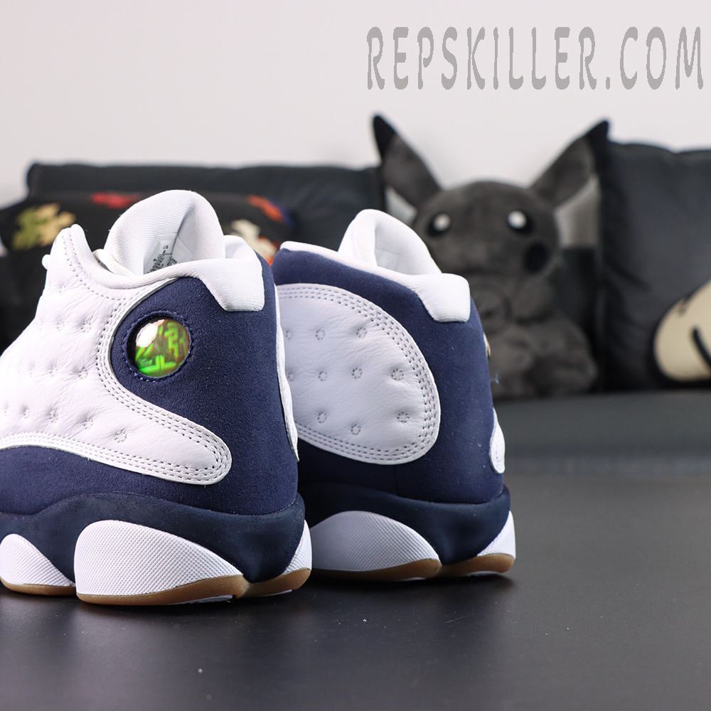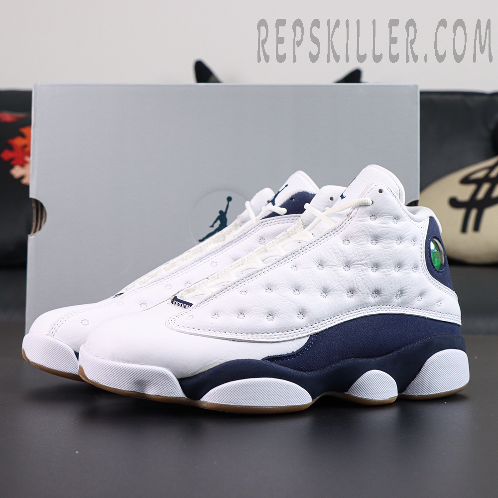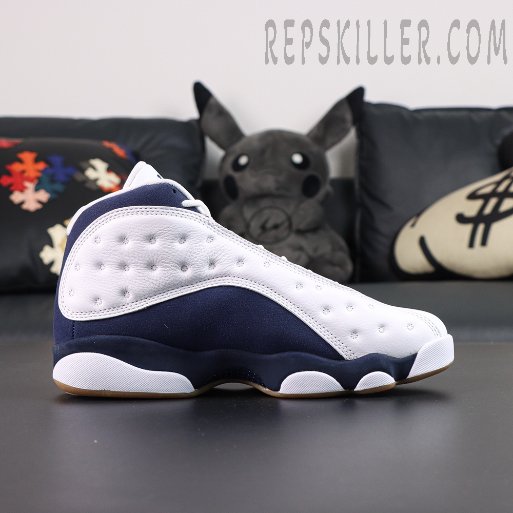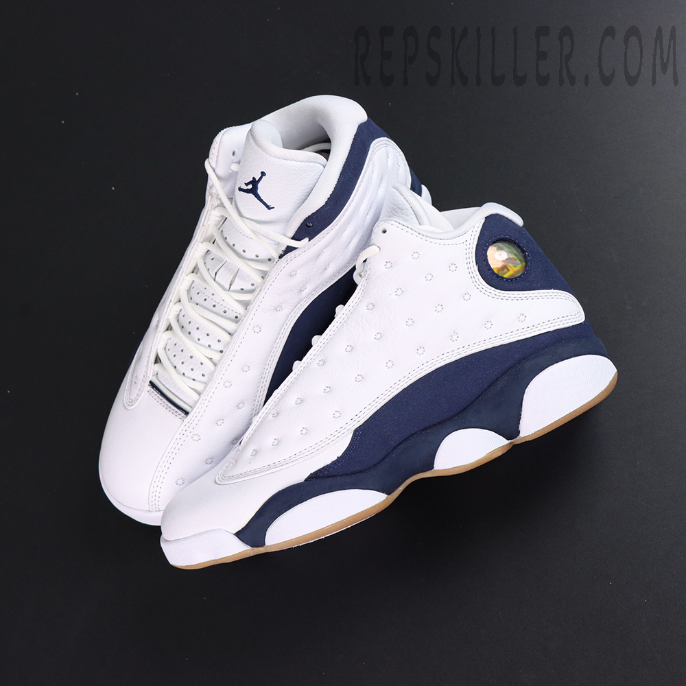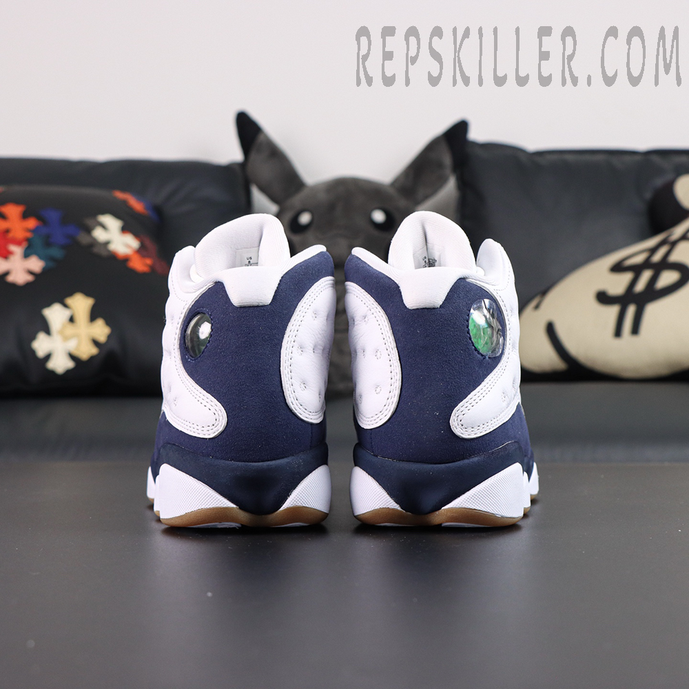 The Air Jordan 13 Retro ‘Midnight Navy’ modernizes the classic silhouette with a clean two-tone palette. The upper pairs white tumbled leather overlays with smooth white leather underlays, while Midnight Navy synthetic suede wraps the base and heel for subtle contrast. Signature touches include the holographic cat eye at the ankle and embroidered Jumpman on the tongue. Underfoot, a gum rubber panther paw outsole ensures reliable grip and vintage flair, making this release a perfect balance of sport and style.