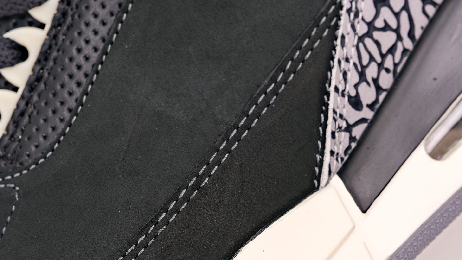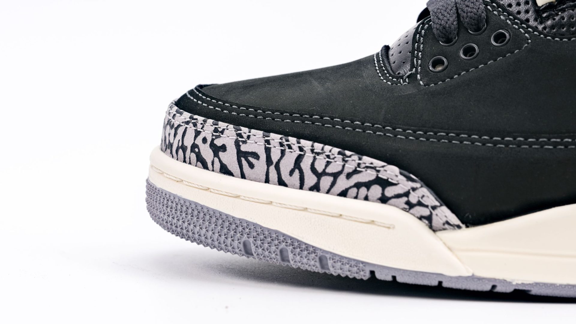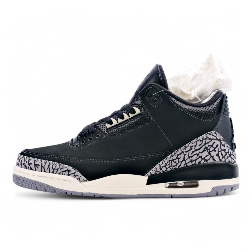 The ‘Off Noir’ version of the Air Jordan 3 features a robust combination of materials including tumbled leather and suede, which provide a luxurious feel and sophisticated look. The primary color of the sneaker is a deep, matte black that lends it an understated yet powerful aesthetic. This dark base is contrasted subtly with lighter gray and charcoal tones on the midsole and elephant print detailing along the toe and heel, iconic to the Air Jordan 3 design.