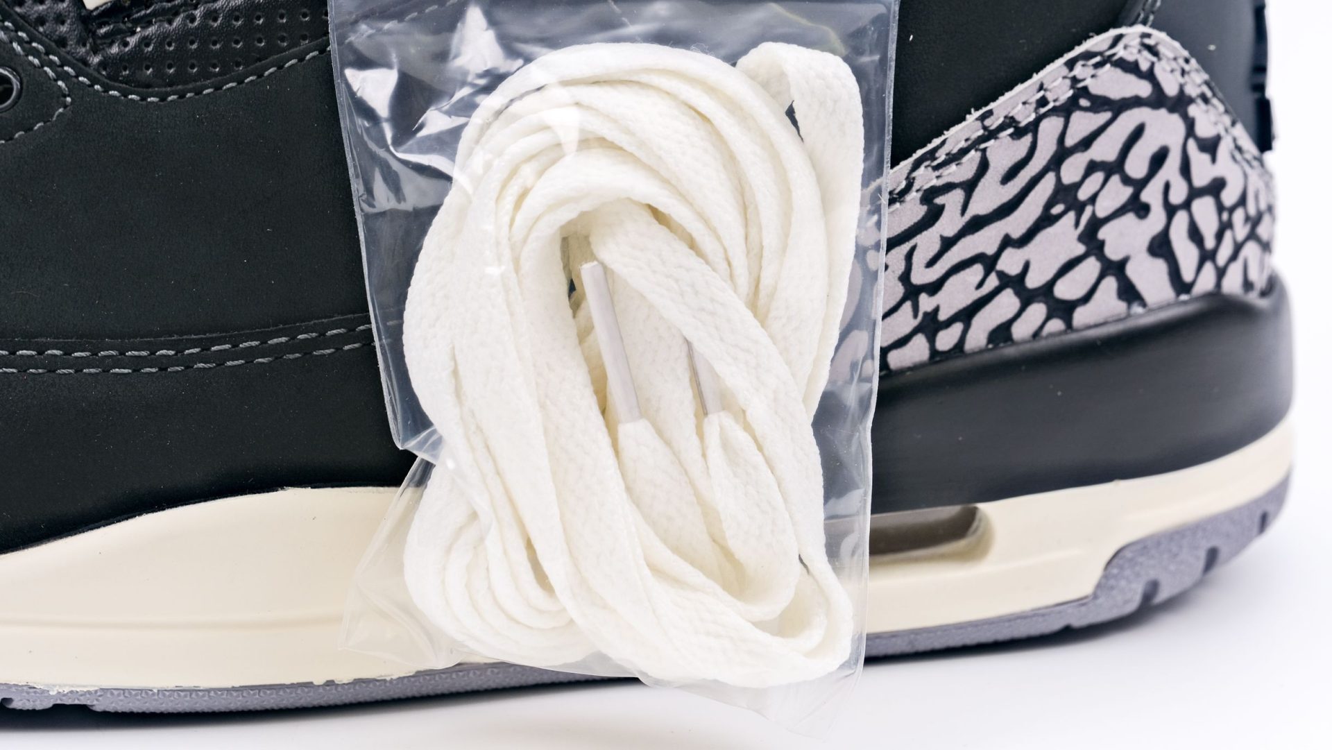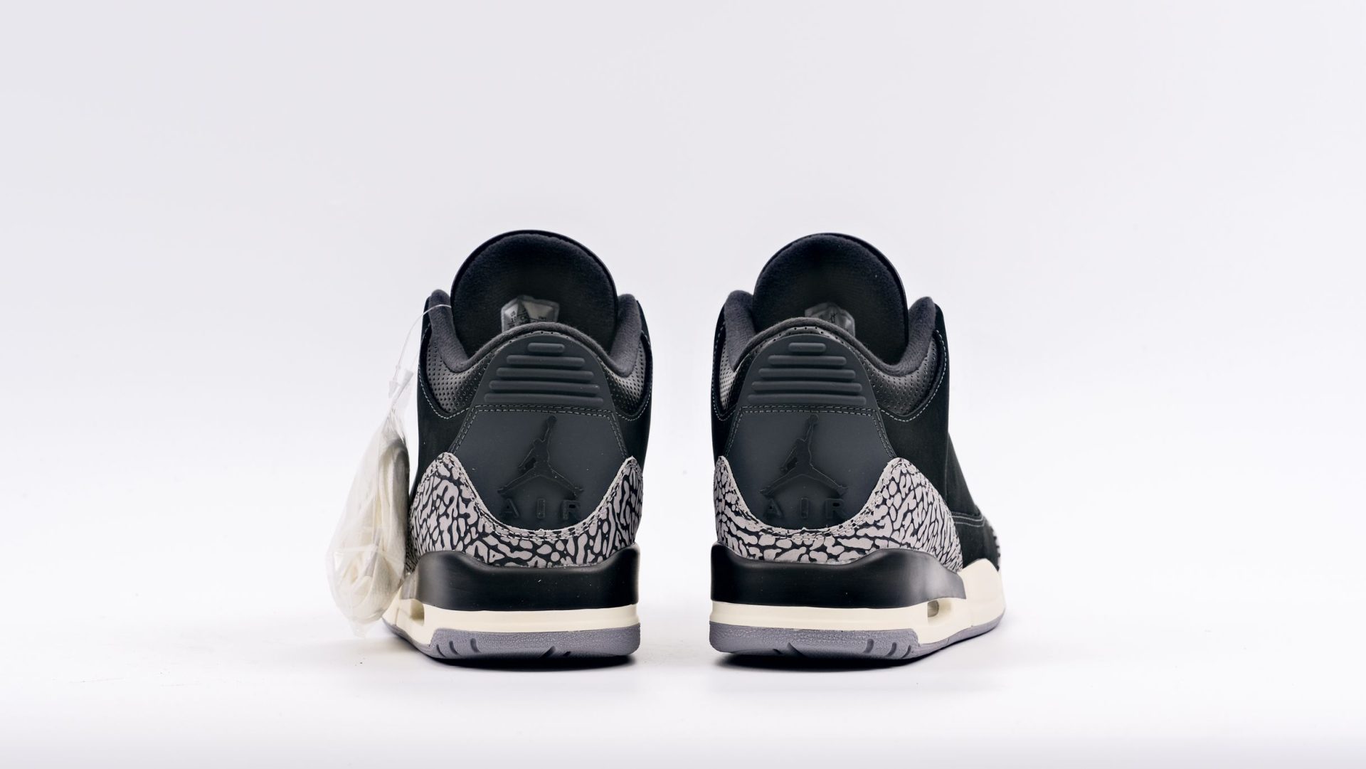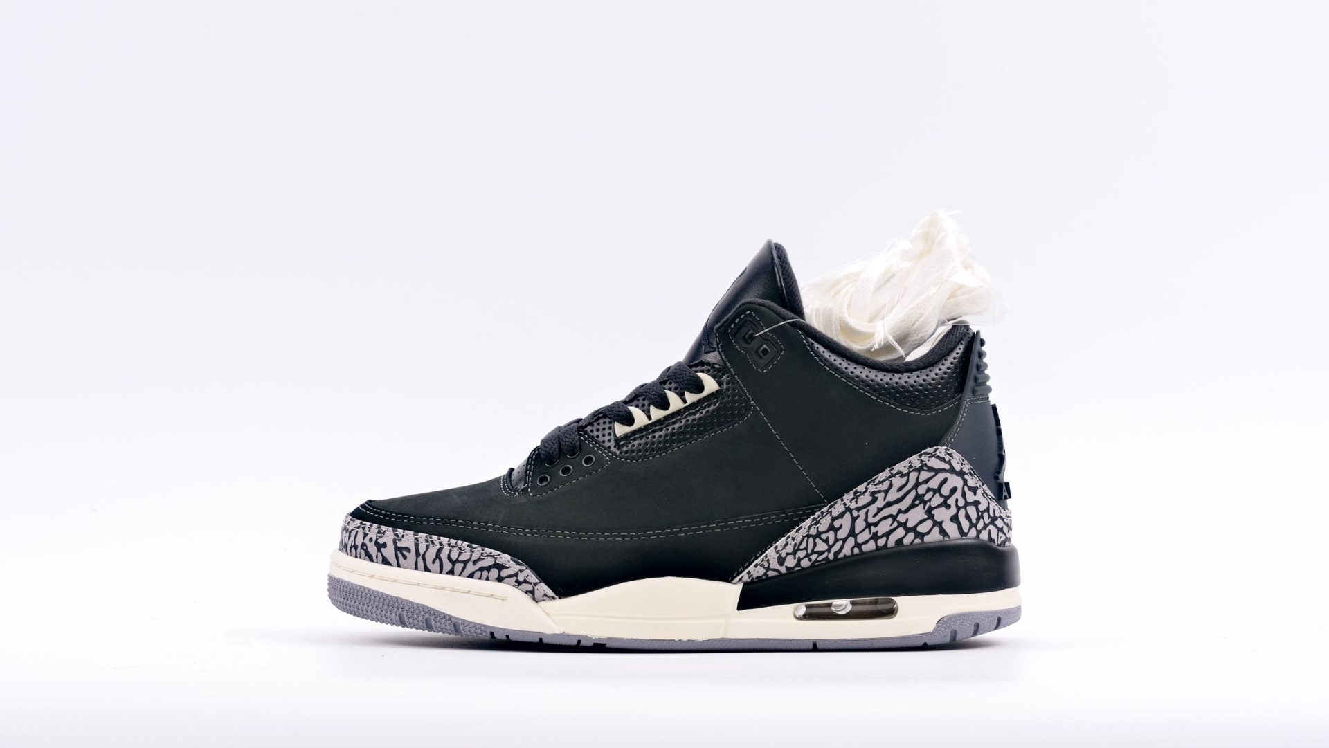 Durability is also a key feature of the Air Jordan 3 Retro ‘Off Noir’, with a tough rubber outsole that incorporates a circular traction pattern. This design ensures a good grip on a variety of surfaces, making the shoe versatile for both everyday activities and more rigorous sporting engagements.