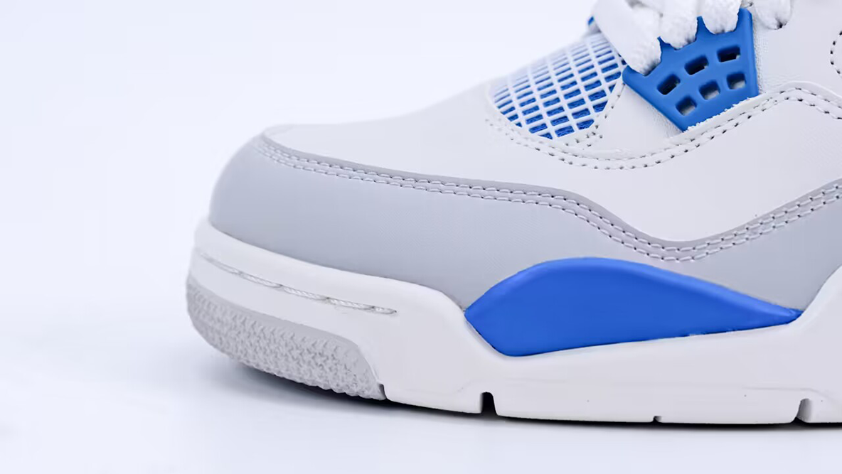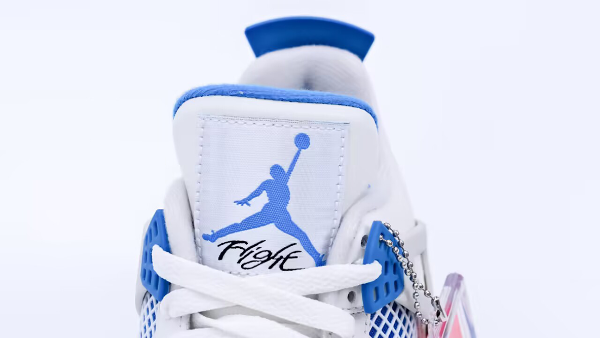 The sneaker features a predominantly white leather upper that provides a crisp and clean look, making it versatile and suitable for various styles and occasions. The leather is complemented by Military Blue accents on the midsole, heel, under the mesh panels, and on the Jumpman logo on the tongue. These blue highlights are paired with neutral grey touches, which appear on the wings, heel, and forefoot, adding to the shoe’s visual appeal.