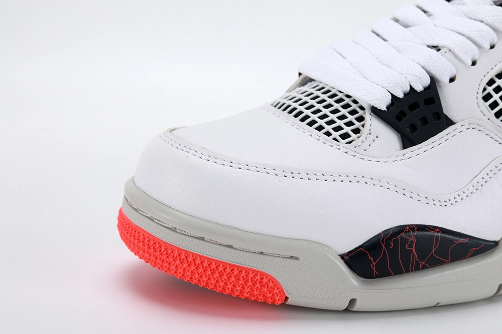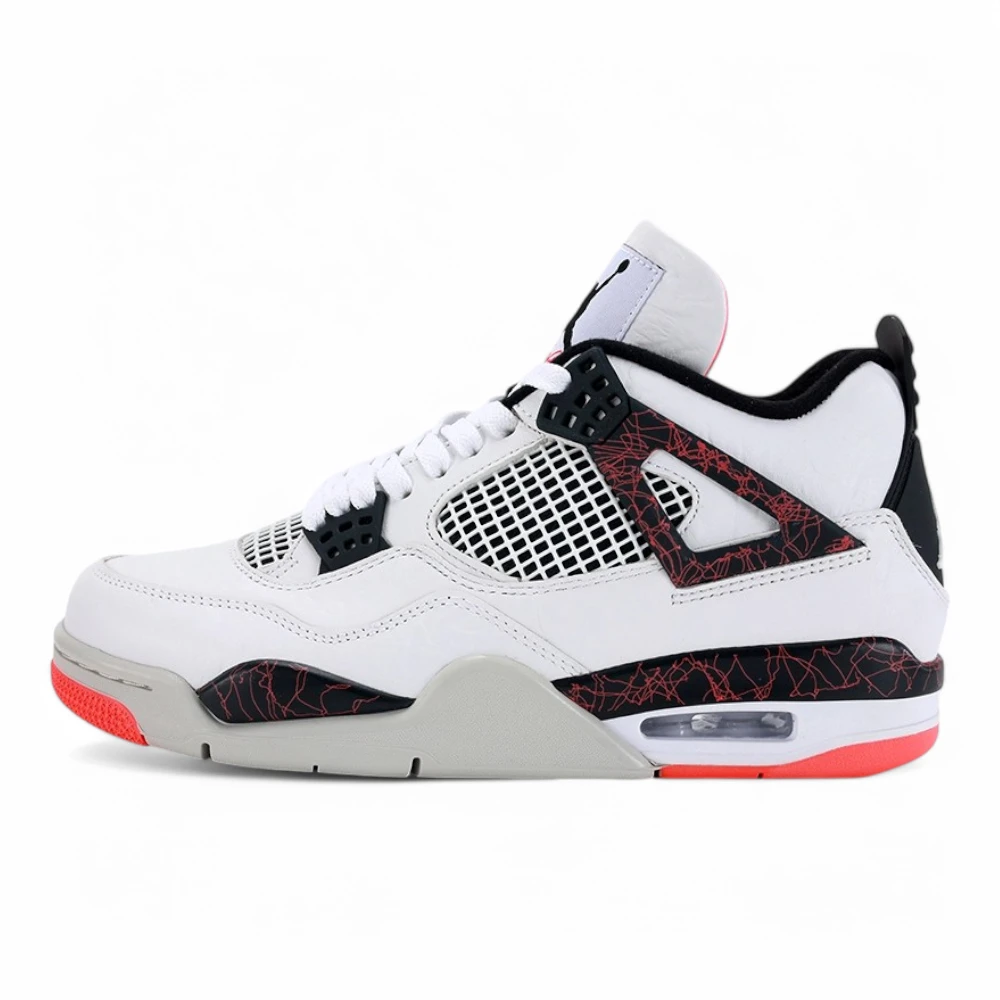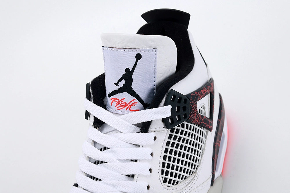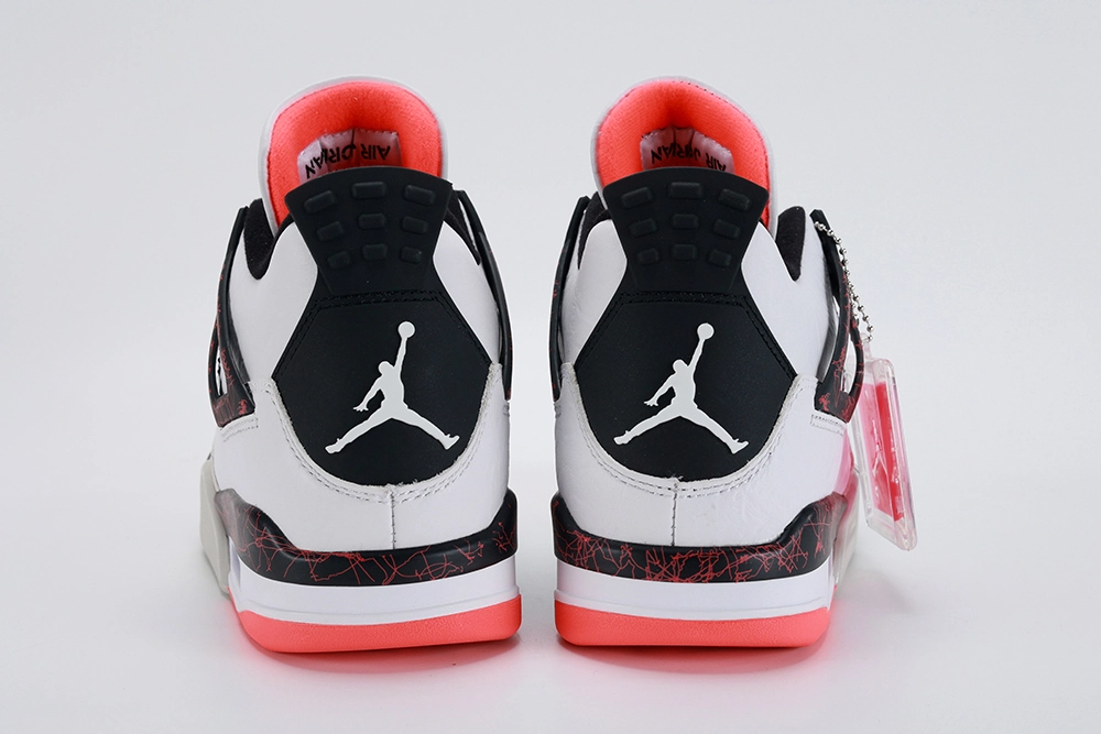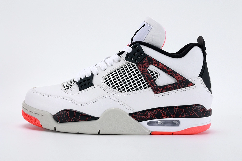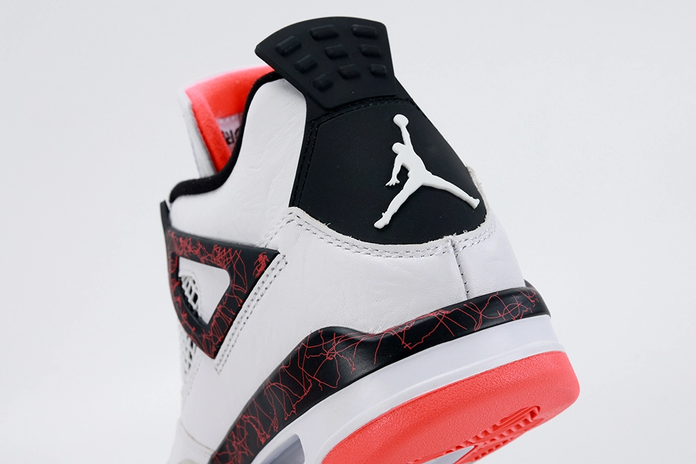 One of the standout features of this sneaker is the speckled detailing on the midsole and the wings, which not only enhance its aesthetic appeal but also pay homage to the classic elements that have made the Air Jordan 4 a fan favorite. The black accents on the straps, heel tab, and lace guards ground the design, adding a sharp contrast that highlights the brighter elements.