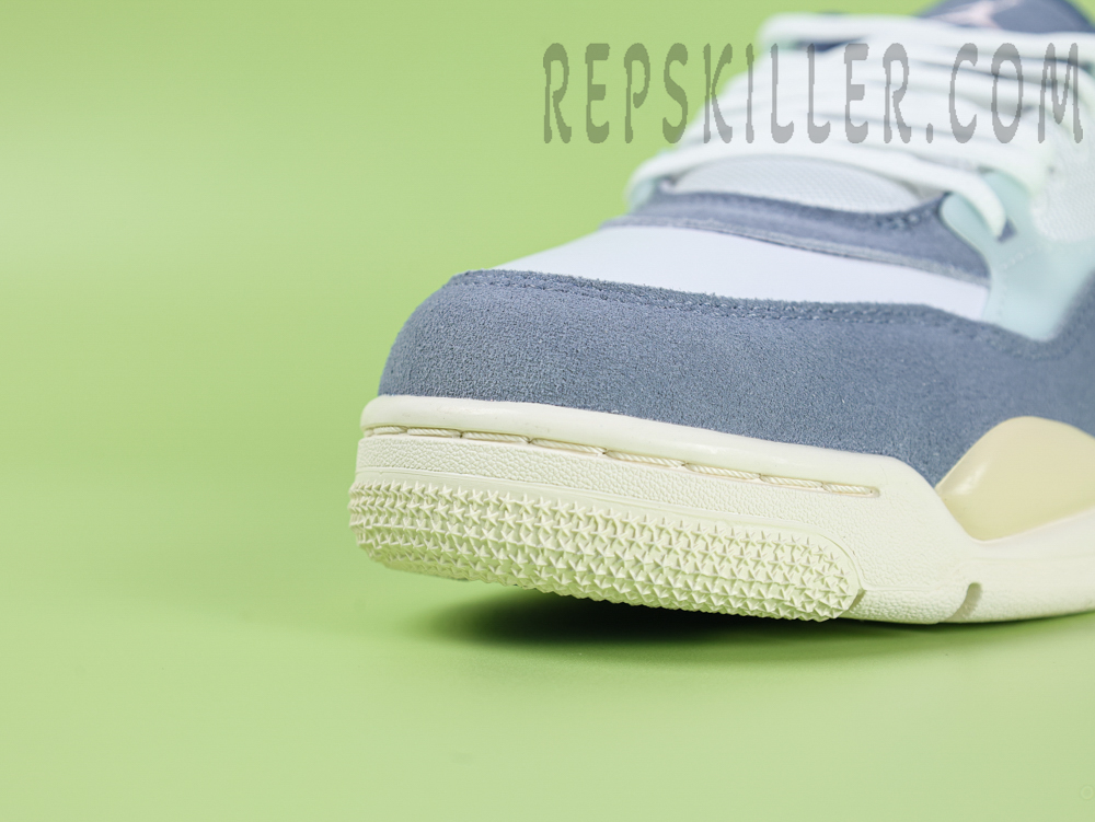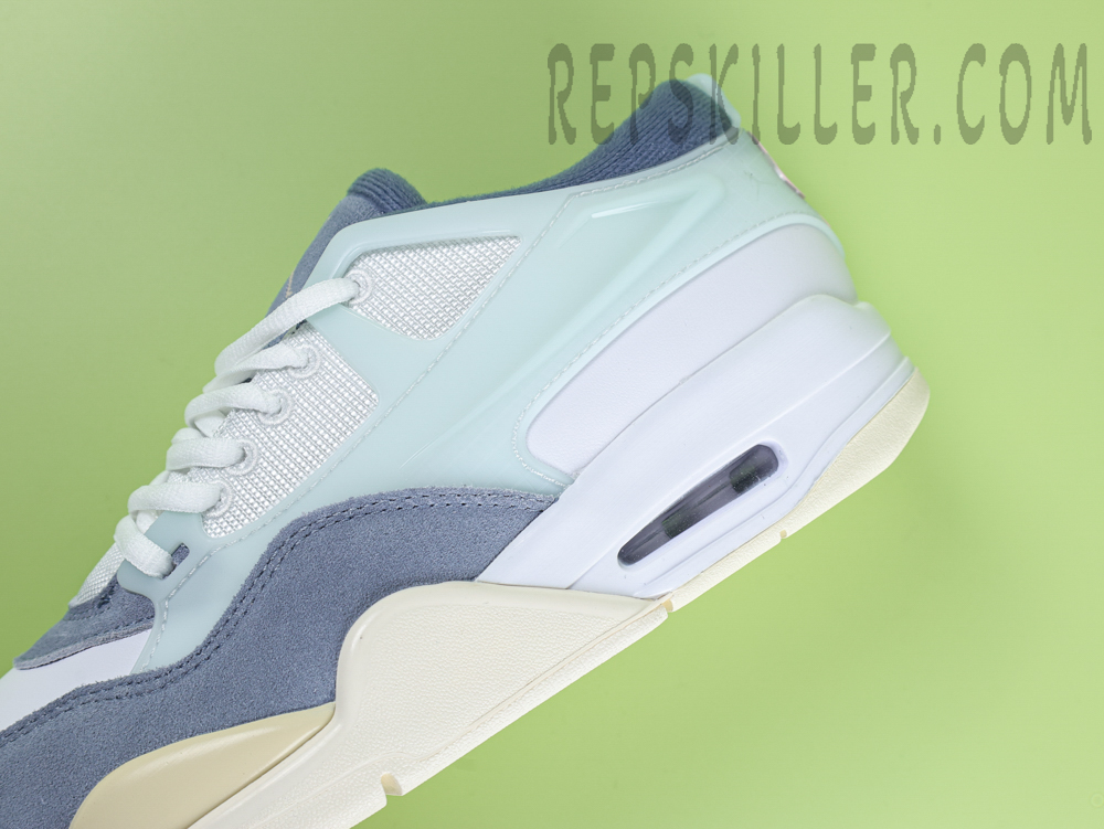 This Air Jordan 4 RM ‘Diffused Blue Ashen Slate’ shoe is made of upscale white leather with a soft blue suede cover for a fresh and elegant look. The side and heel sections of the shoe are designed with translucent soles and heel panels, giving it a modern fashion sense. At the same time, the Prism Pink brand logo on the tongue and heel adds a touch of vitality to the overall design. The Max Air cushioning device is built into the shoe to ensure that the wearer enjoys the ultimate comfort experience every time.