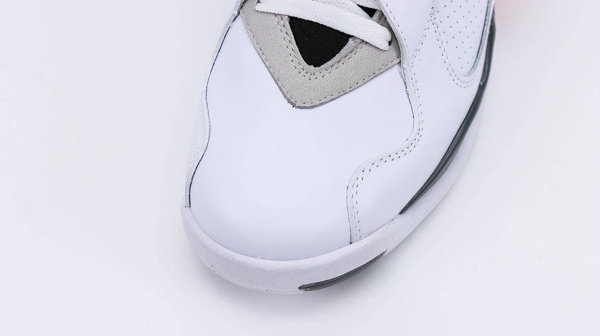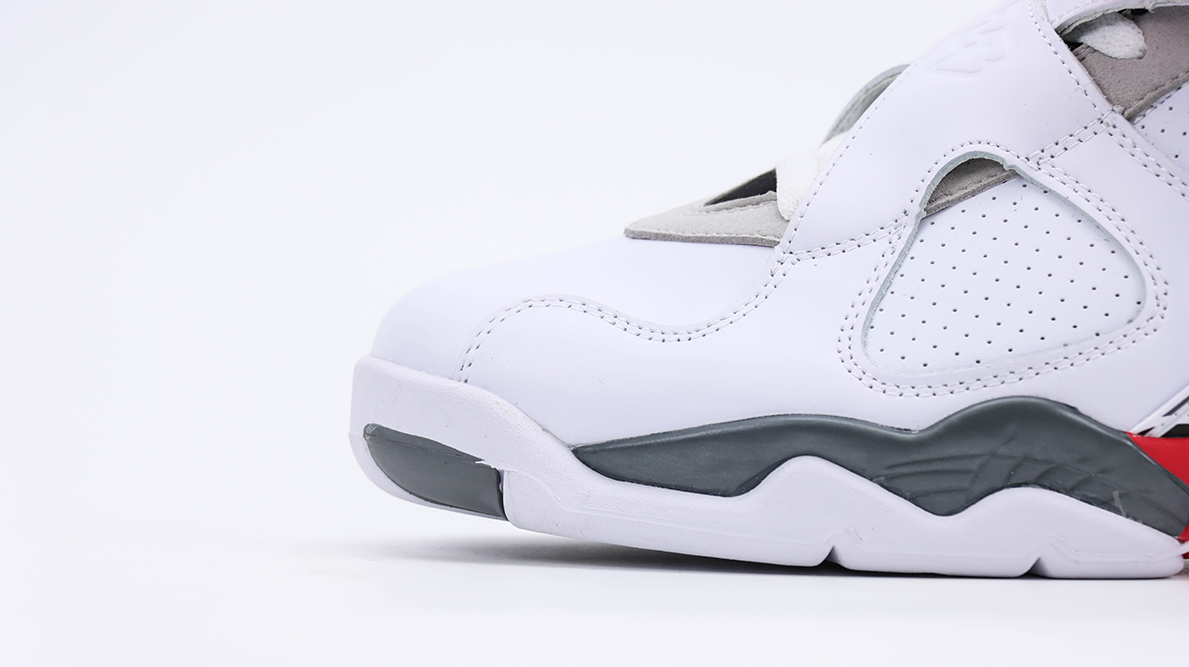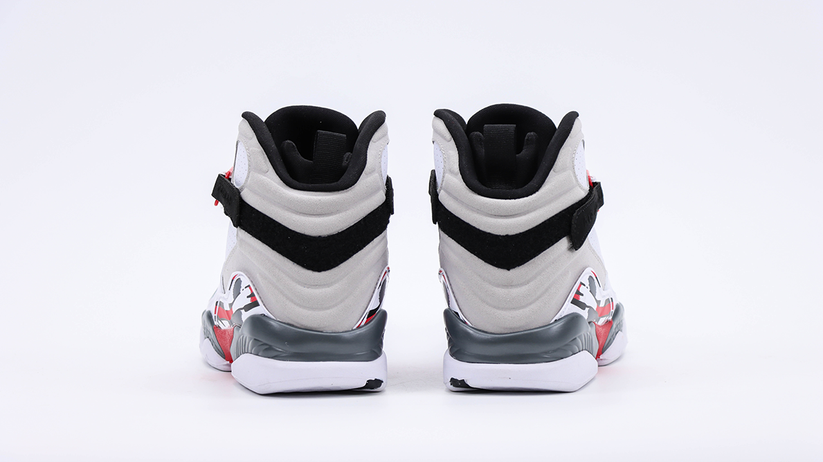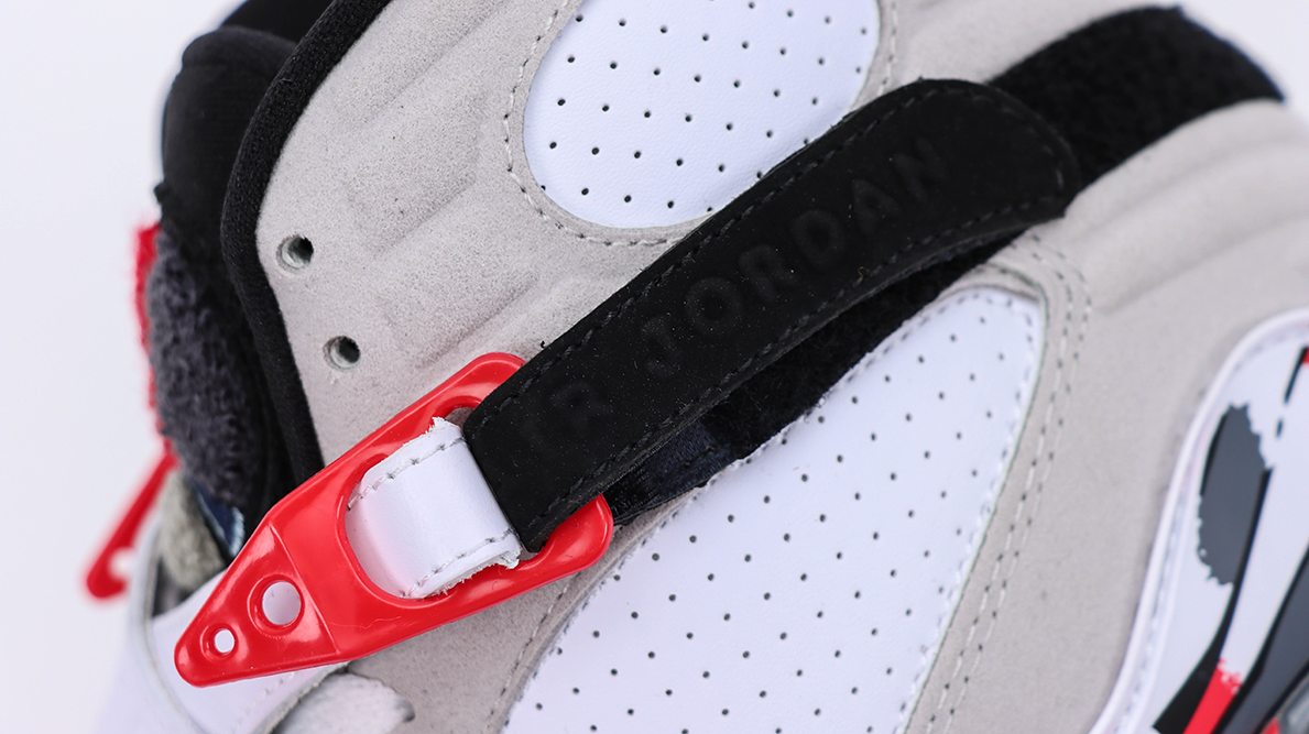 The Air Jordan 8 Retro ‘Bugs Bunny’ features a predominantly white leather upper with accents of black, grey, and true red, reflecting the classic Chicago Bulls colors. This color scheme not only provides a clean and striking appearance but also ties back to the sneaker’s origins and Jordan’s basketball legacy. The cross-straps, which are a signature element of the Air Jordan 8, add a unique structural component and enhance foot security, making the sneaker stand out in both design and functionality.