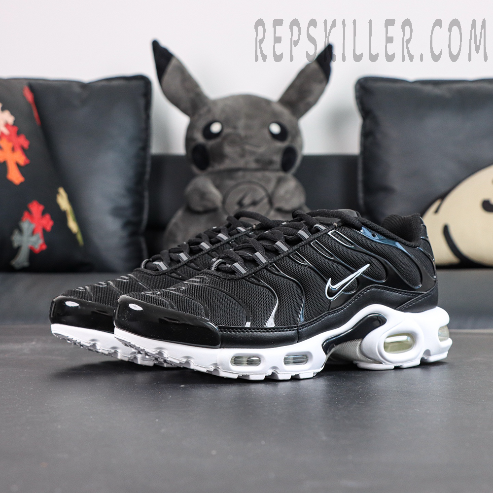 The upper features a breathable black mesh base, reinforced with signature wavy TPU cage overlays that define the Air Max Plus identity. Glossy black accents wrap the toe and mudguard for added durability, while crisp white detailing on the midsole and mini Swoosh provides sharp visual contrast. The streamlined profile makes this pair especially popular among buyers looking for high quality Air Max Plus reps that stay true to the original shape and proportions.