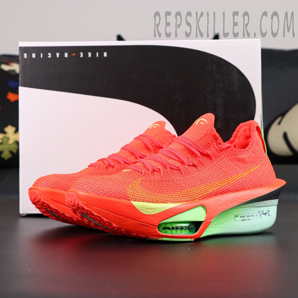 The Air Zoom Alphafly NEXT% 3 ‘Bright Crimson Lime Blast’ is engineered for elite marathon performance, merging cutting-edge Nike innovation with eye-catching aesthetics. Its Atomknit 3.0 upper offers featherlight support and exceptional breathability, wrapped in a radiant scarlet tone. The high-stack ZoomX foam midsole houses dual Zoom Air pods in the forefoot, amplified by a full-length carbon fiber Flyplate for propulsive energy return. A notched lacing system and integrated tongue ensure a locked-in fit, making this model an ultimate weapon for runners chasing podium finishes and personal bests.