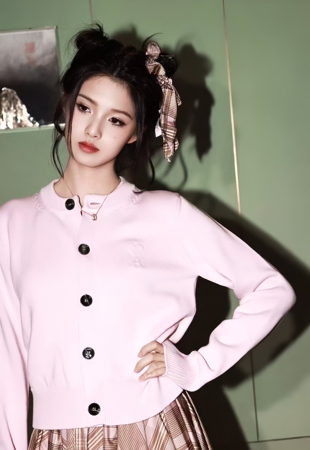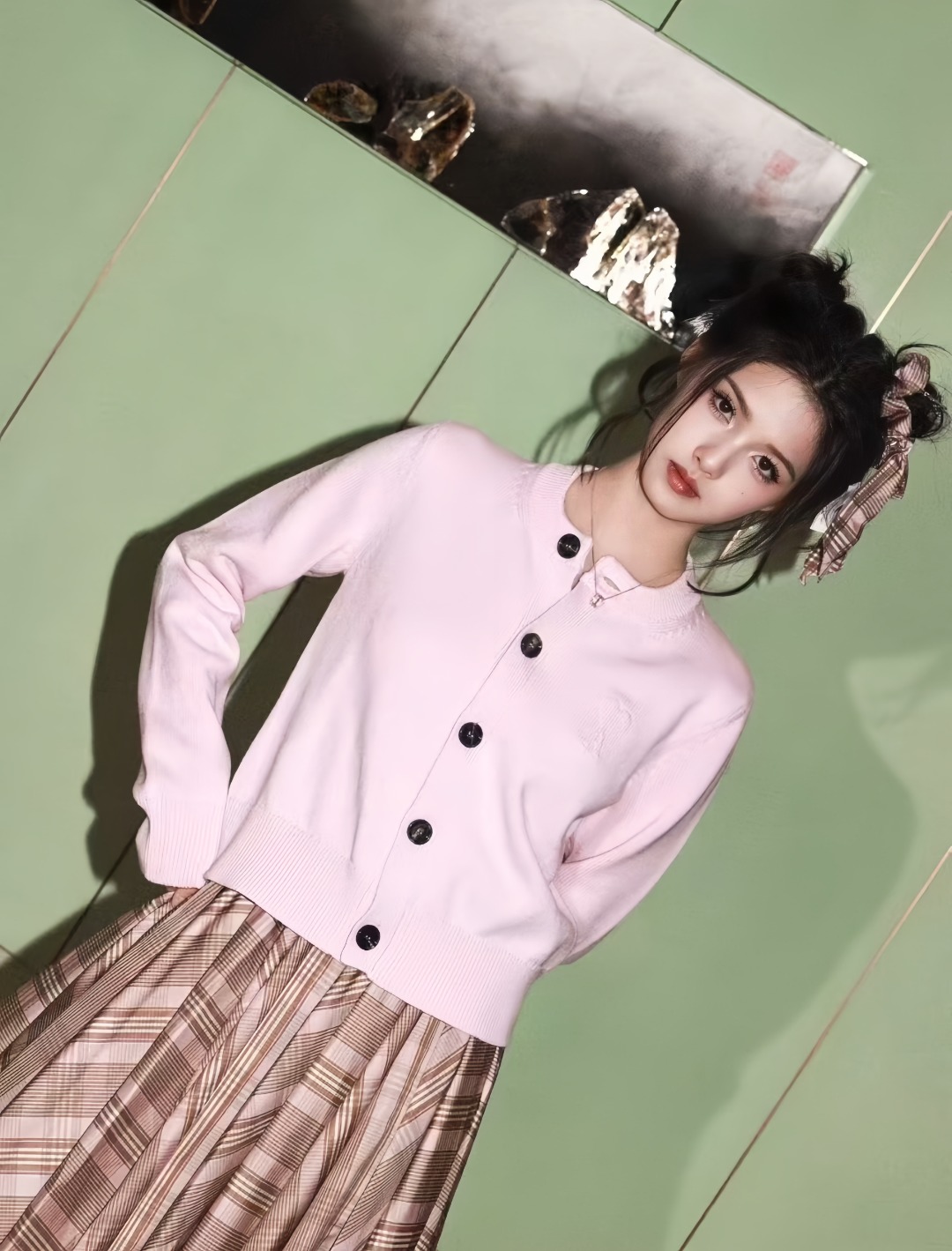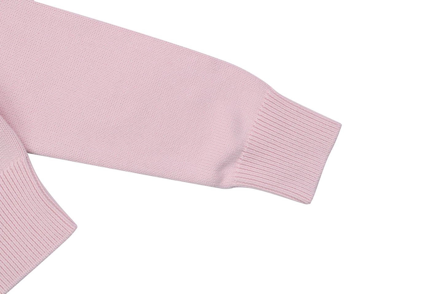 Finished in a gentle cherry-blossom pink tone, the cardigan flatters the complexion and elevates everyday styling. Tonal embroidery keeps the look clean and refined, while glossy black resin buttons add a subtle contrast for a polished finish.