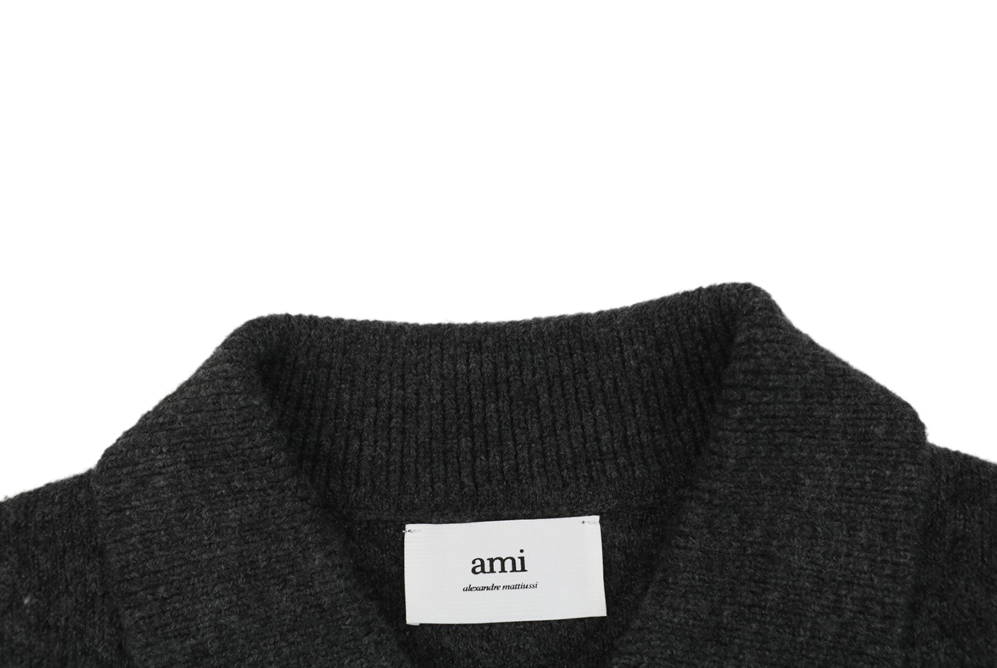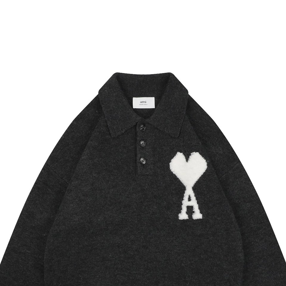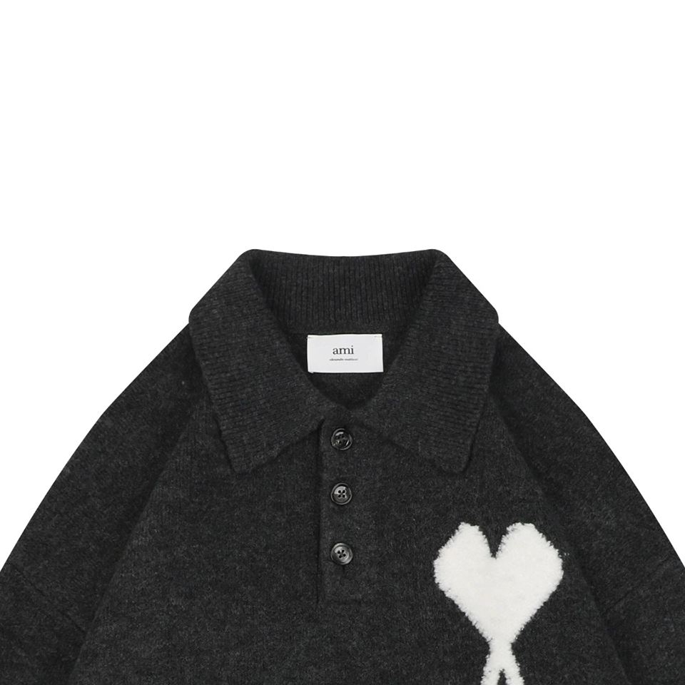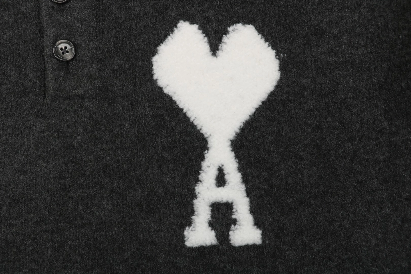 The Ami Heart Logo Polo Sweater is crafted from a premium custom blended yarn composed of 50% cashmere, 40% cotton, and 10% nylon. The added nylon enhances structure and smooth texture, giving the sweater a refined, luxurious feel. Produced using a highly complex knitting process, the sweater goes through multi-stage treatments including fiber brushing, special washing, shaping, and precise linking done entirely by hand. Knitted on a 5-gauge imported STOLL machine with a slow production rhythm, each sweater requires over 110 minutes to complete, ensuring exceptional craftsmanship. The heart logo is achieved through an intricate intarsia technique, closely replicating the original designer look. Custom buffalo horn buttons and fully replicated washing labels further complete the premium detailing. Suitable for both men and women, this sweater offers comfort, warmth, and high-end texture.