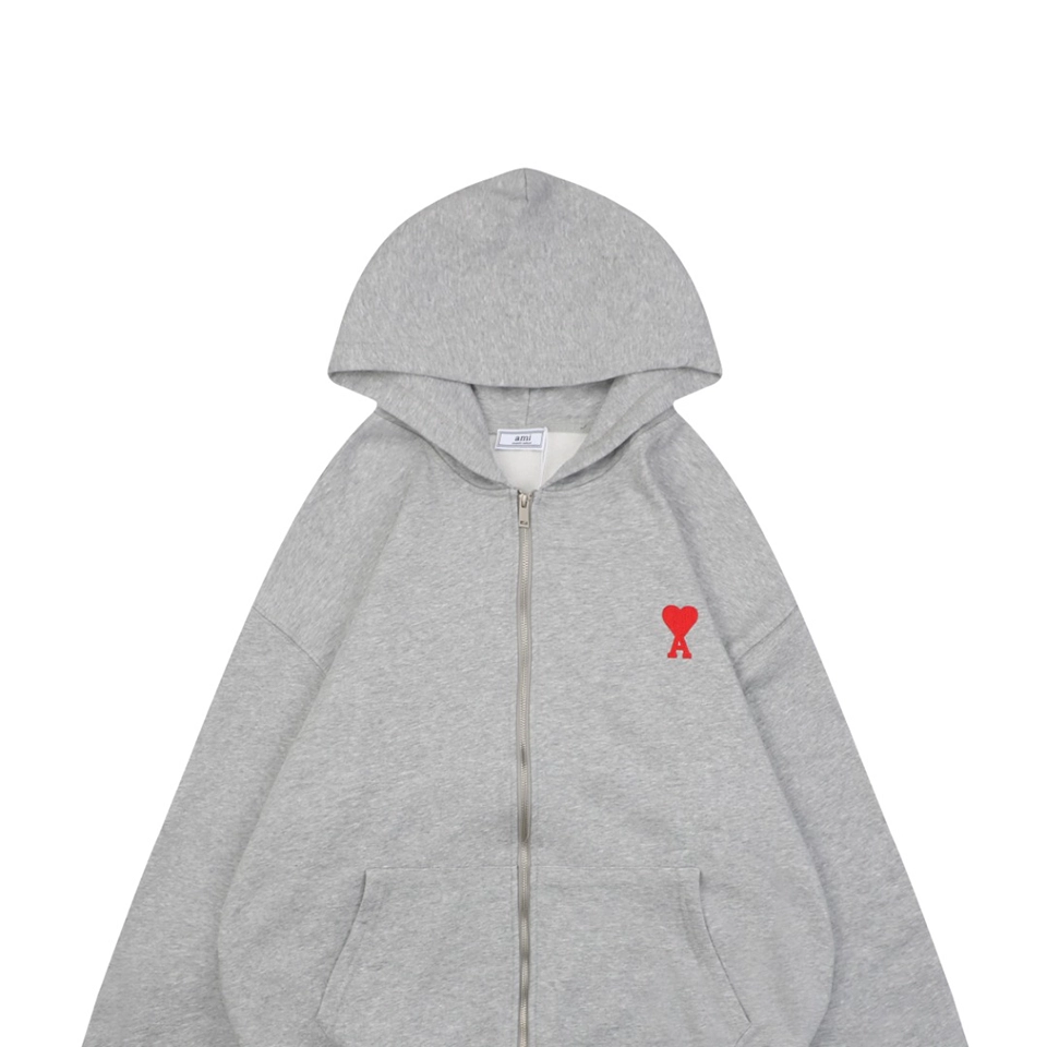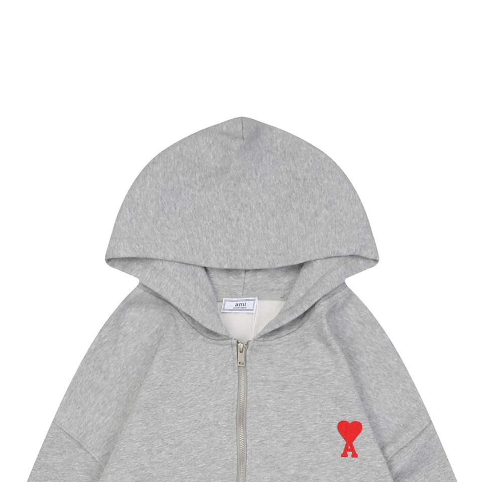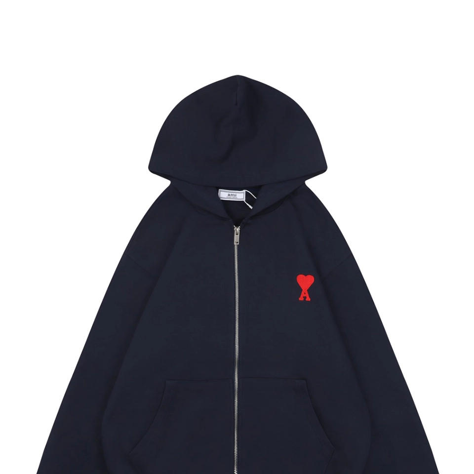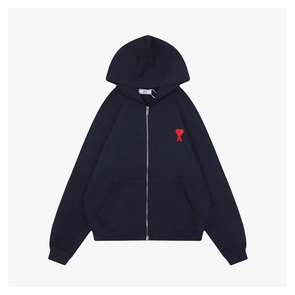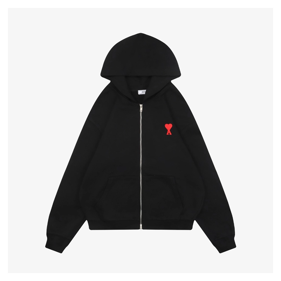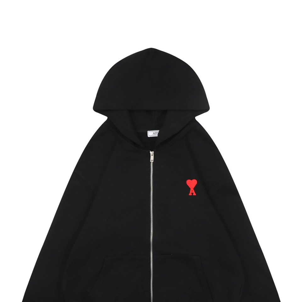 The Ami Paris Heart Logo Embroidered Zip-Up Hoodie is crafted from a premium 400g double-yarn terry cotton fabric, offering a soft, skin-friendly touch with outstanding durability. The hoodie features custom-woven 32s ribbing and undergoes a double-wash finishing process to enhance comfort, color depth, and long-lasting shape retention.