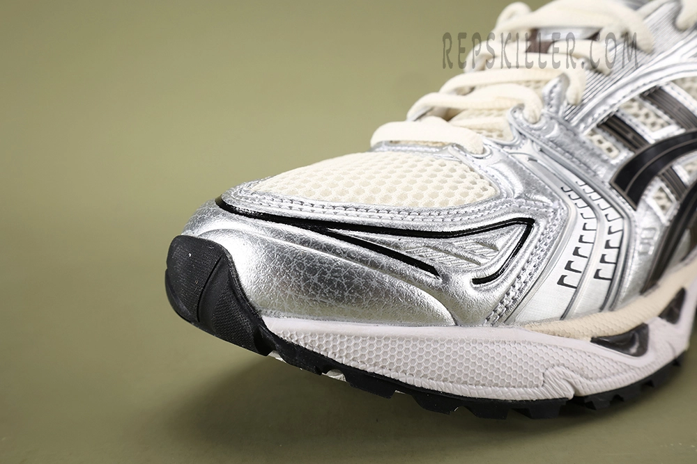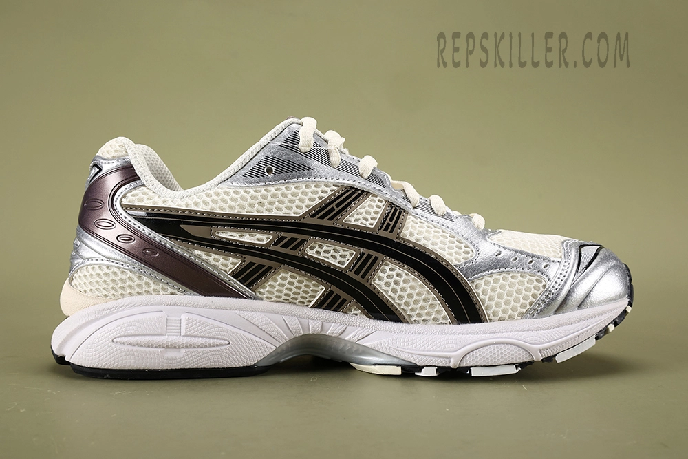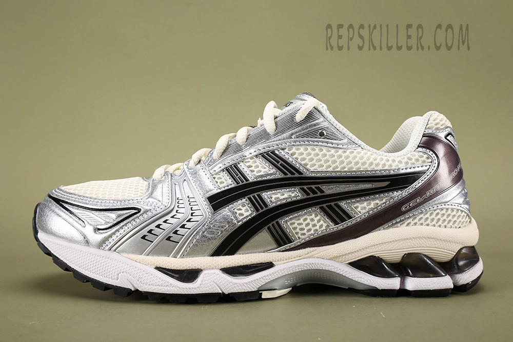 The upper of the Cream Black Metallic Plum ASICS Gel-Kayano 14 is crafted with a combination of leather and mesh materials, offering both durability and breathability. The shoe comes in a cream-and-black colorway and has a traditional lace-up closure that ensures a snug and secure fit. The outsole features a vertical flex groove that enables the foot to move more naturally, reducing stress on the foot and the potential for injury.