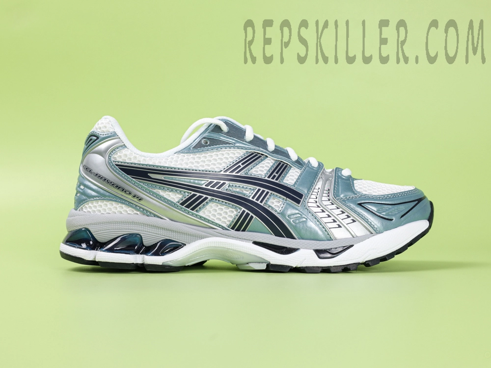 The ASICS GEL-KAYANO 14 “White/Fjord Grey” merges early 2000s design aesthetics with modern performance technology. Drawing inspiration from the original 2008 model, this sneaker features a white mesh upper complemented by silver and light blue synthetic overlays, creating a fresh and tech-inspired look. Black Tiger Stripes on the sides add depth to the design.