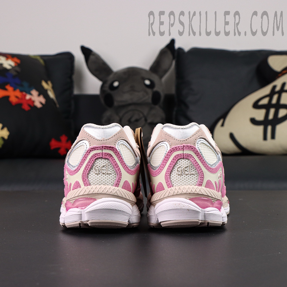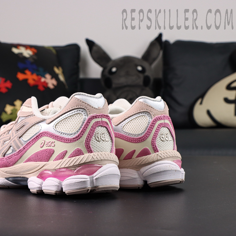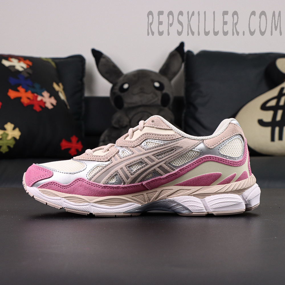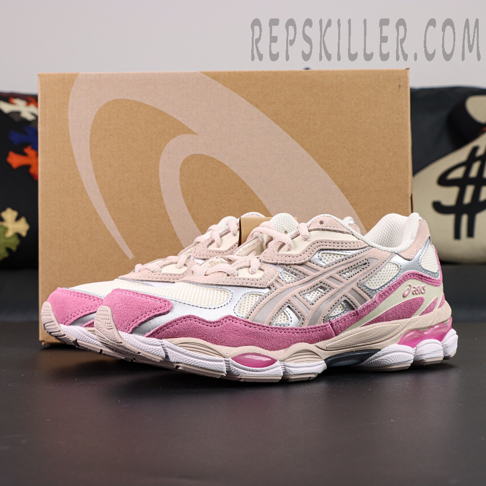 The ASICS Gel NYC ‘Cream Pink’ showcases a soft, feminine look with a cream mesh upper and pink synthetic suede overlays. Silver ASICS stripes with light pink outlines add a touch of contrast, while the embroidered spiral logo on the tongue completes the design. A two-tone EVA midsole with visible Gel cushioning in the forefoot and heel delivers lightweight comfort and smooth support for everyday wear.