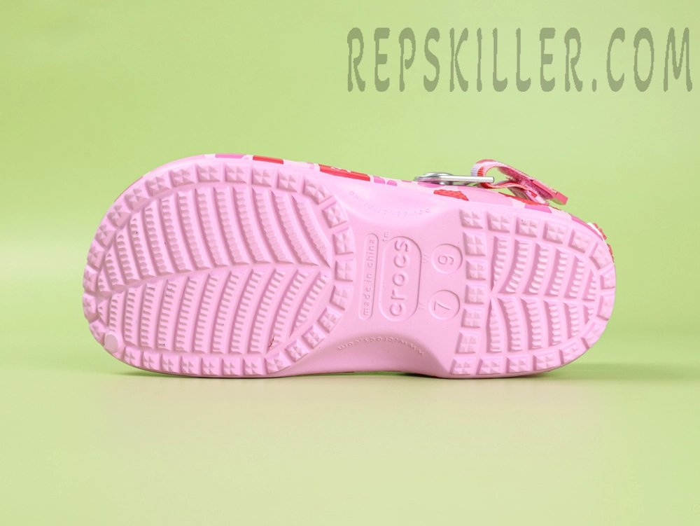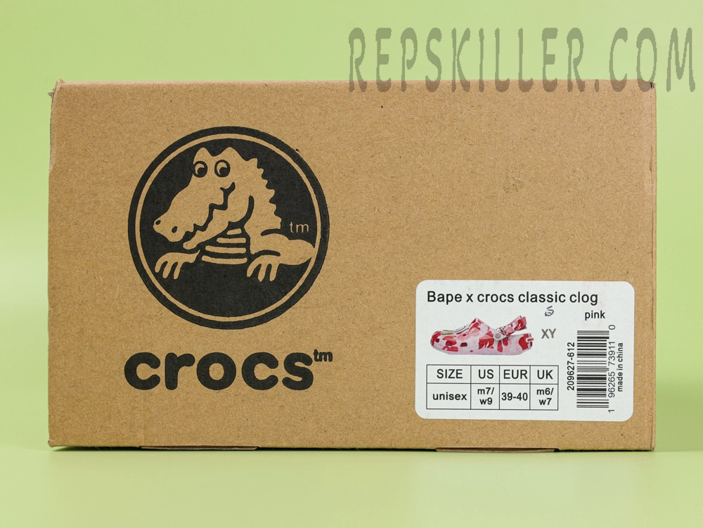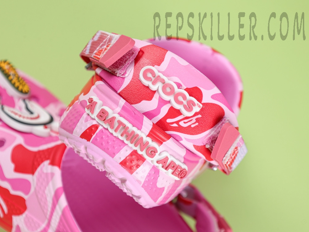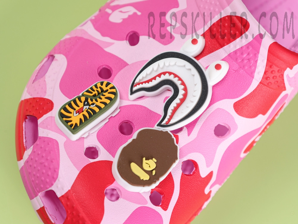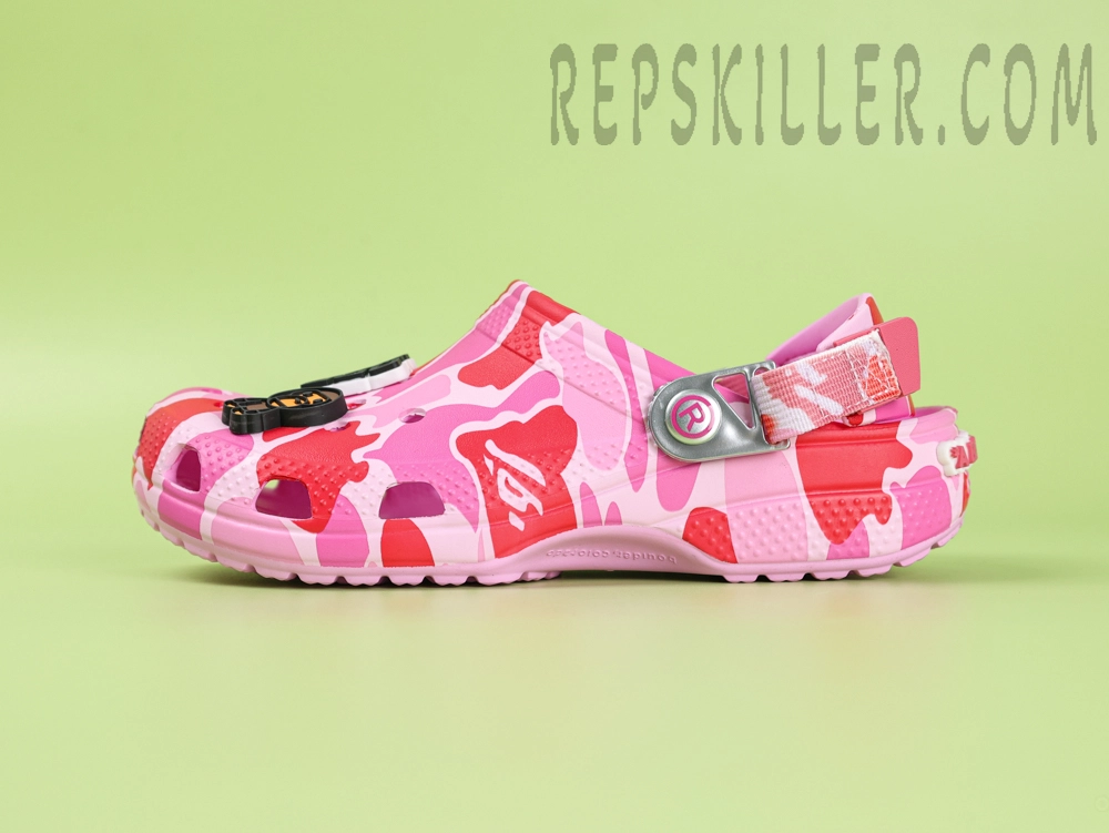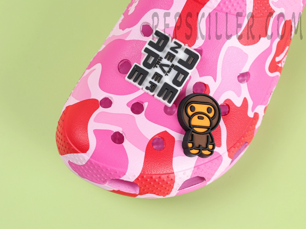 The BAPE x Crx Classic Clog “ABC Camo Pink” transforms Crx’ iconic foam silhouette with vibrant pink and red ABC camo print adorning the full Croslite upper. It features a secure, pivoting strap printed with “Crx”, and the heel is embossed with “A BATHING APE” branding. A set of exclusive BAPE-themed Jibbitz charms (including Ape Head, Baby Milo, Shark, Tiger & “Ape Shall Never Kill Ape”) allows for unique personalization. The clog preserves signature comfort with ventilation holes, a textured footbed, and a non-slip Croslite outsole, seamlessly merging bold streetwear visuals with lightweight wearability.