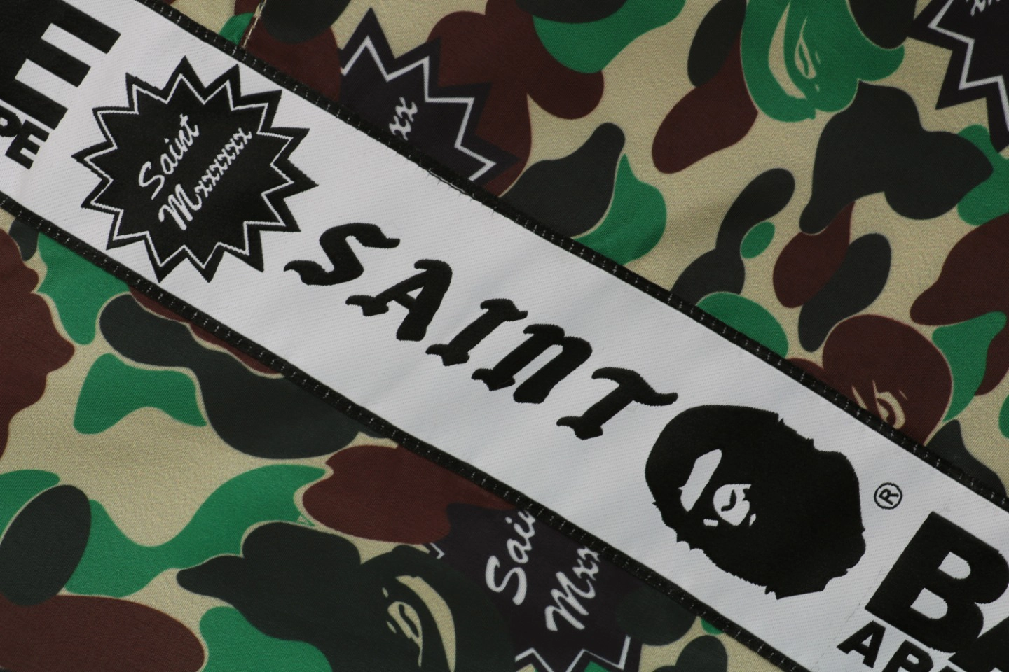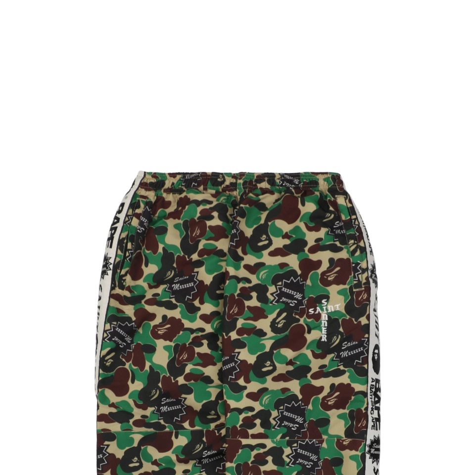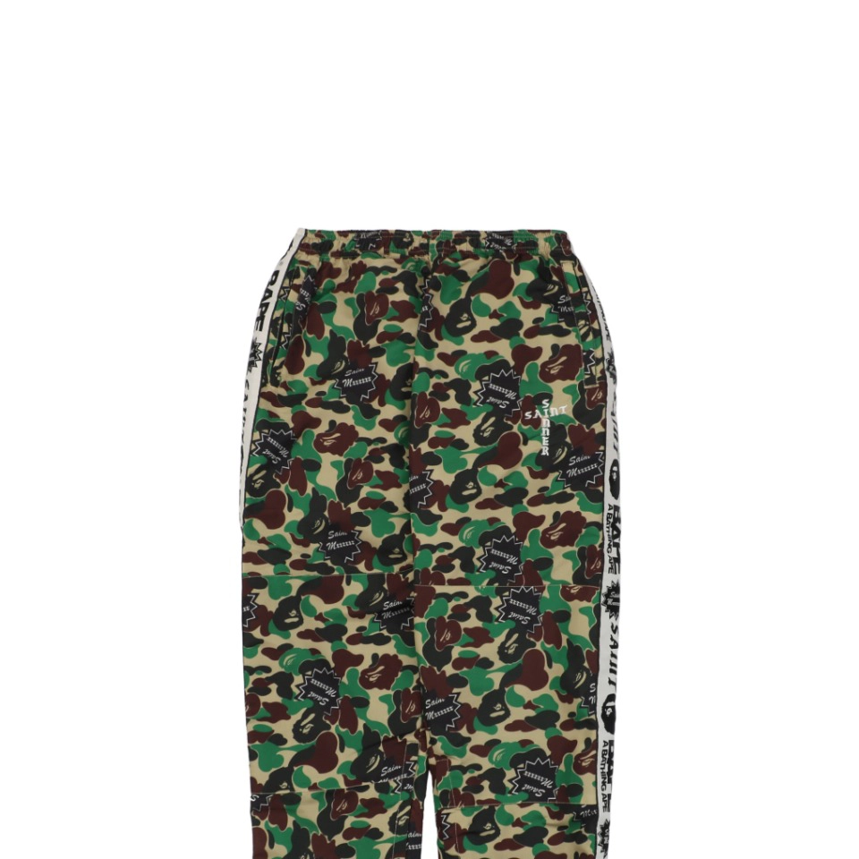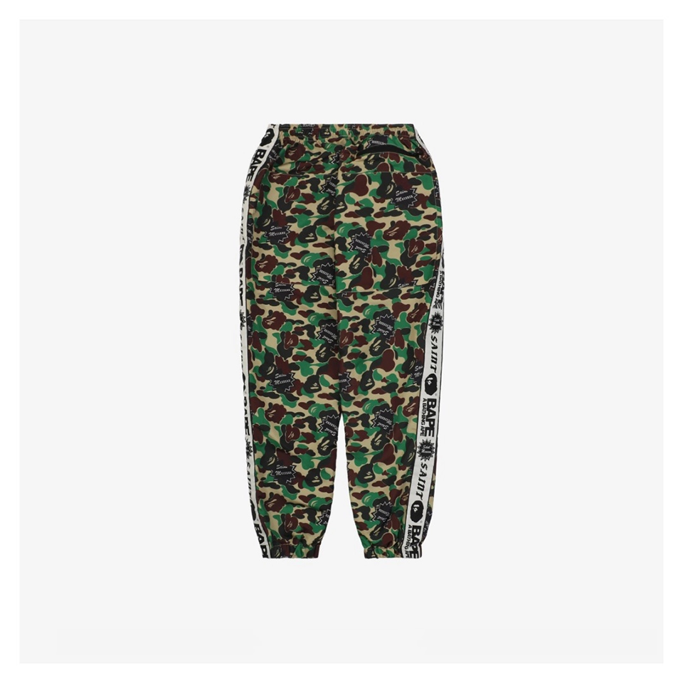 The Bape × Saint Michael Collaborative Logo Tape Camo Track Pants are crafted from custom-woven and custom-dyed camouflage fabric with rich colors and crisp pattern definition. Featuring signature co-branded logo tape along the sides and a relaxed tapered silhouette, these track pants deliver a bold streetwear aesthetic. High-density woven construction and premium accessories ensure a structured, comfortable fit that reflects the quality of the collaboration.