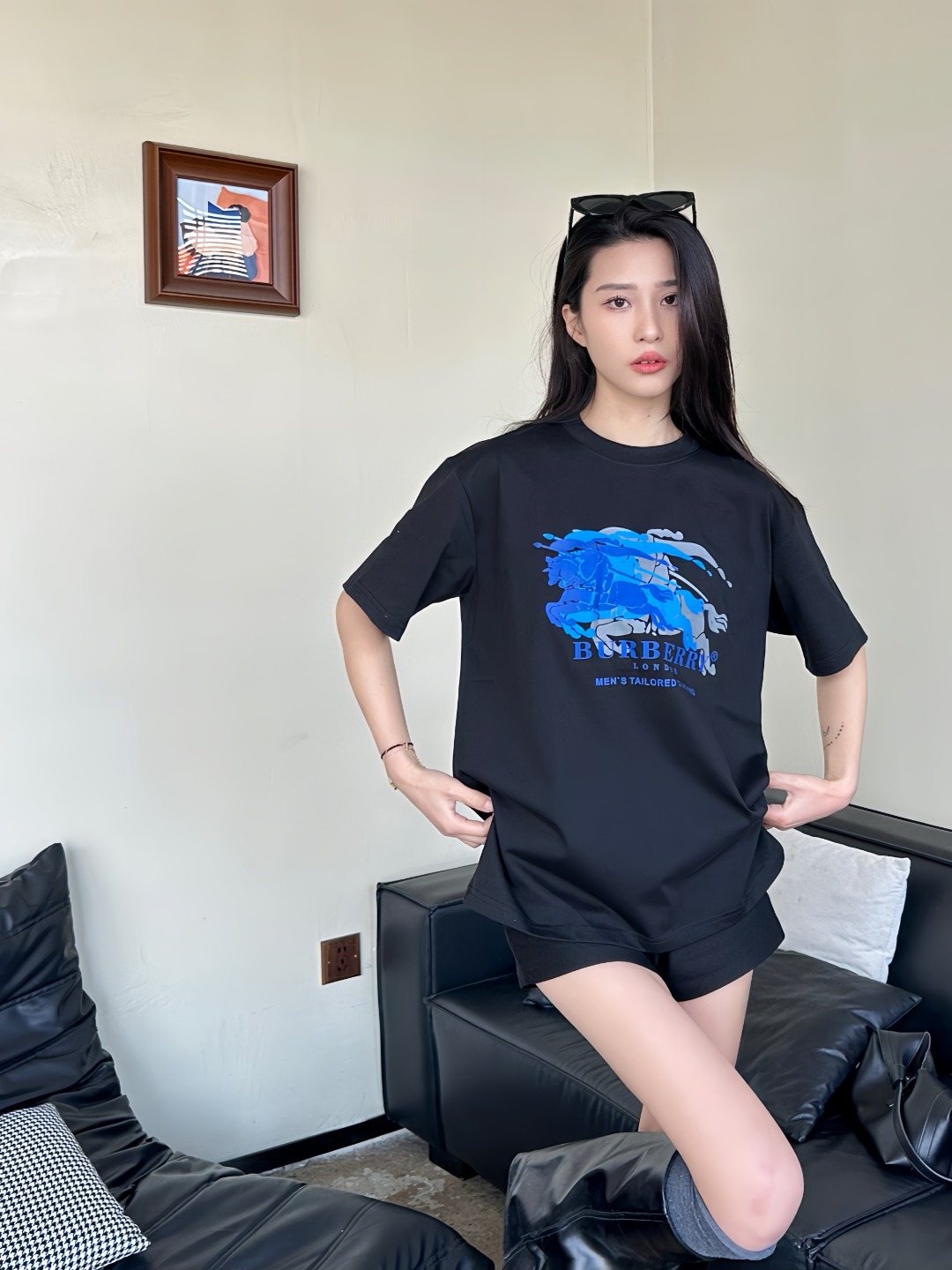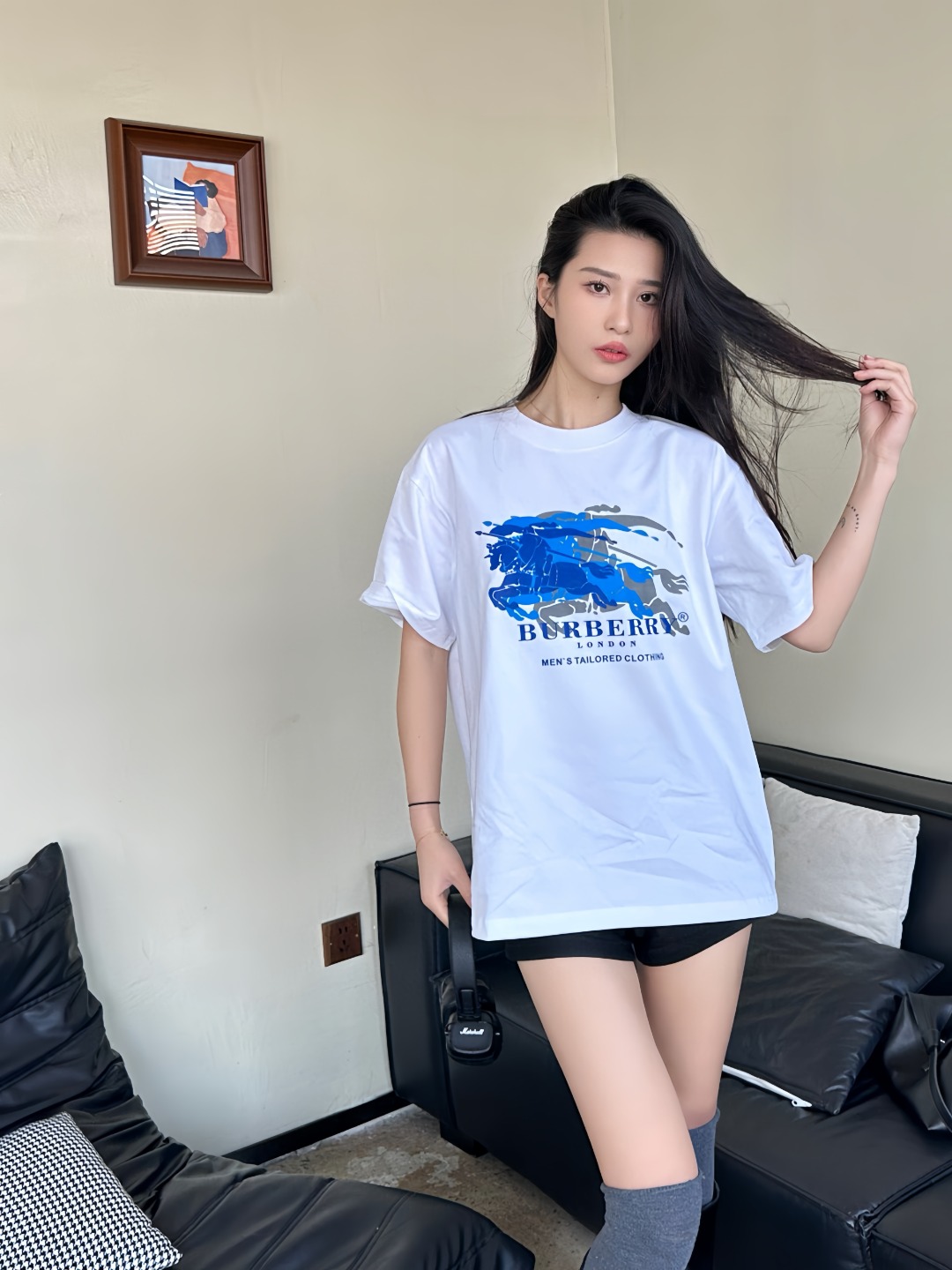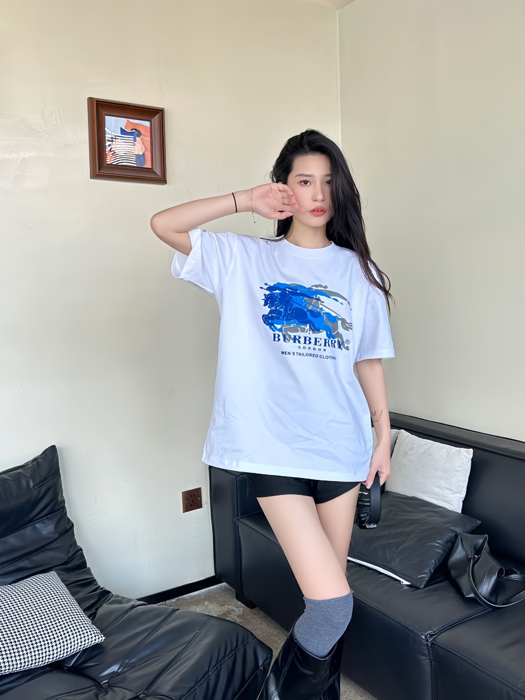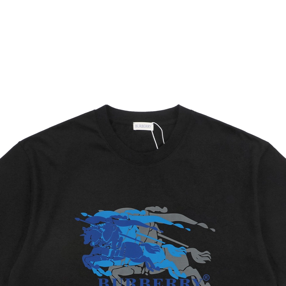 The BBry Blue Equestrian Knight Overprint T-Shirt reimagines the house’s heritage crest through a contemporary lens. Crafted from midweight breathable cotton, the tee features a multi-layered blue tonal graphic of the iconic knight-and-horse motif across the chest—giving the illusion of movement and depth. With a clean crew neckline and a relaxed straight cut, this piece seamlessly fuses archival identity with a modern, street-ready silhouette.