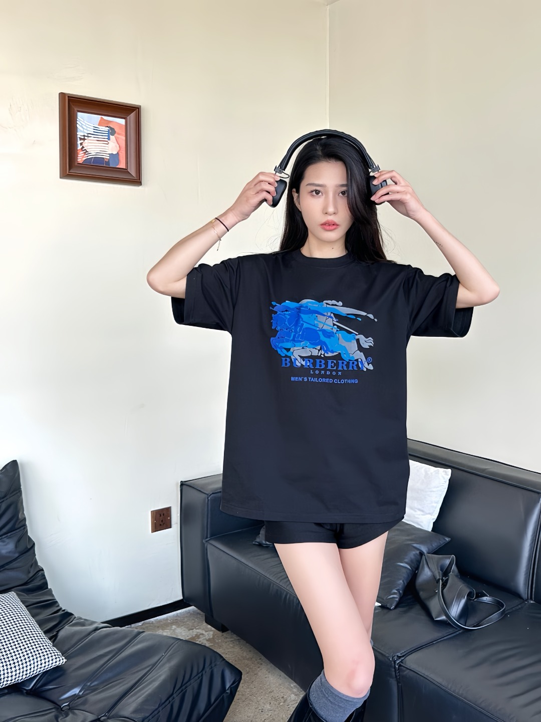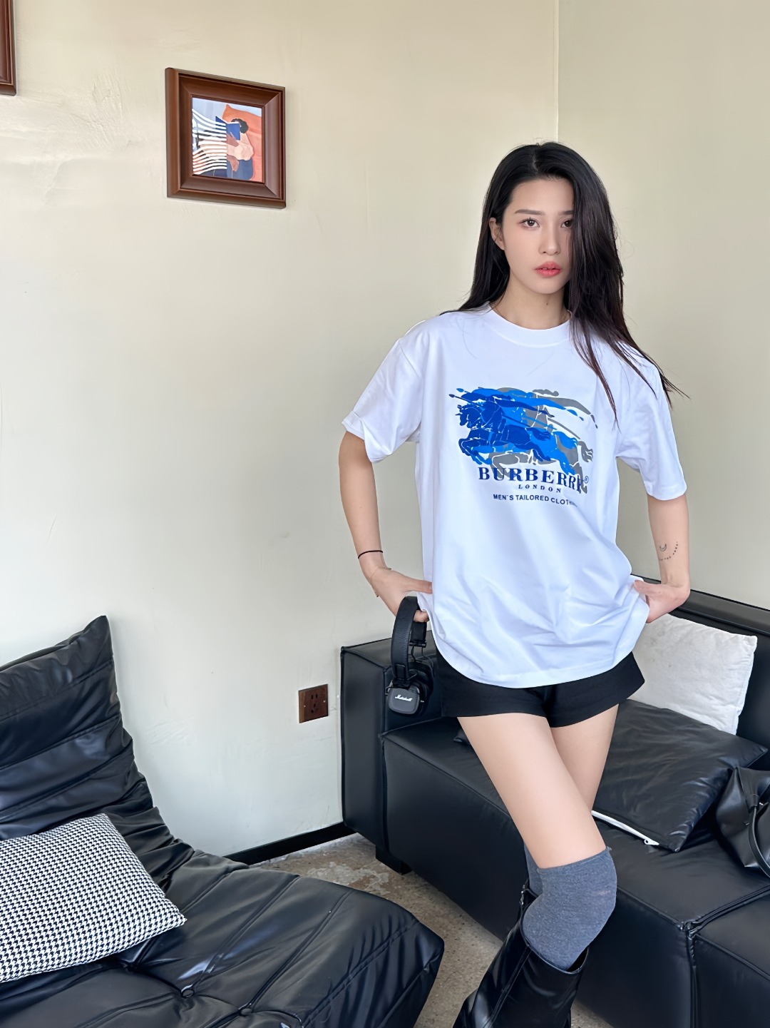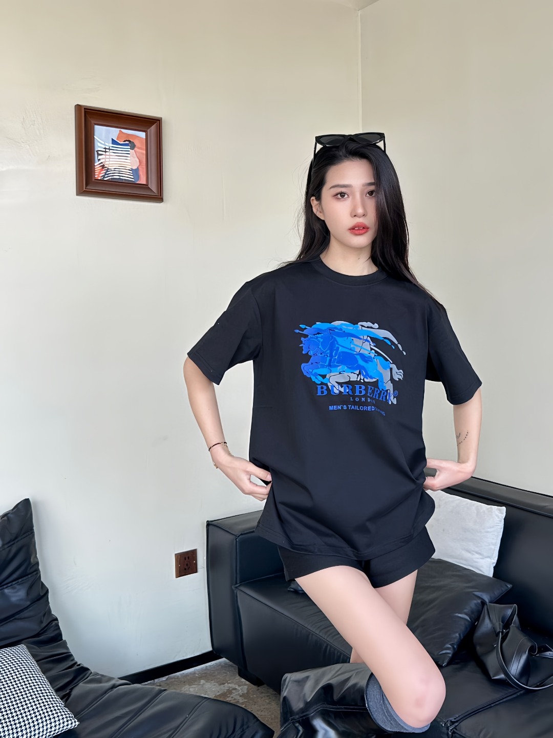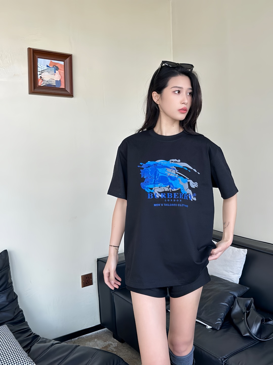 The BBry Blue Equestrian Knight Overprint T-Shirt reimagines the house’s heritage crest through a contemporary lens. Crafted from midweight breathable cotton, the tee features a multi-layered blue tonal graphic of the iconic knight-and-horse motif across the chest—giving the illusion of movement and depth. With a clean crew neckline and a relaxed straight cut, this piece seamlessly fuses archival identity with a modern, street-ready silhouette.