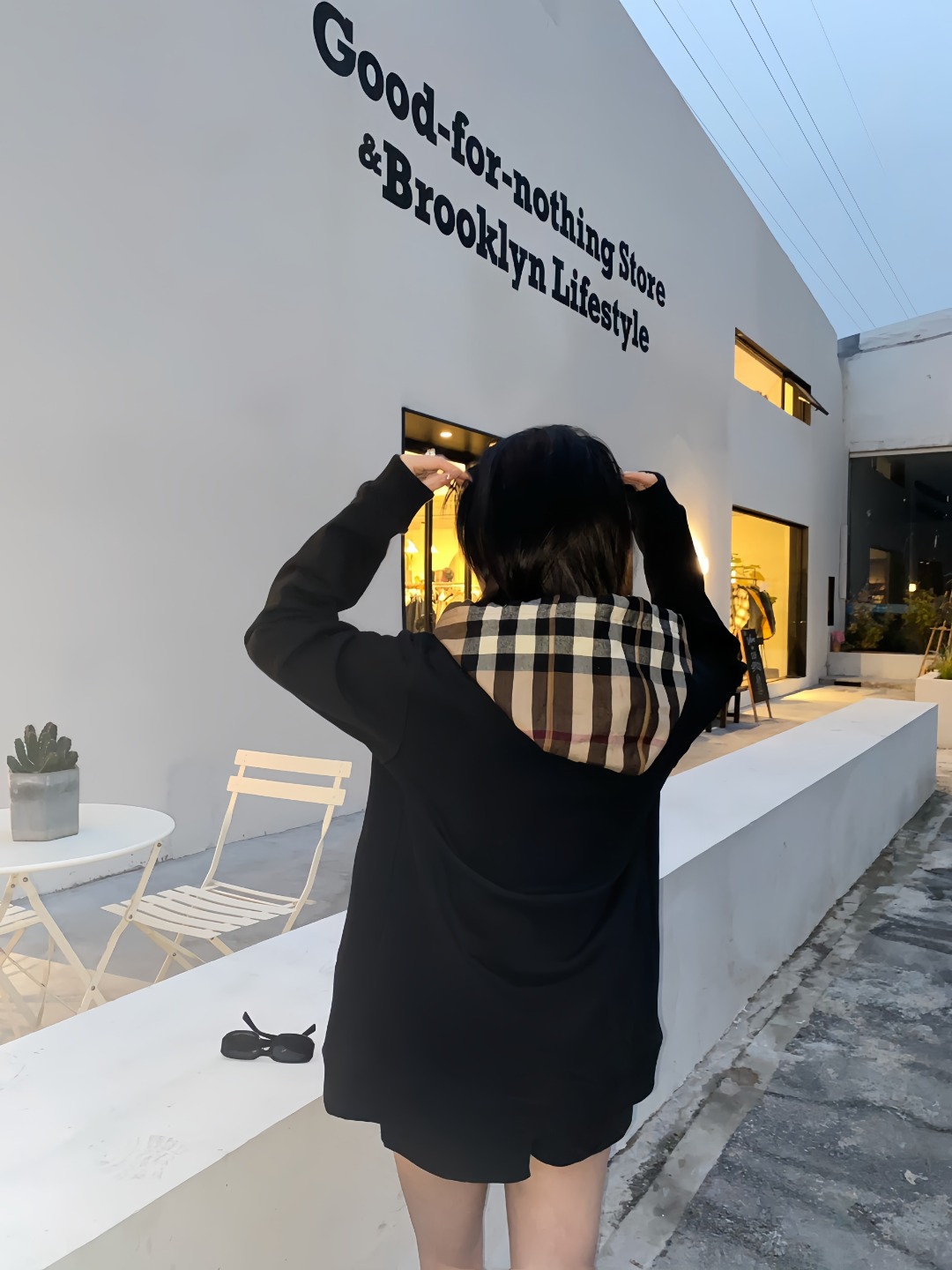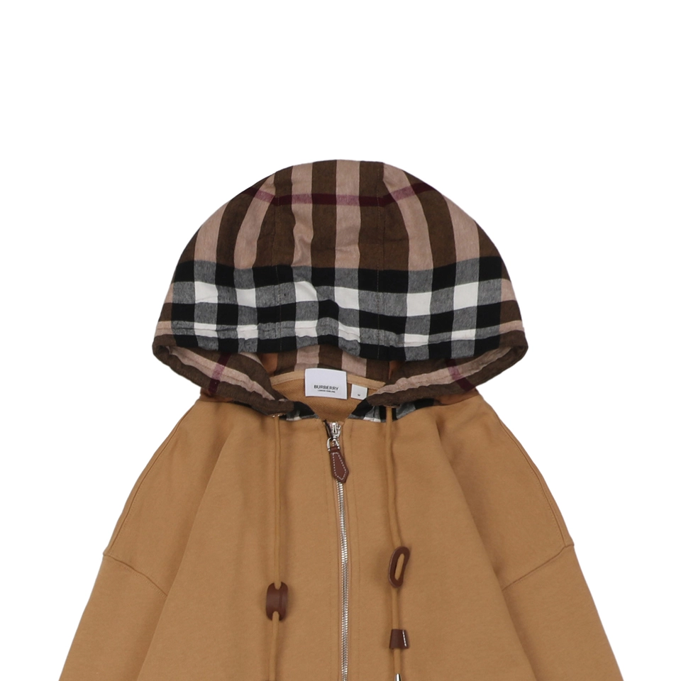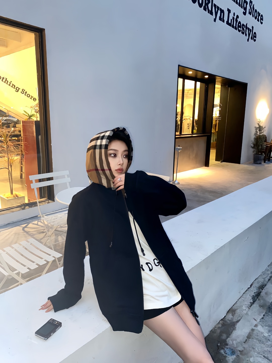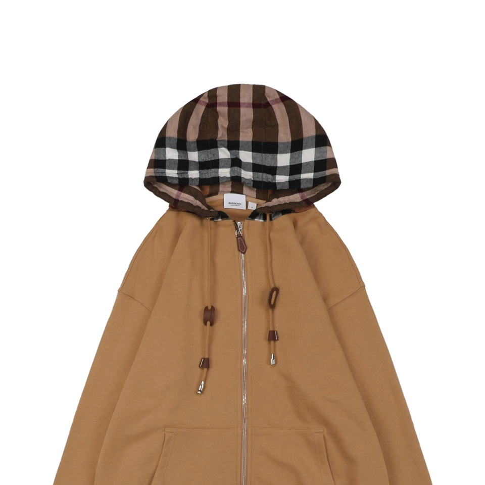 The hood features BBry’s signature contrast flannel check lining, made from 100% coarse-spun cotton for a thick, premium hand feel. The hood is fully padded rather than single-layered, enhancing warmth and structure. Leather-detailed drawstrings, copper eyelets, and branded zipper hardware elevate the overall craftsmanship. Precision-matched check patterns ensure perfect symmetry across each hood panel, reflecting meticulous production standards. Designed for both men and women, this zip-up jacket is a versatile statement piece suitable for everyday wear and seasonal layering.