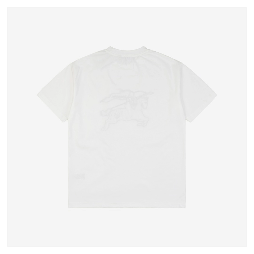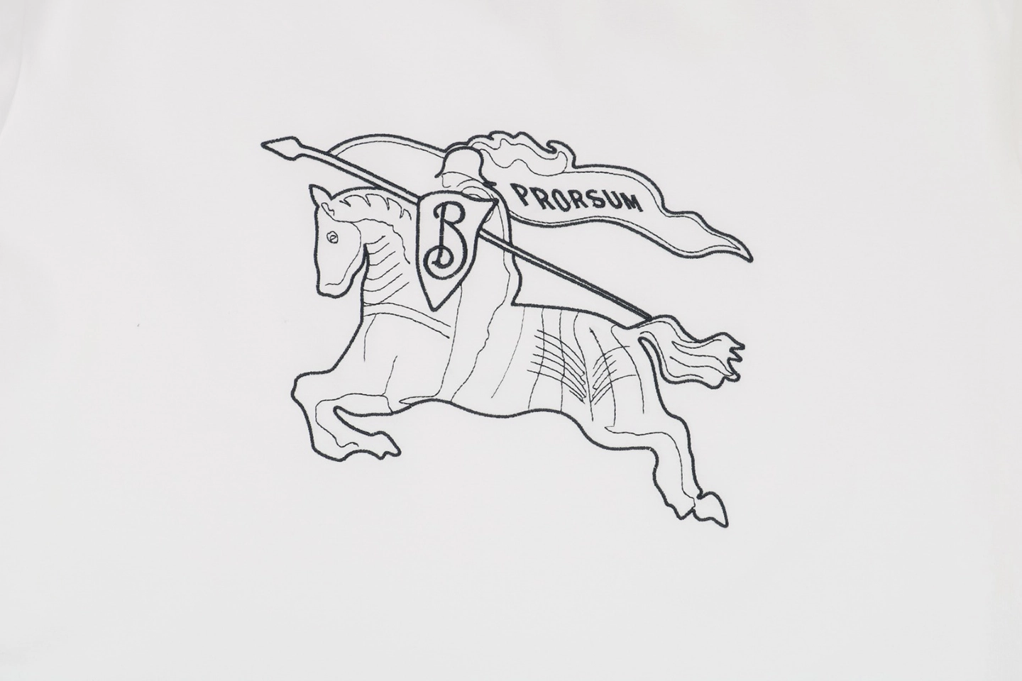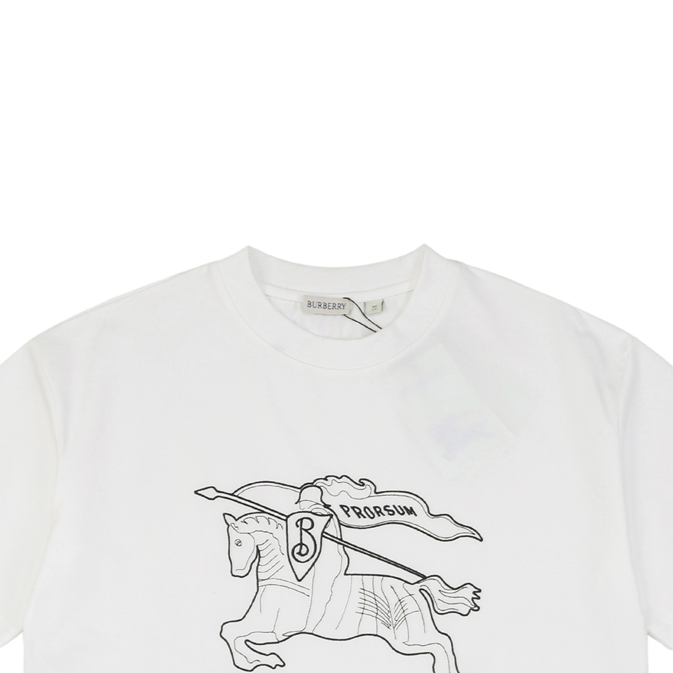 The BBry Equestrian Knight Embroidery T-shirt features a clean white base with a striking line-art embroidery of the iconic knight on horseback. Crafted from premium cotton, it ensures softness and breathability. The minimalist design is enhanced by the intricate stitching, offering a blend of heritage and contemporary streetwear style.