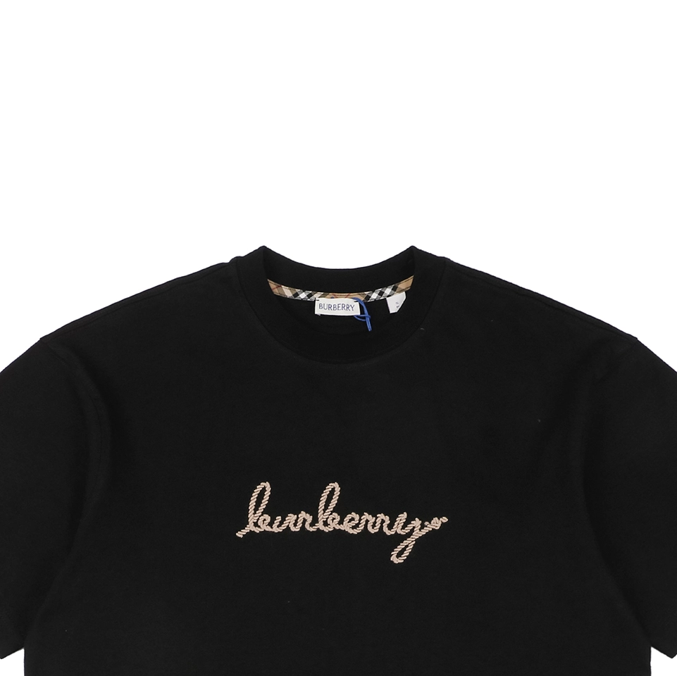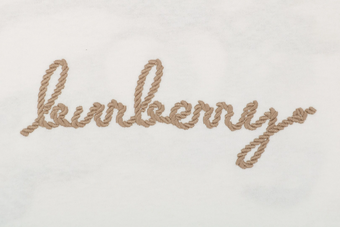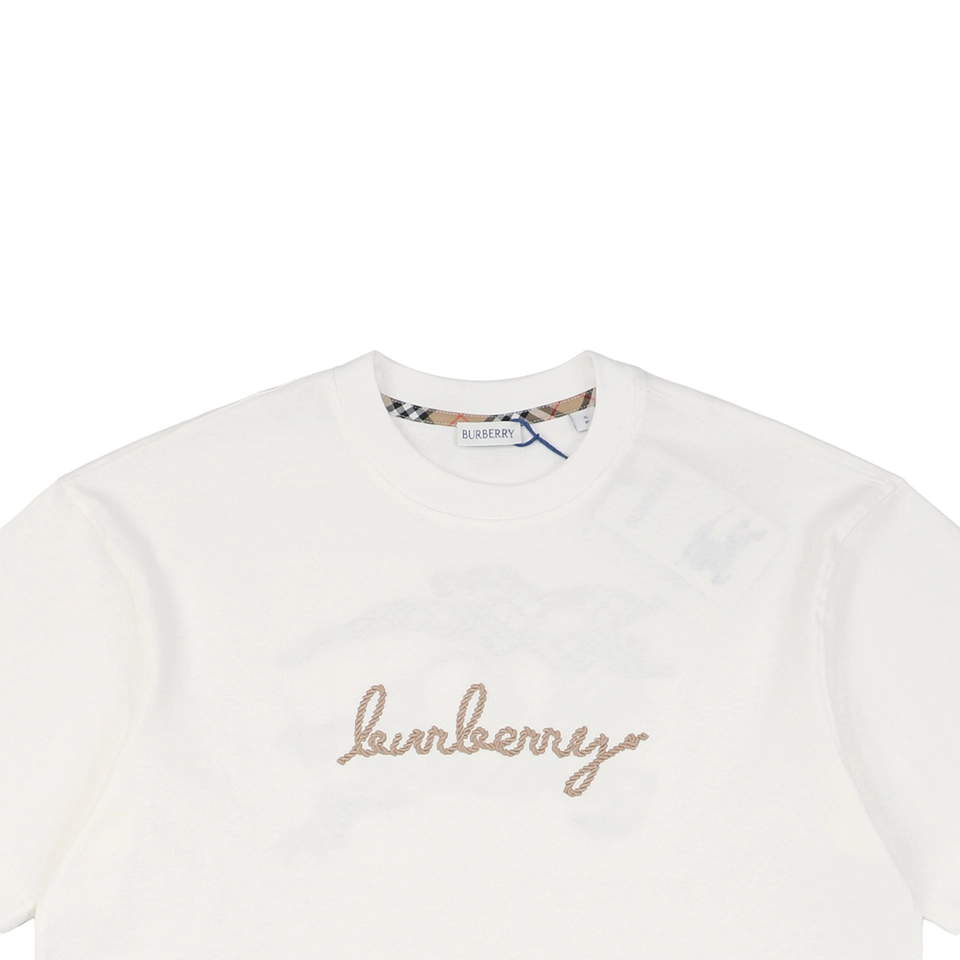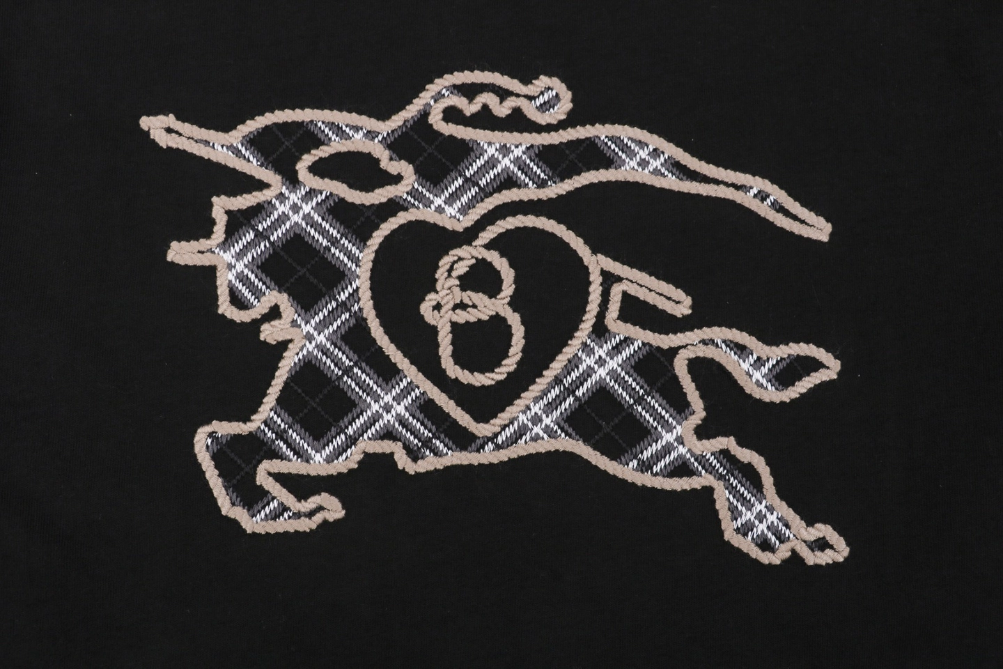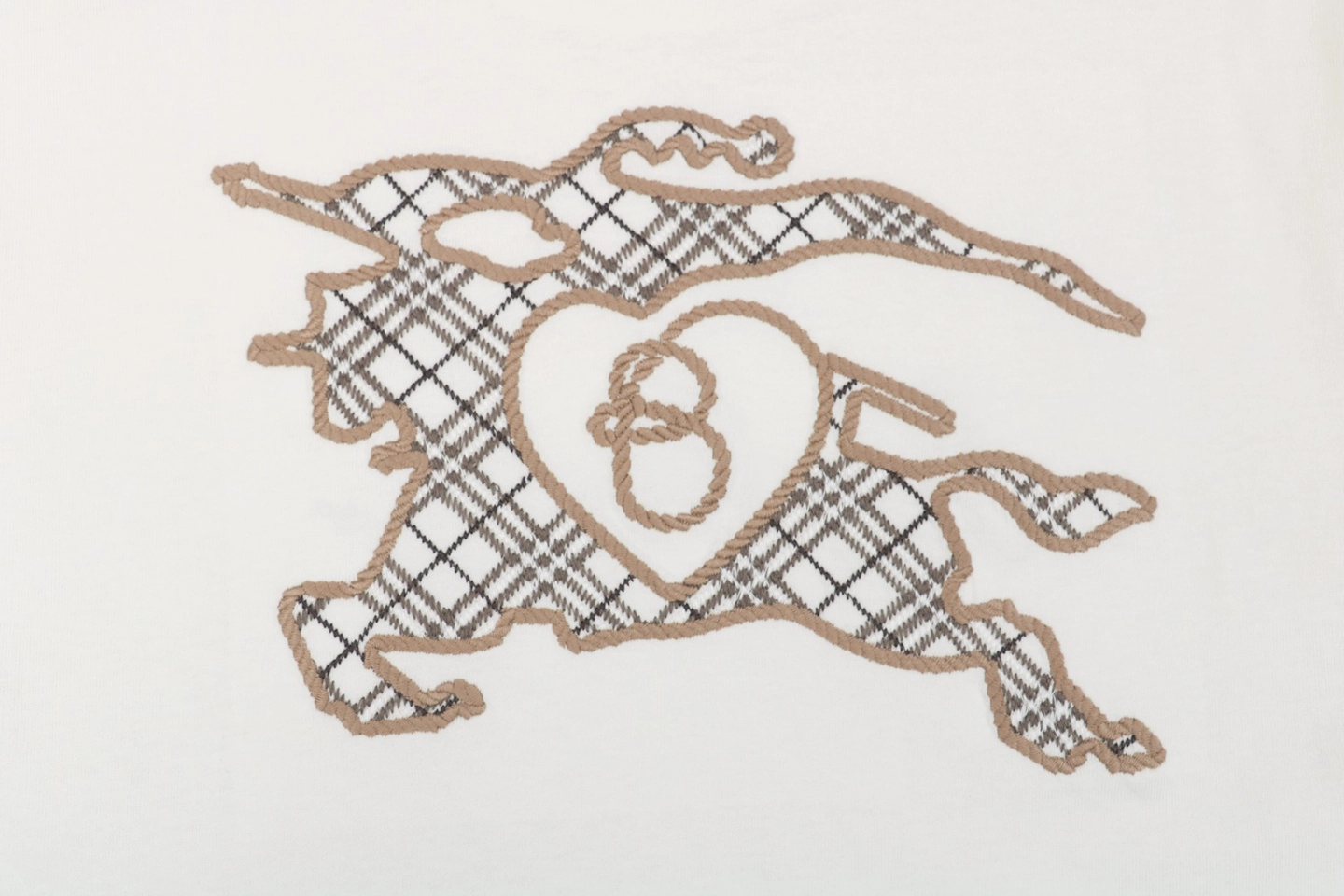 The BBry Love Rope Equestrian Embroidery T-shirt presents a refined take on the classic logo tee. The front showcases a delicate cursive BBry embroidery, while the back features an exquisite reimagining of the equestrian knight, formed with rope-like outlines and a plaid-inspired heart at the center. This elegant balance of heritage and contemporary flair makes it a sophisticated staple for any wardrobe.