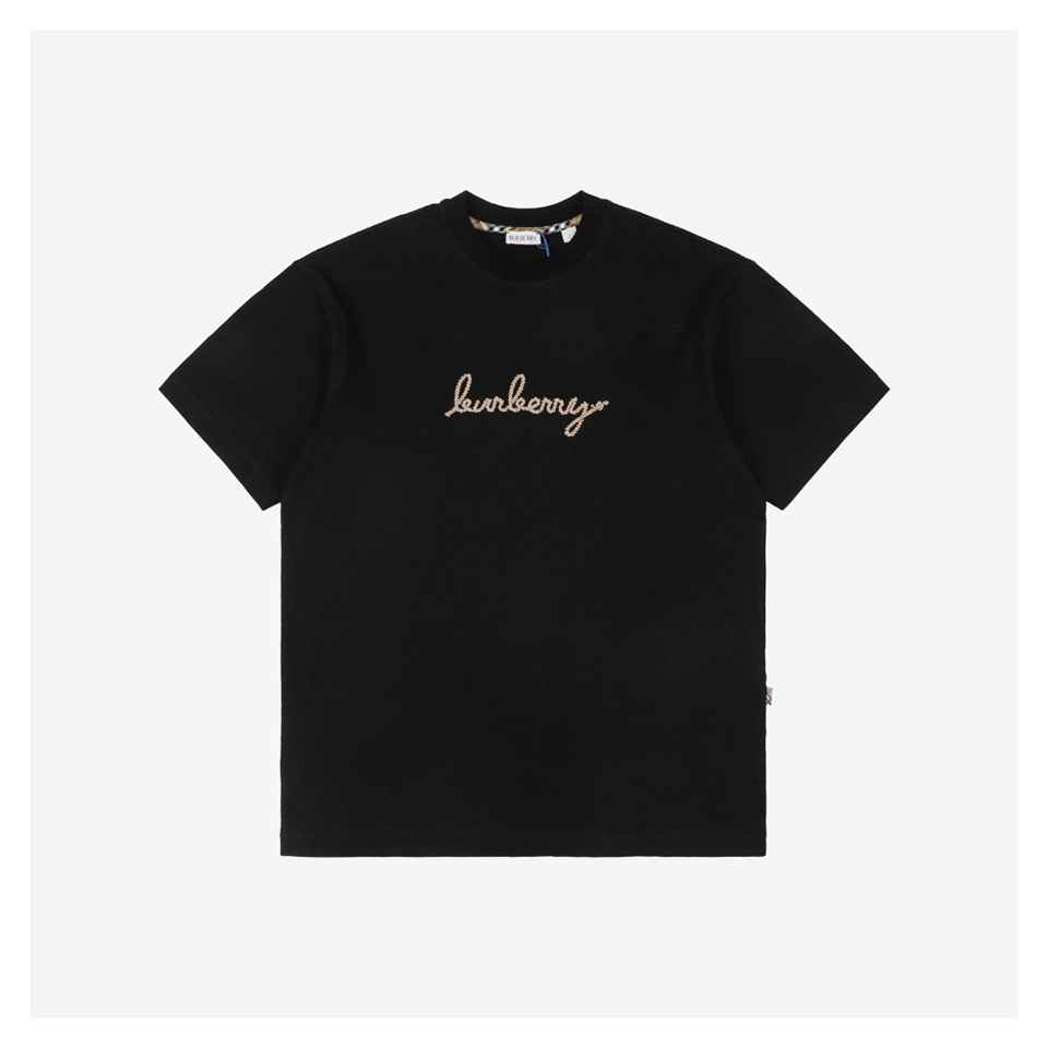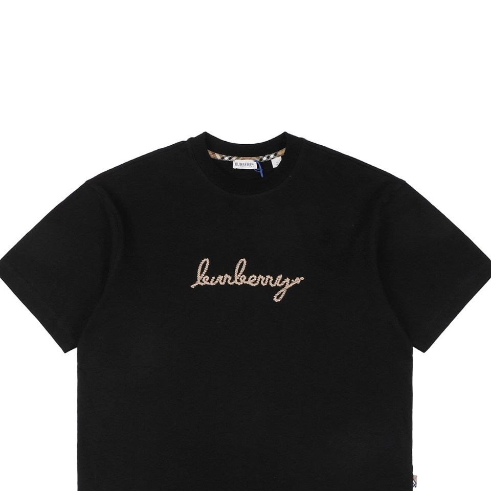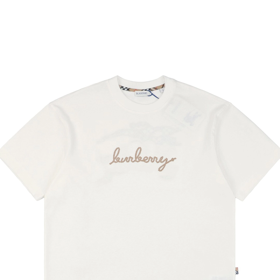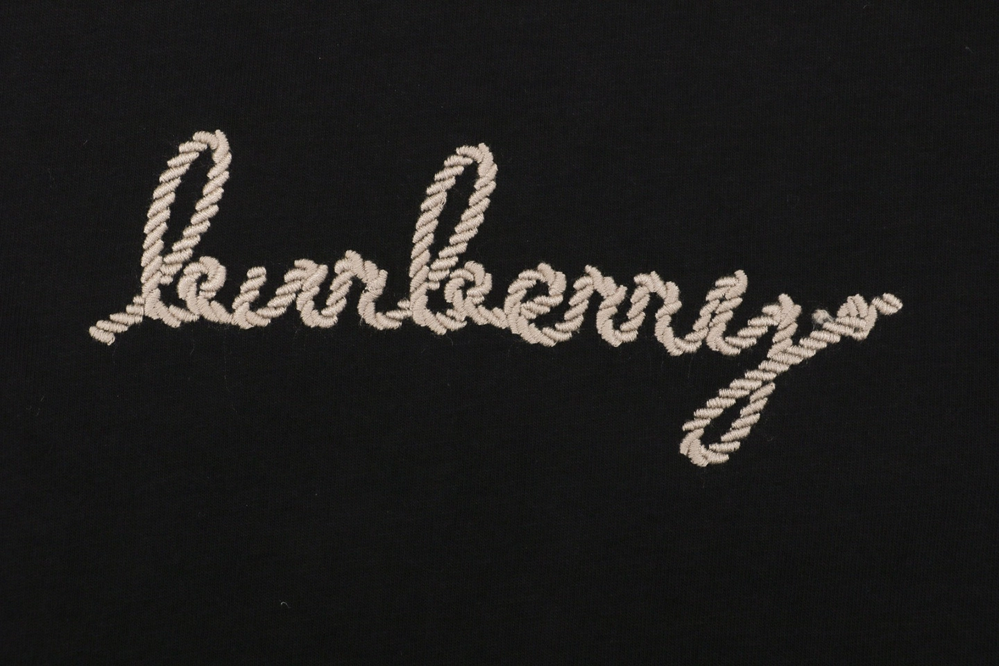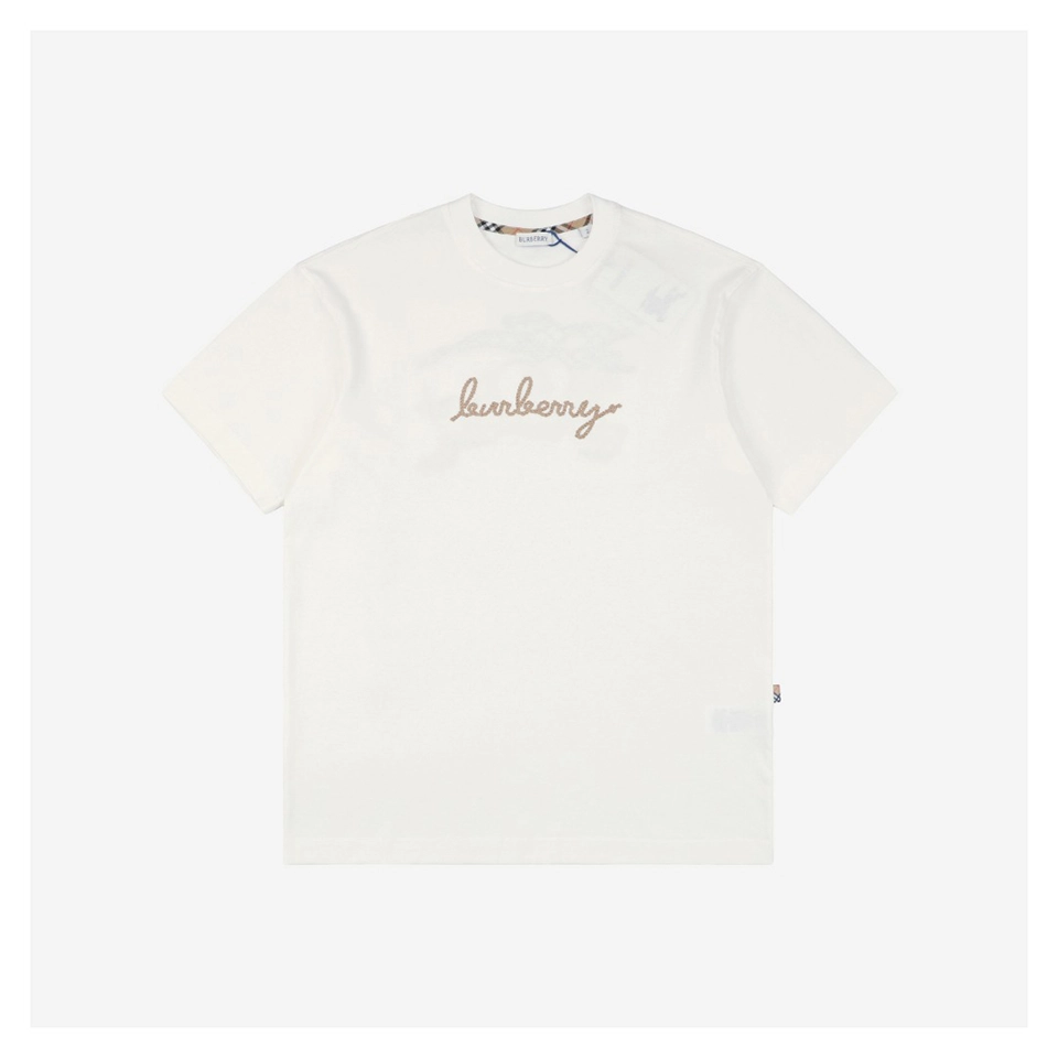 The BBry Love Rope Equestrian Embroidery T-shirt presents a refined take on the classic logo tee. The front showcases a delicate cursive BBry embroidery, while the back features an exquisite reimagining of the equestrian knight, formed with rope-like outlines and a plaid-inspired heart at the center. This elegant balance of heritage and contemporary flair makes it a sophisticated staple for any wardrobe.