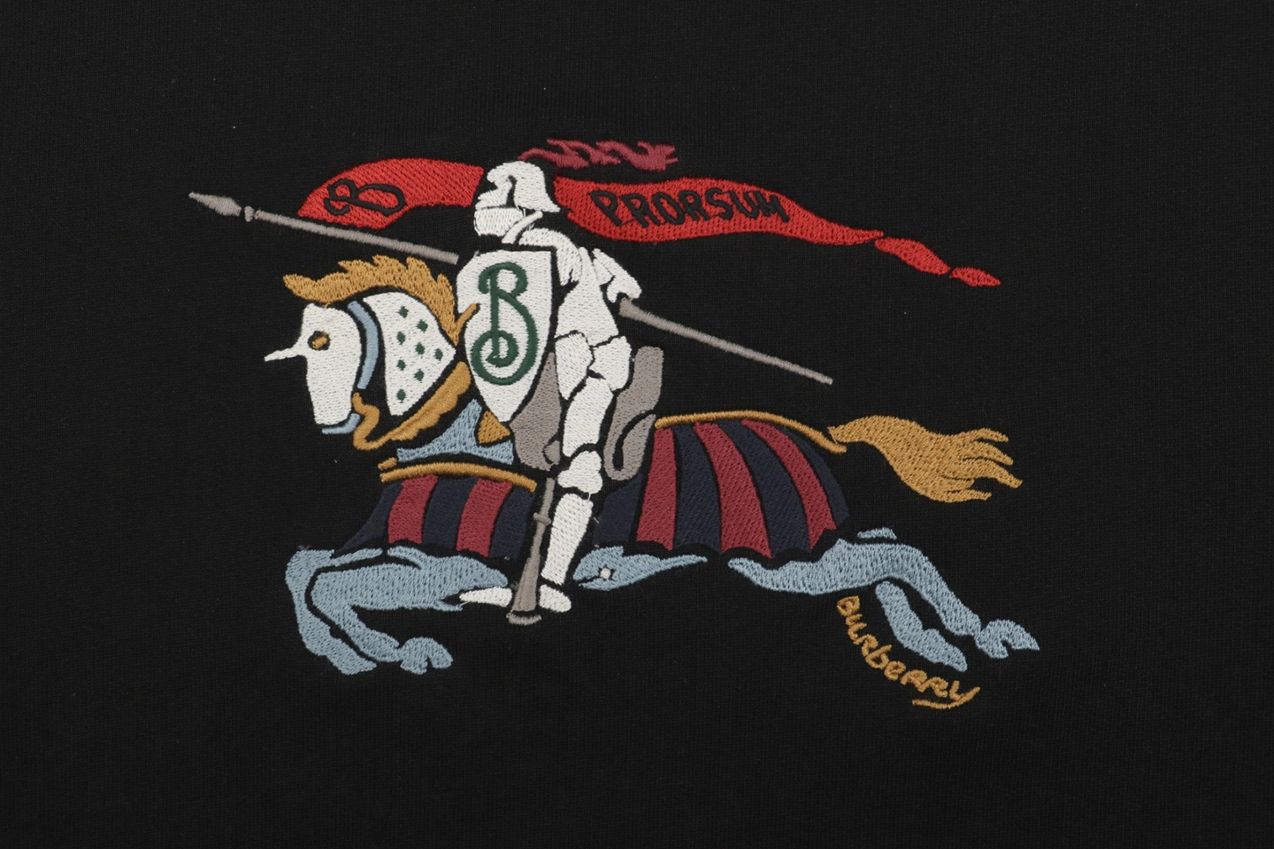 The BBry Multicolor Equestrian Knight Embroidered Sweatshirt pays tribute to the house’s heritage with a vibrant twist. Cut from premium cotton fleece, it features a classic crewneck silhouette and a bold, colorful embroidery of the iconic equestrian knight on the chest. The rich stitching details and oversized proportions strike a balance between legacy and contemporary streetwear, making it a standout in any casual rotation.