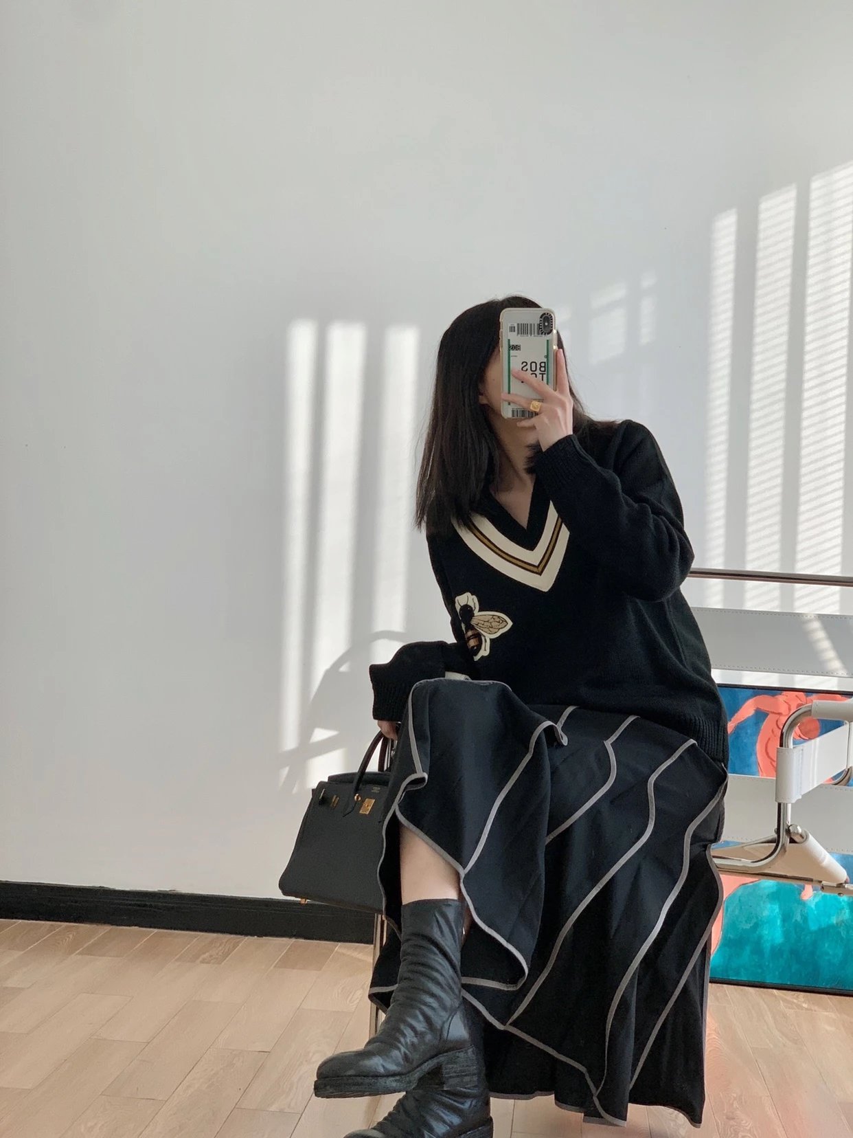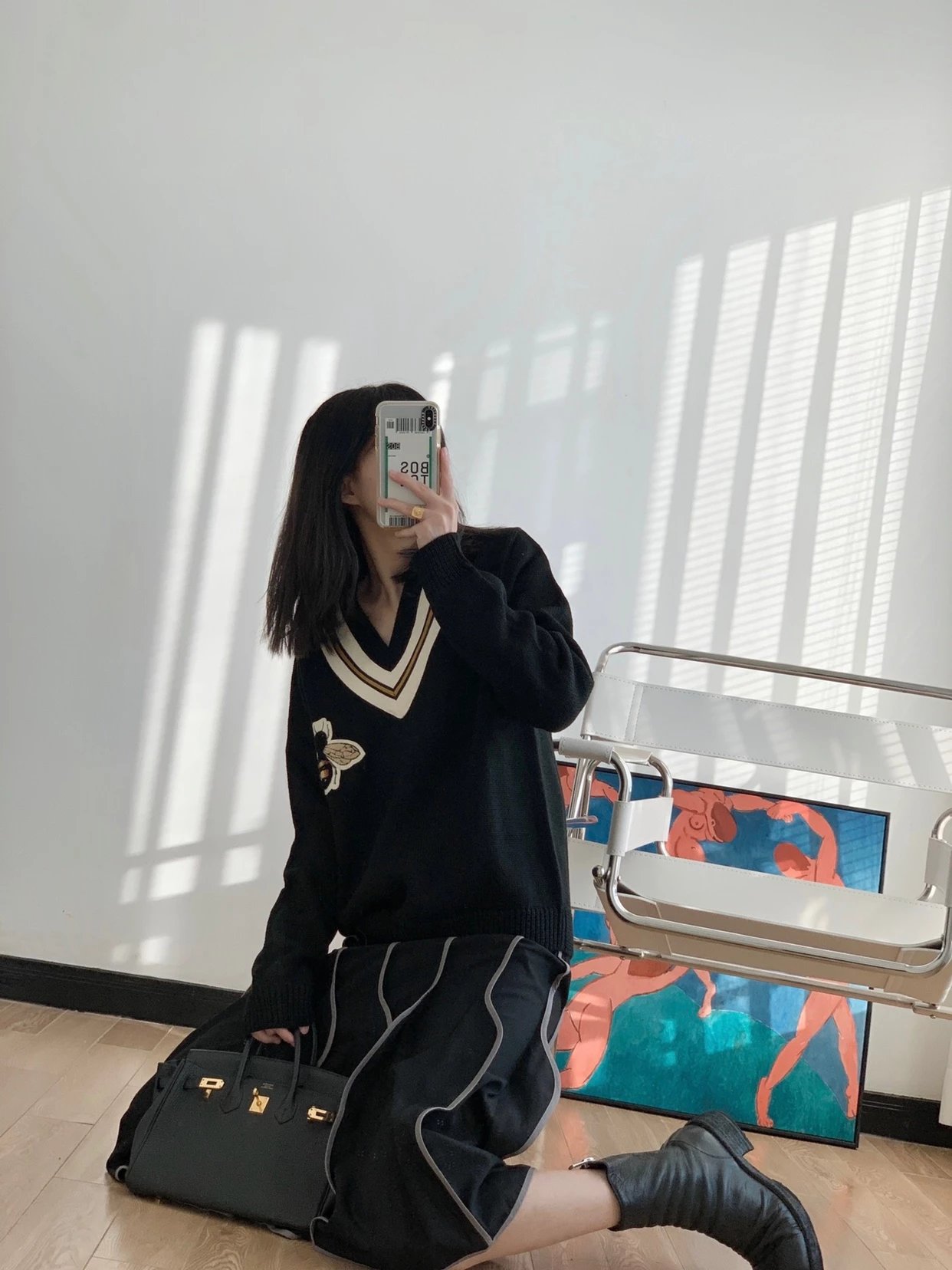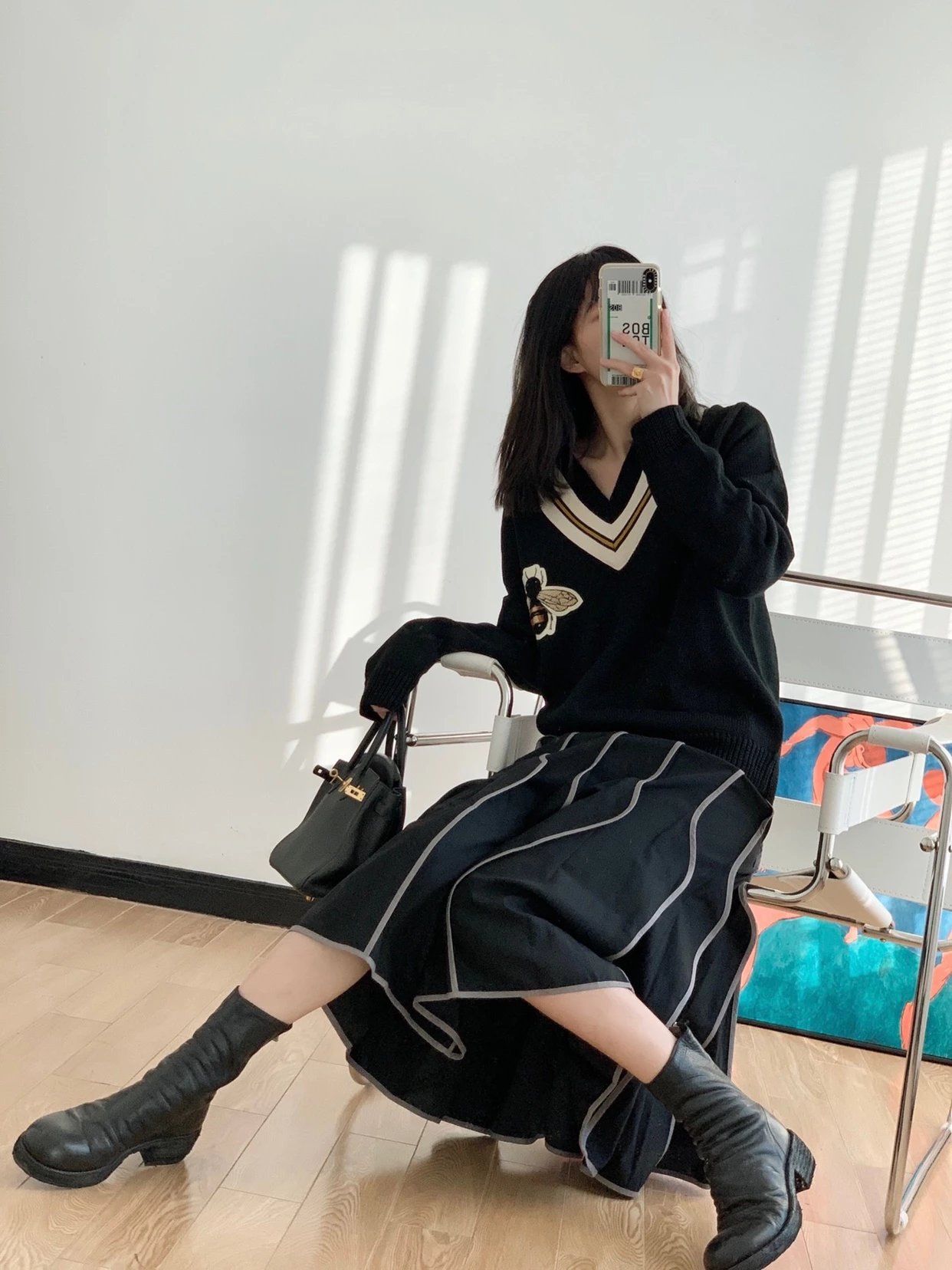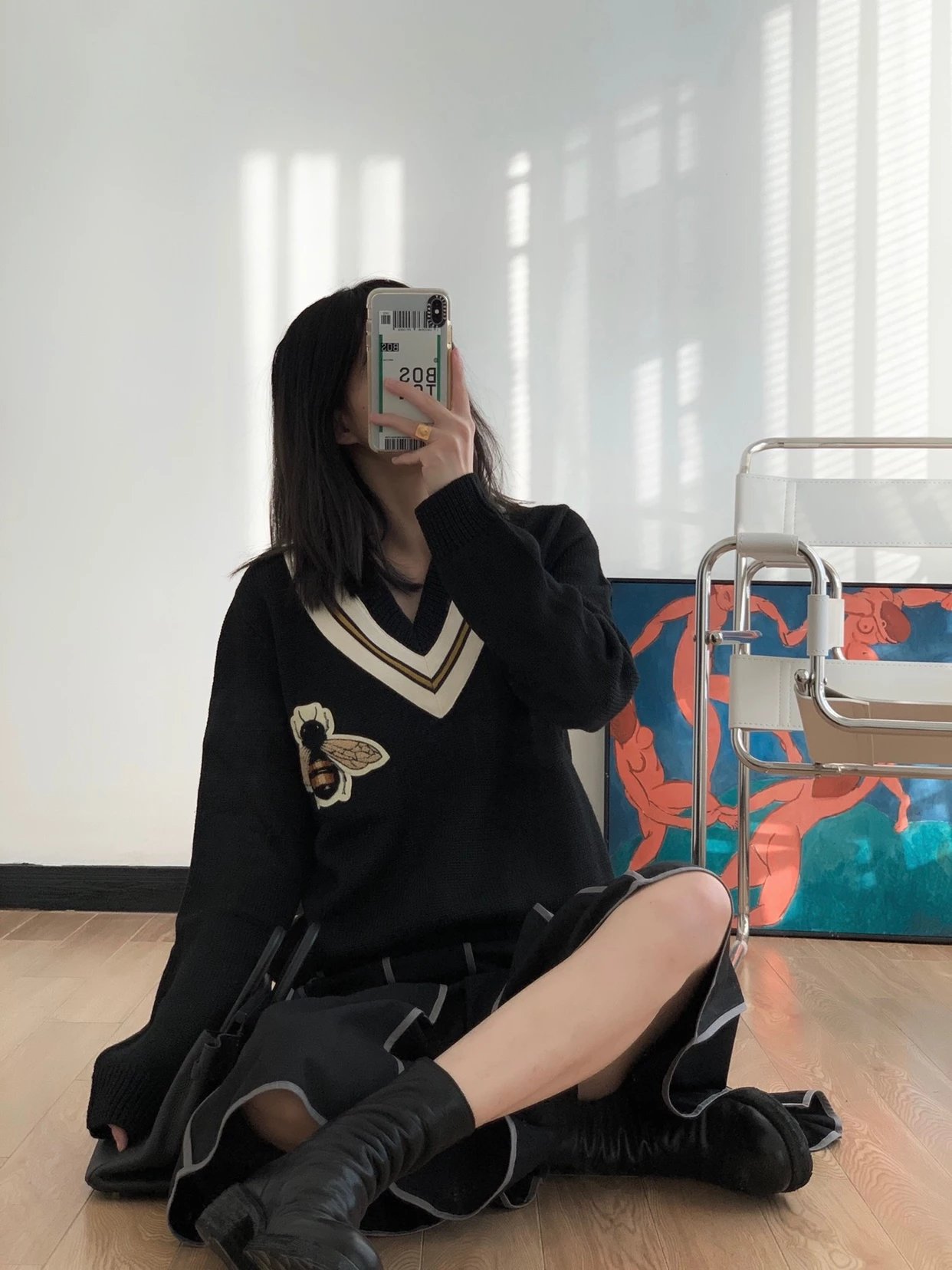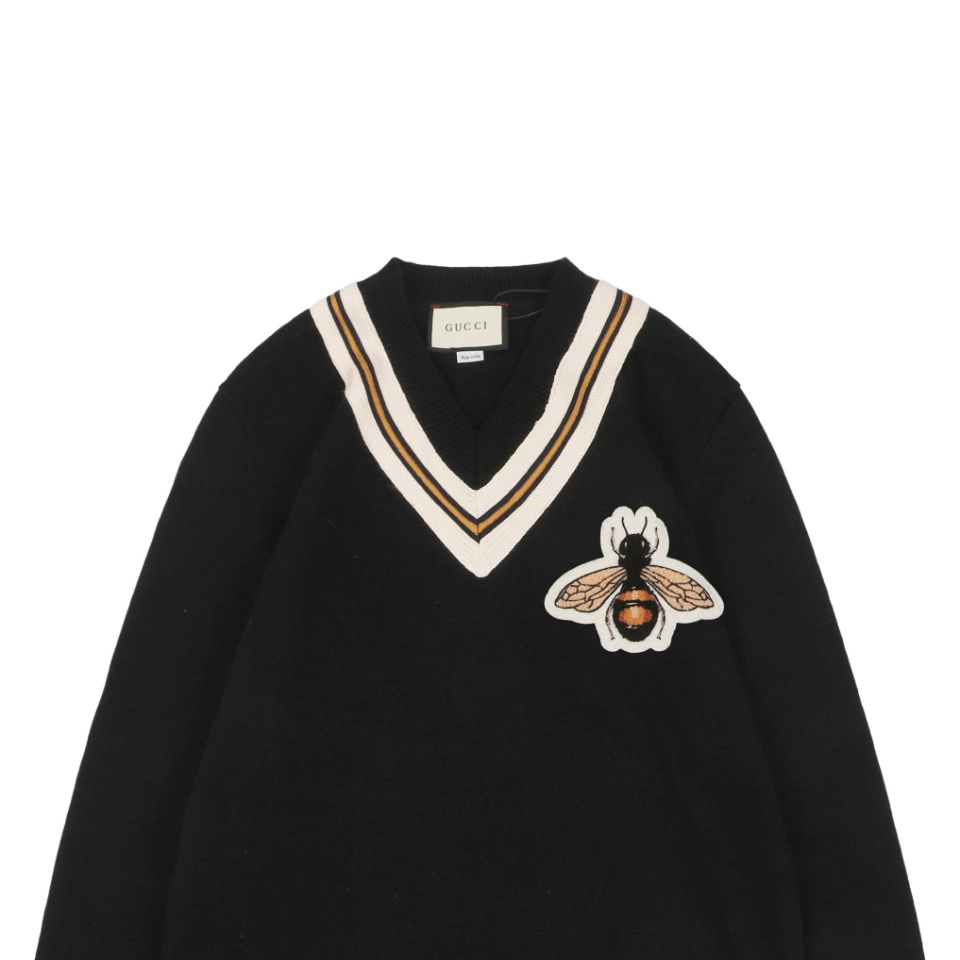 This V-neck sweater is crafted from premium wool or cashmere blend, offering exceptional softness, warmth, and breathability. The classic V-neckline is accentuated by a delicate embroidered bee motif on the chest, embodying signature vintage luxury aesthetic. Available in a slim or relaxed fit, the silhouette enhances layering potential and adds depth to any outfit. Ribbed cuffs and hem ensure a snug and comfortable fit, making it ideal for both casual and business-casual occasions. Whether worn alone or layered over a shirt or blazer, this sweater effortlessly showcases refined yet contemporary style.