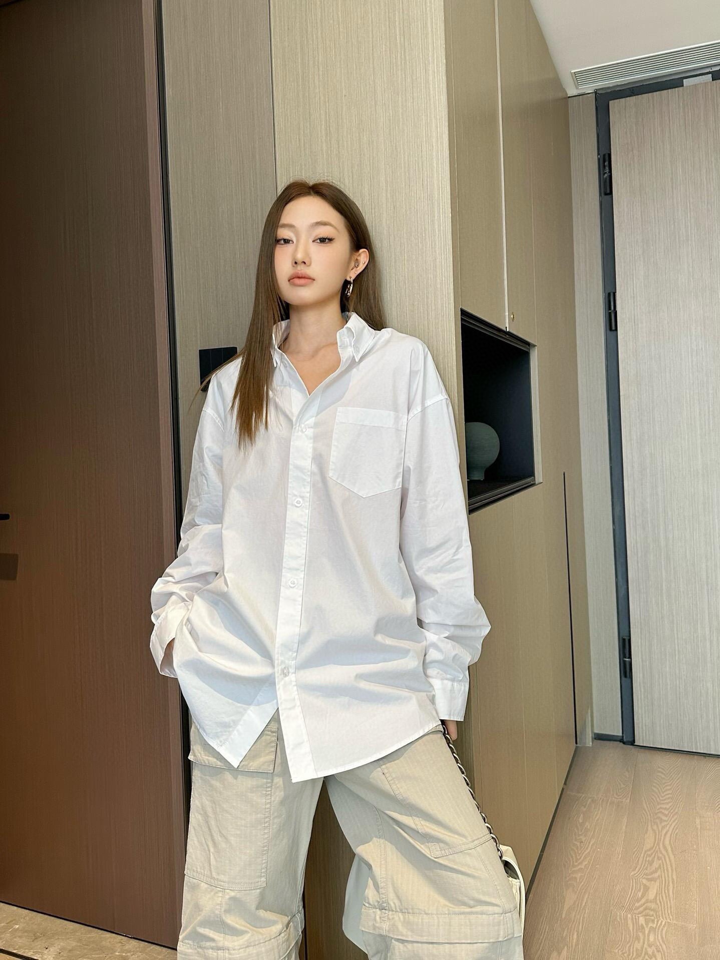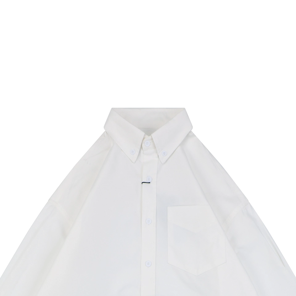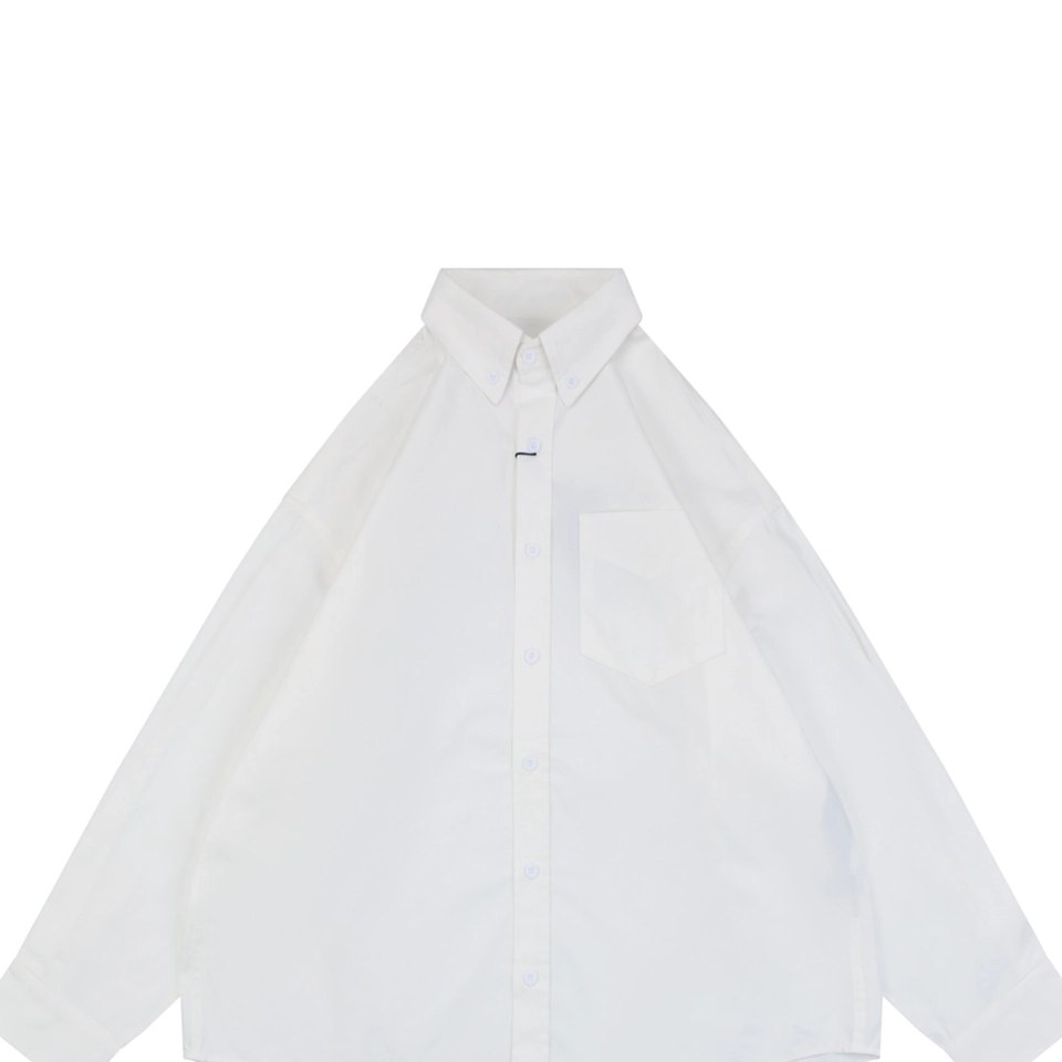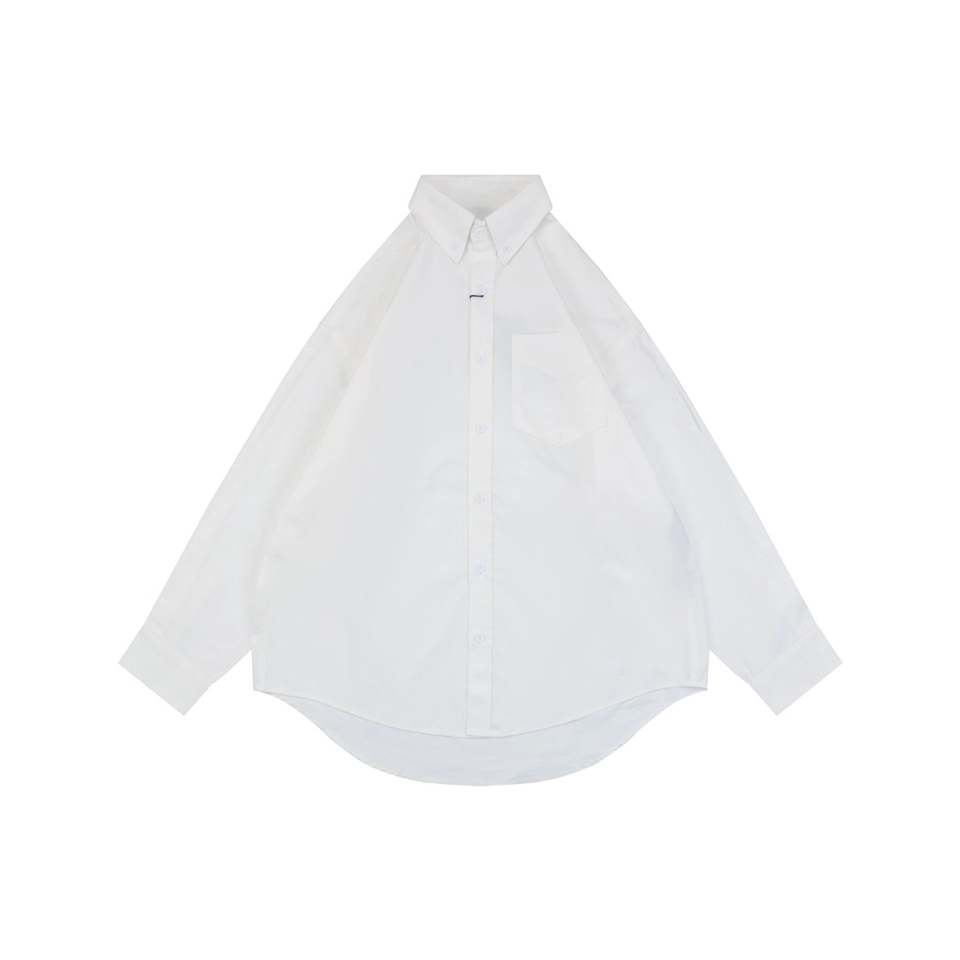 Featuring a classic button-down collar, chest pocket, and relaxed oversized cut, the shirt balances minimalism with statement branding. The slightly curved hem enhances layering possibilities, making it easy to pair with jeans, tailored trousers, or streetwear staples.