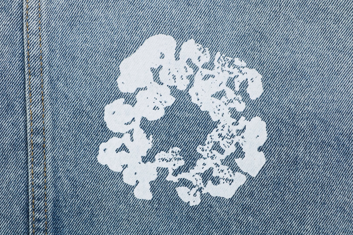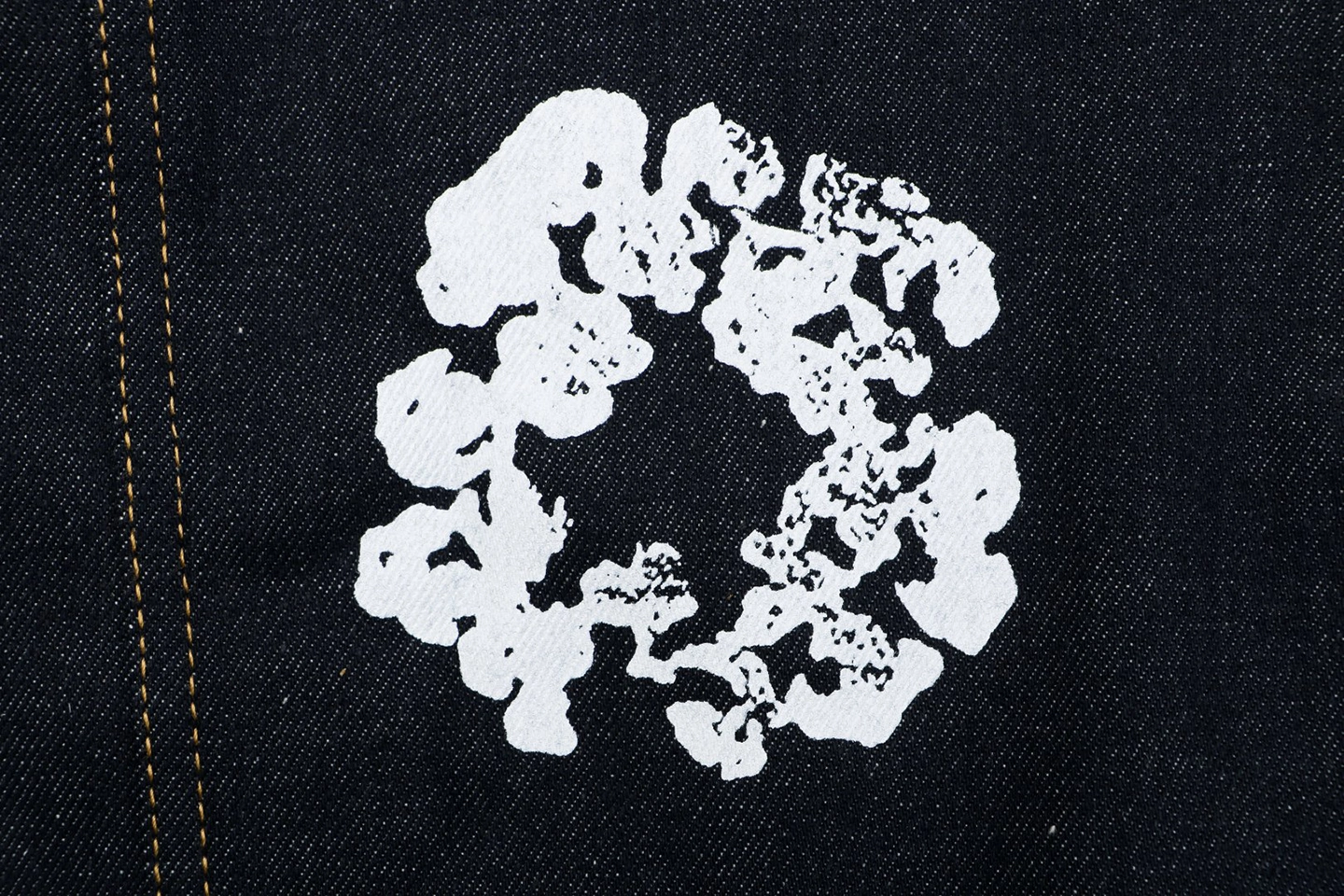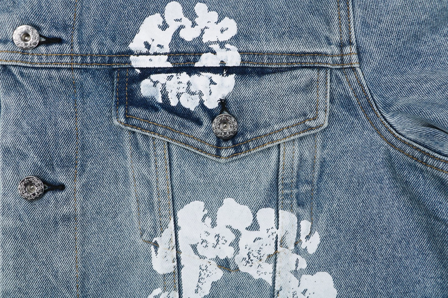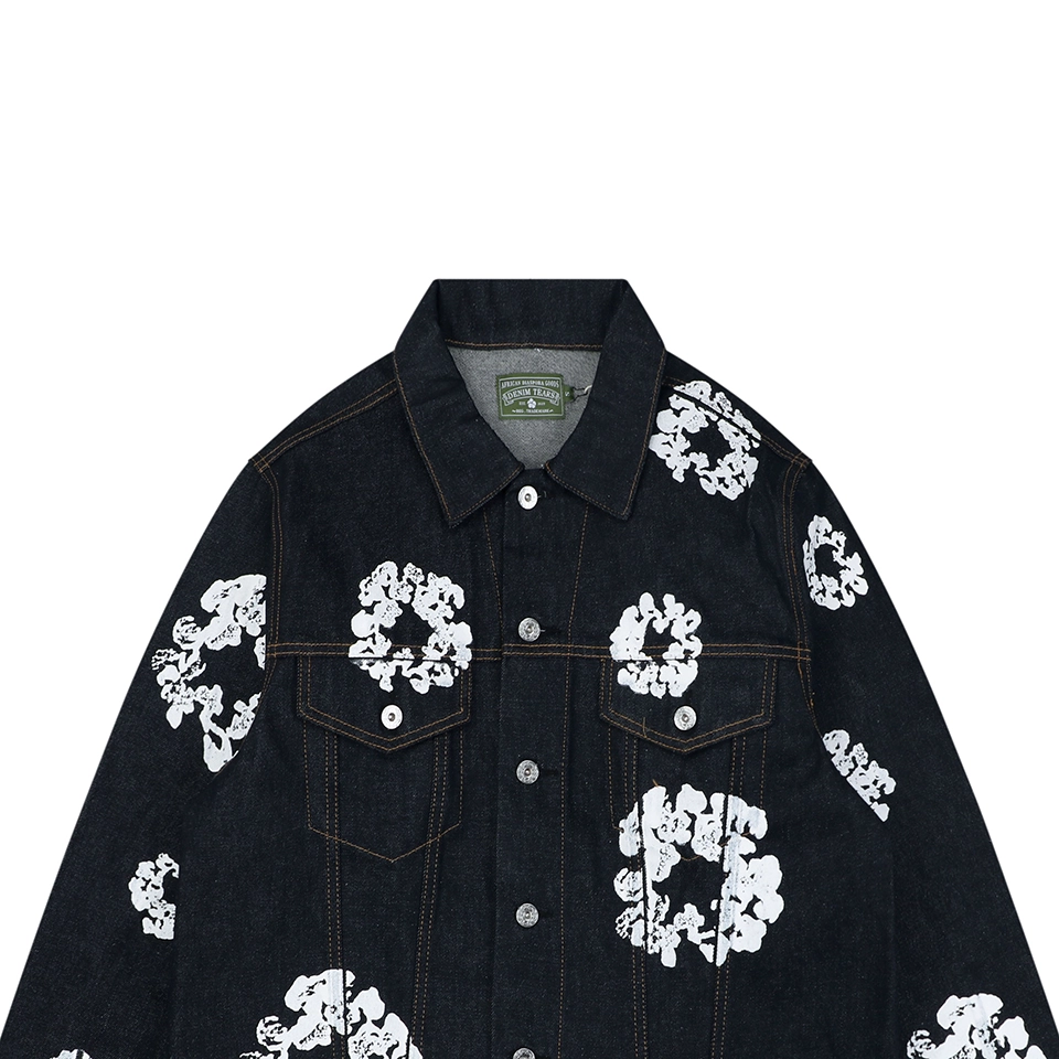 The jacket is highlighted by the signature cotton wreath graphics, applied through precise garment-position printing and finished with multiple washing processes to create a naturally worn vintage look. The print subtly blends with the denim’s texture, enhancing the retro aesthetic.