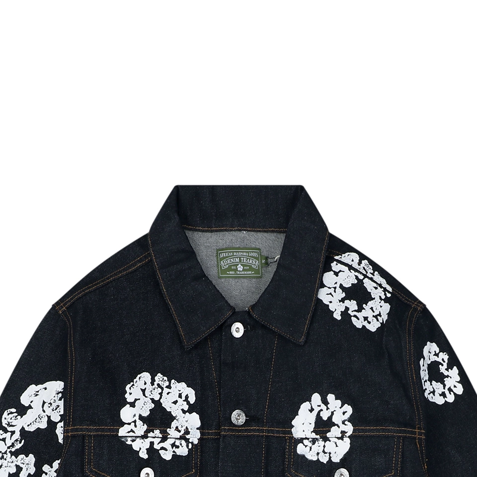 The Denim Tears Cotton Wreath Selvedge Denim Jacket blends heritage denim craftsmanship with the brand’s iconic cultural symbolism. Made from premium custom-woven selvedge denim, the fabric features a dense structure, clear texture, and durability close to the original standard. Designed to age beautifully, the denim develops unique fading and creases over time, making each jacket a personal piece that evolves with wear.