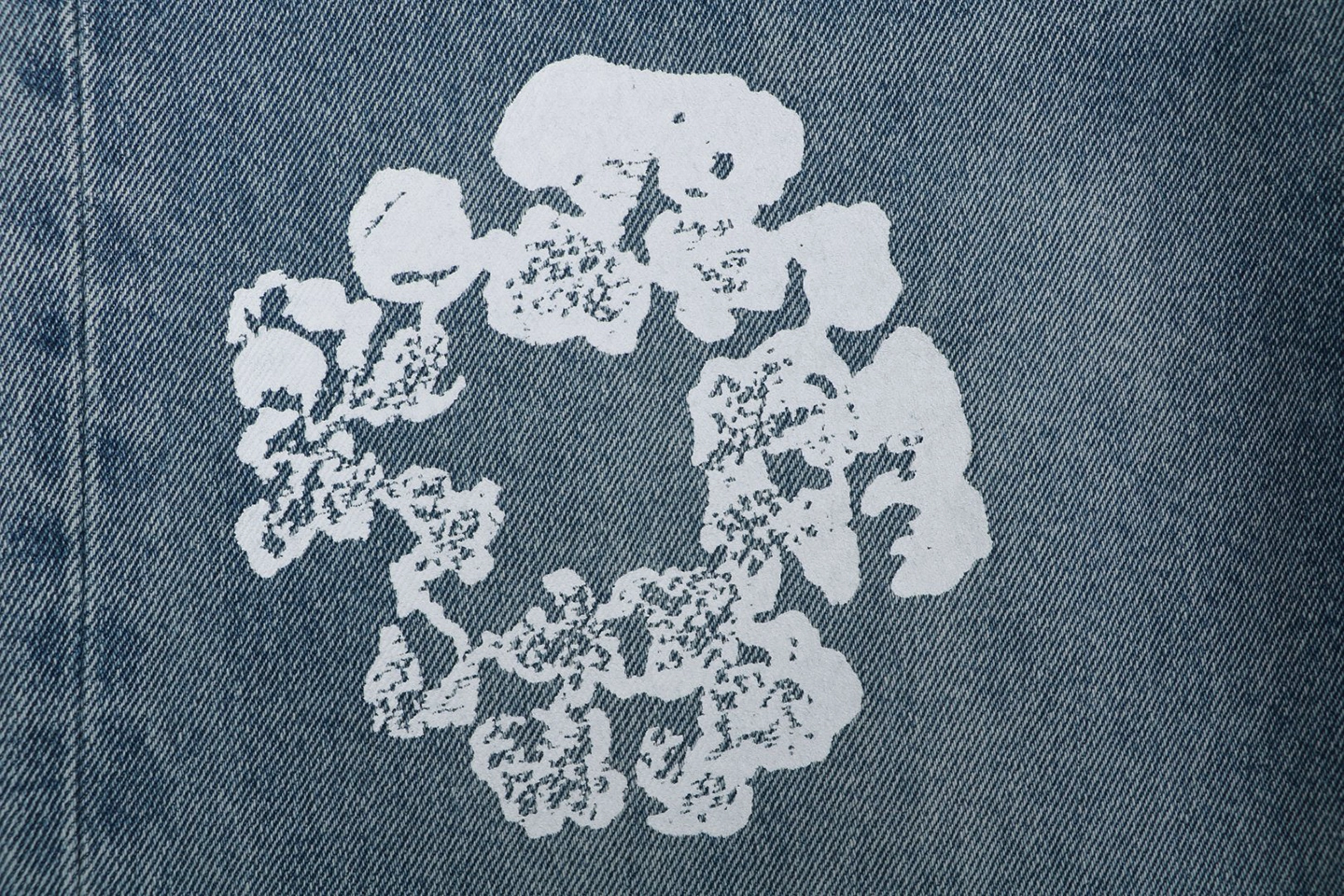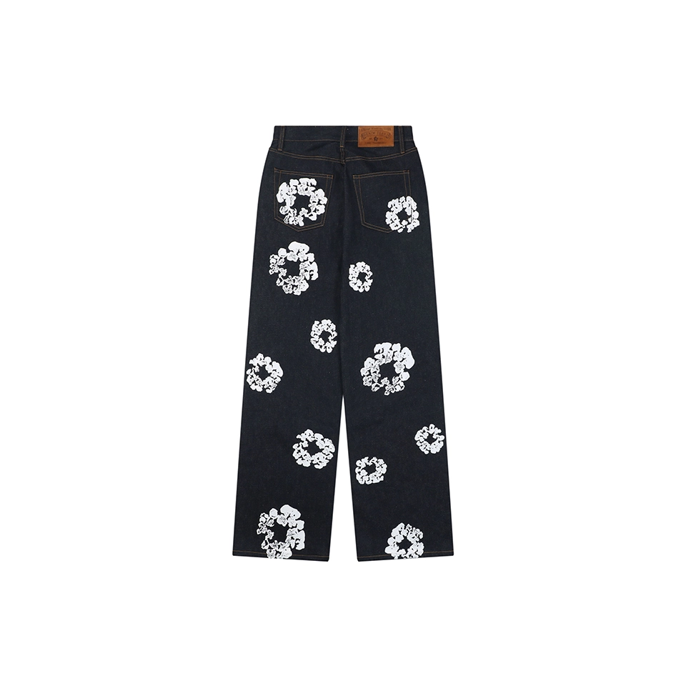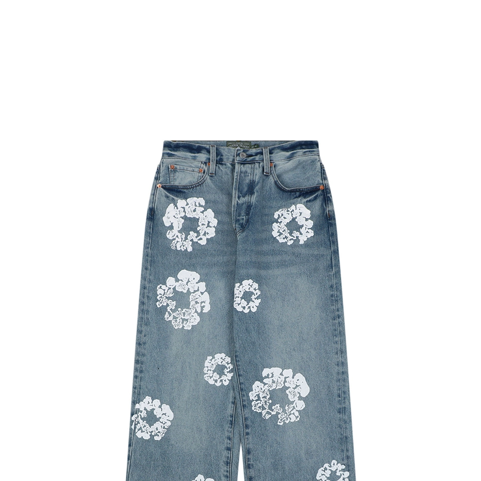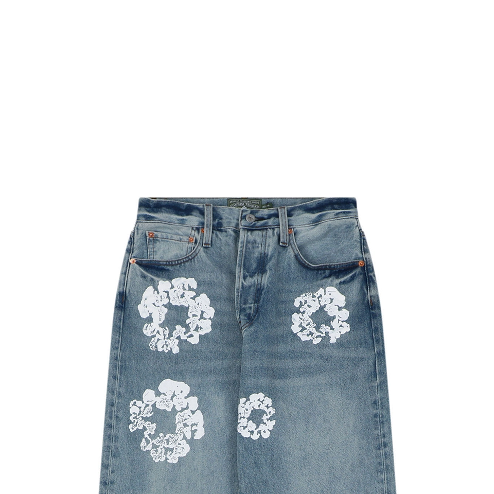 The jeans are highlighted by the signature cotton wreath graphics, applied through precise garment-position printing and enhanced with multiple wash treatments to create a subtle vintage worn effect. The print integrates naturally with the denim grain, delivering a strong retro aesthetic.